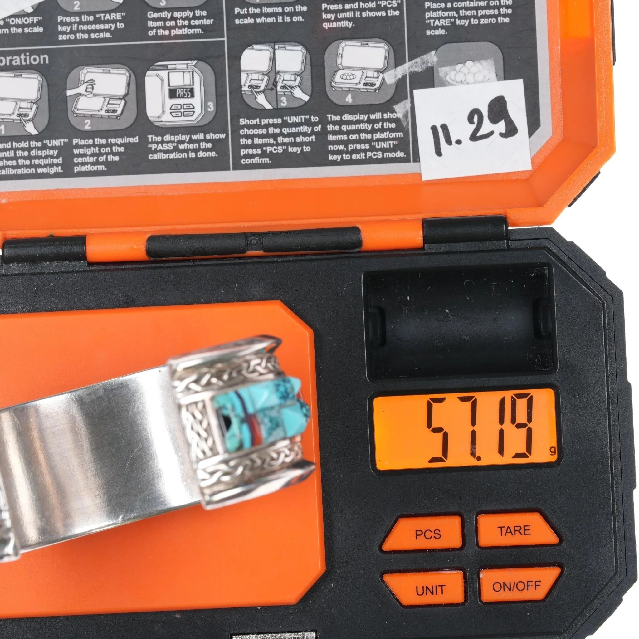 6 1/8" Lloyd Tsalabutie Zuni sterling coral needlepoint turquoise cuff bracelet, solid sterling silver, weight and measurements in pics.