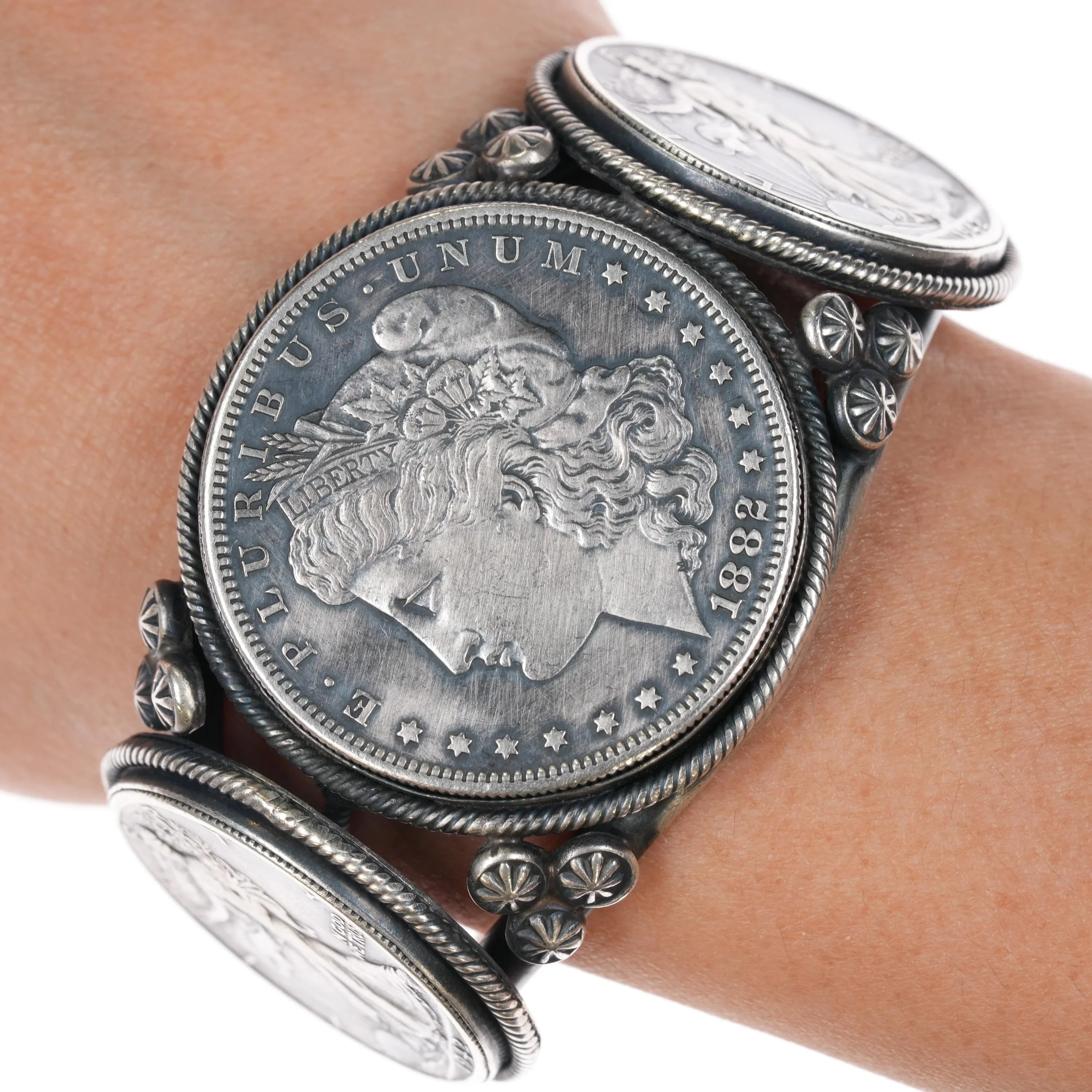 6 1/8" Paul Livingston Navajo sterling US Currency cuff bracelet. Solid sterling, I think these coins might be solid sterling recasts, or he could have polished and oxidized them. Not sure. Solid silver bracelet by well respected Navajo silvermith.