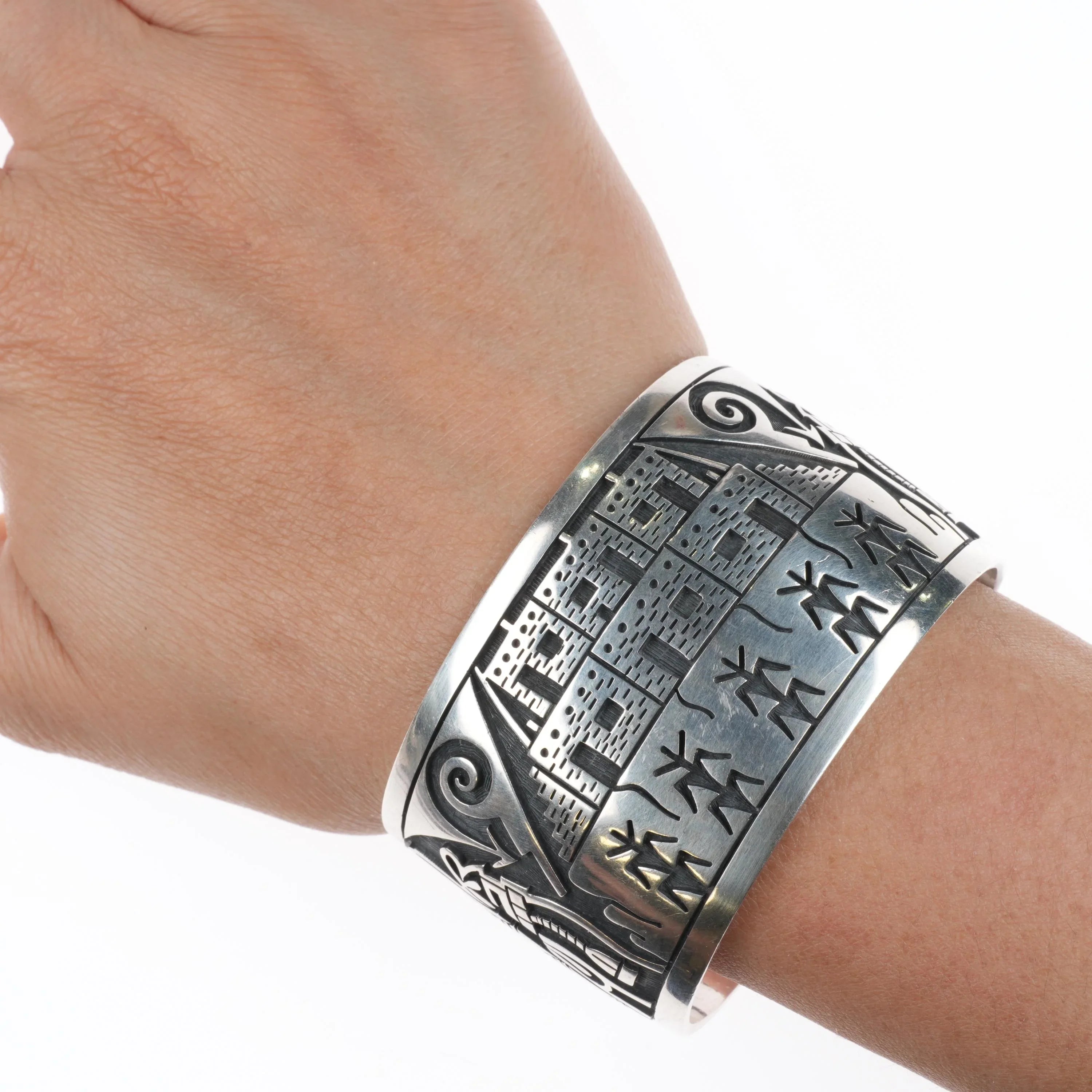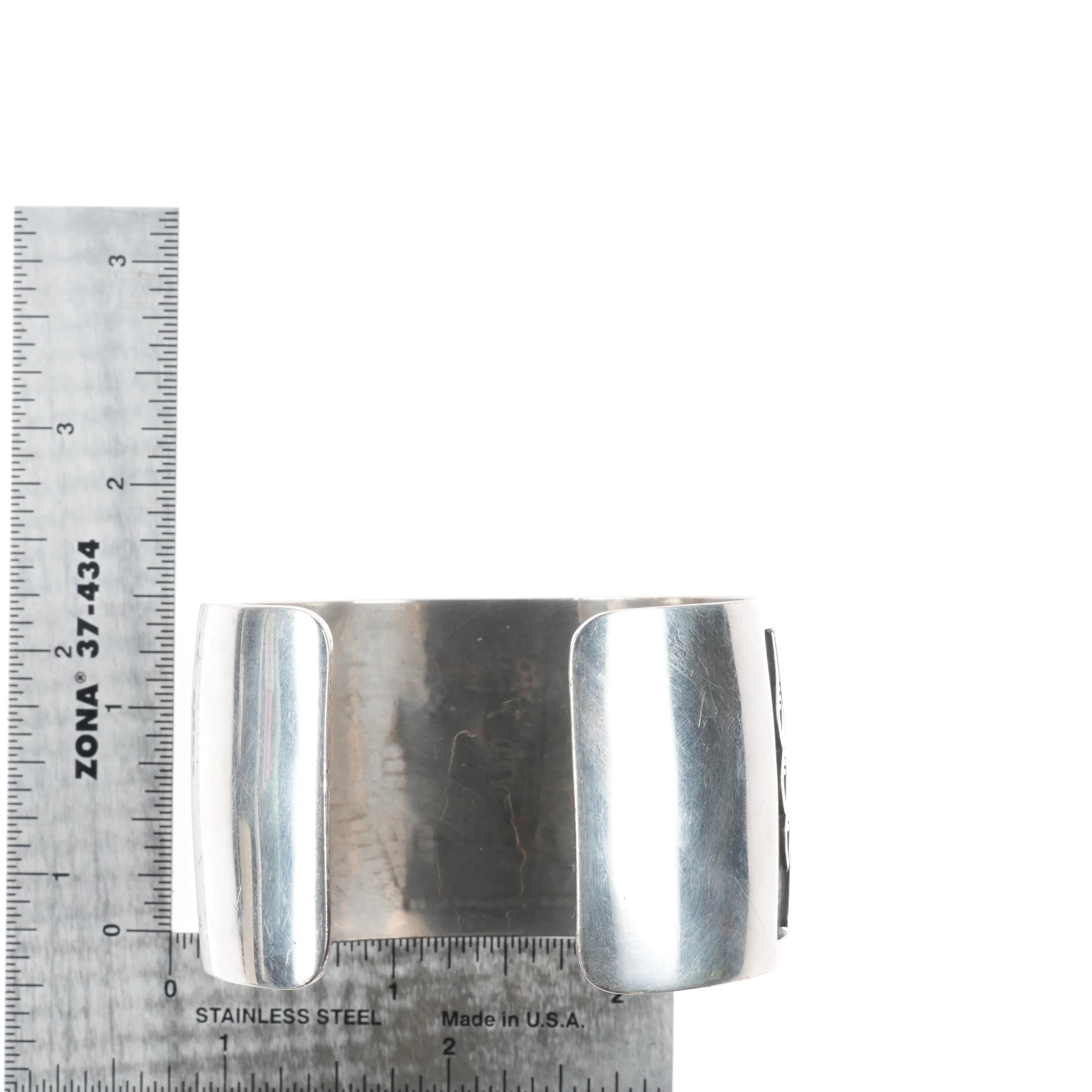 6.25" James Selina Hopi Overlay corn/kachina theme sterling silver cuff bracelet. Tested and guaranteed solid sterling silver with weight and measurements in pictures. Good condition, circa last quarter of the 20th century. This and most of the items from this collection were collected but worn very little if any.