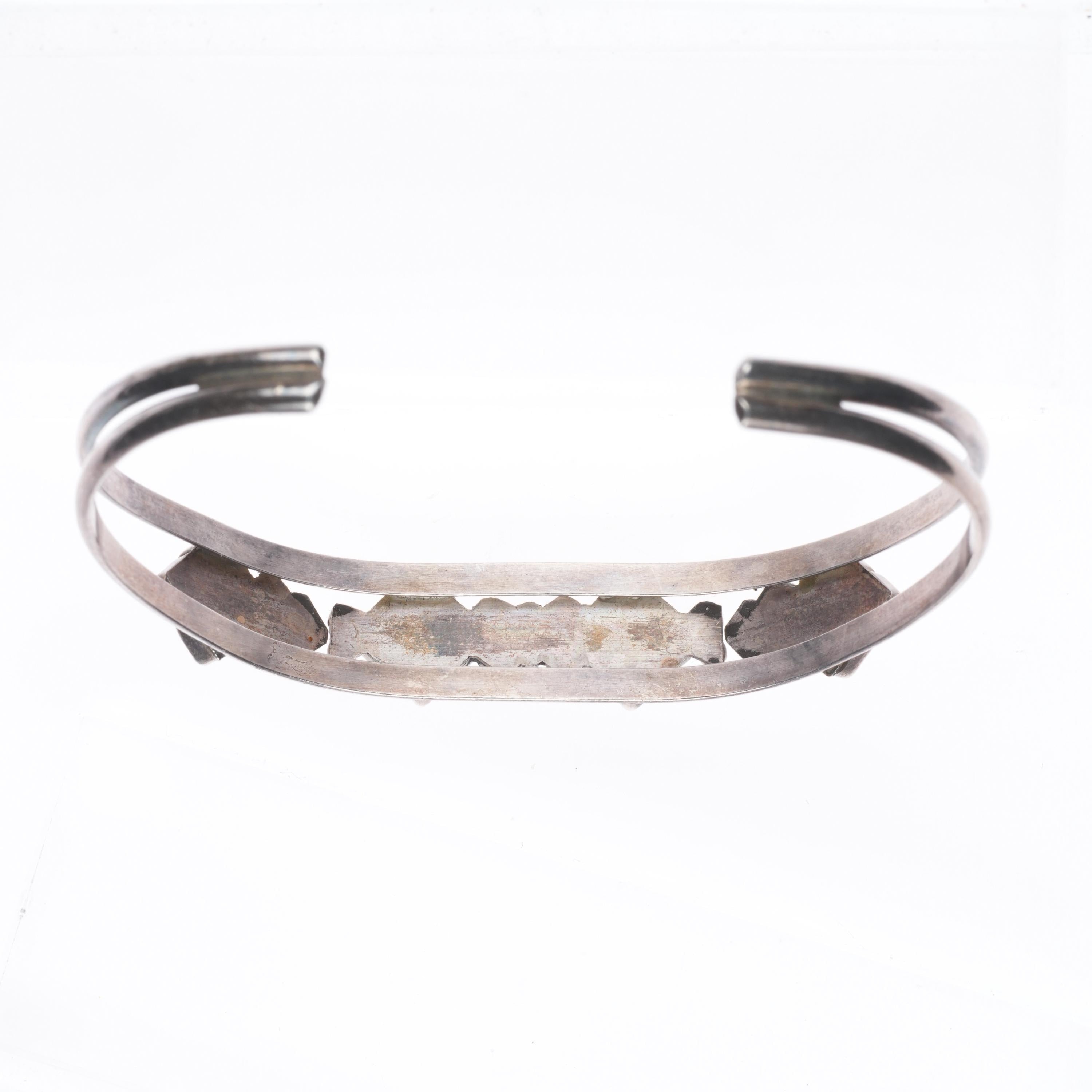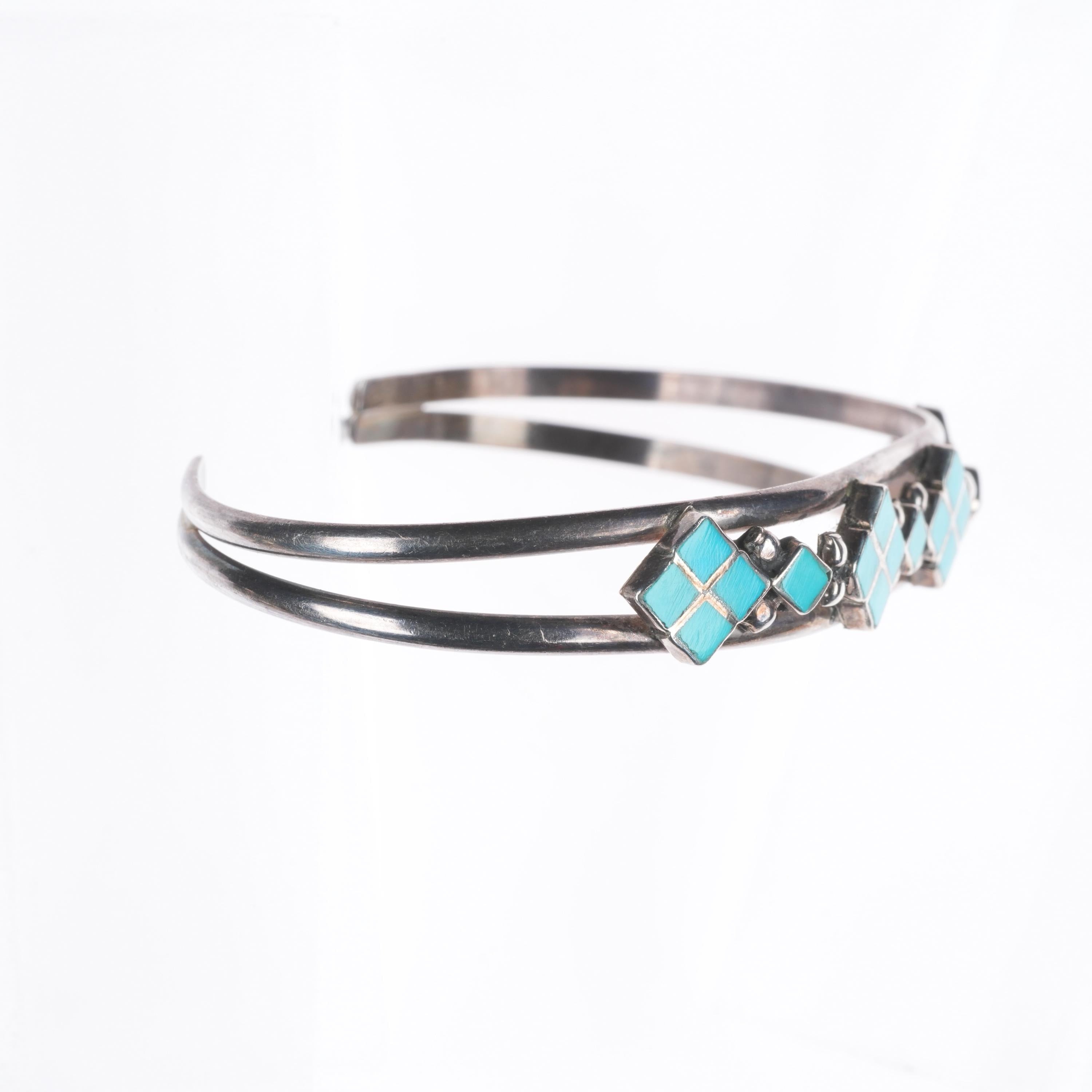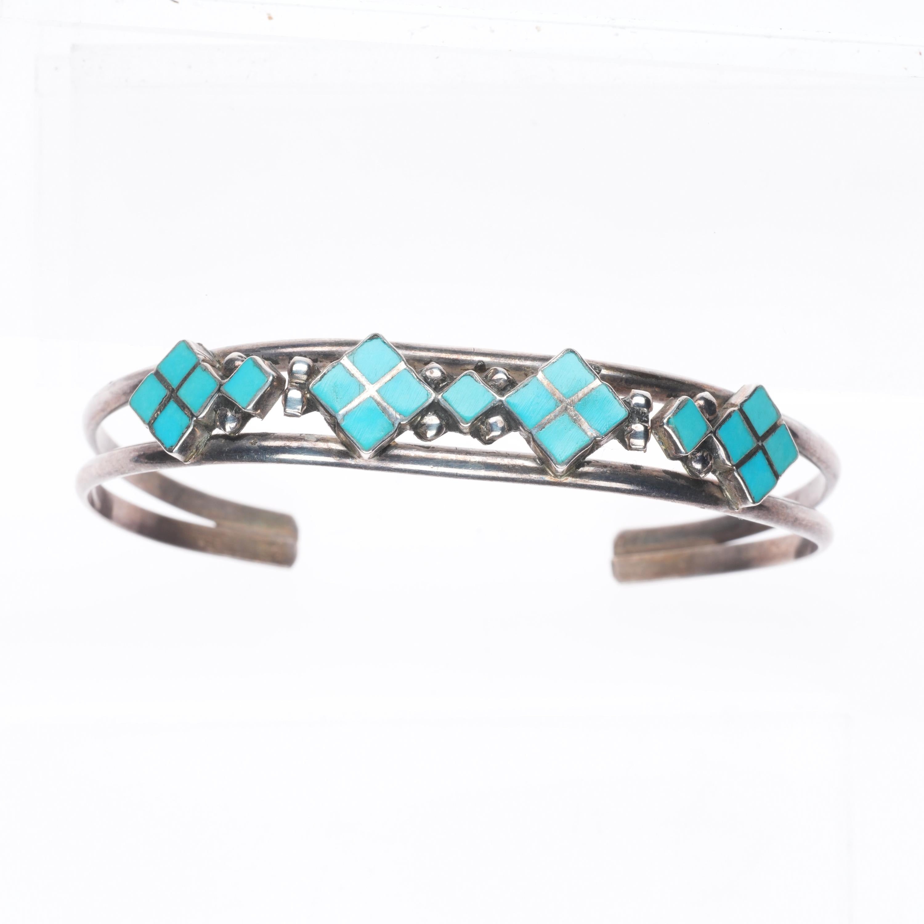 6.25" Vintage Zuni Dishta flush inlay turquoise cuff bracelet sterling silver. Tested and guaranteed solid sterling silver with weight and measurements in pictures. Circa third quarter of the 20th century. Fits up to a 6.25" wrist without adjustment, though .25" or more of careful adjustment is typically very simple. Any adjustment will change the gap size of course which is shown in the pictures. Unmarked (which is common with older Native American jewelry) unless a hallmark is shown in the pictures.