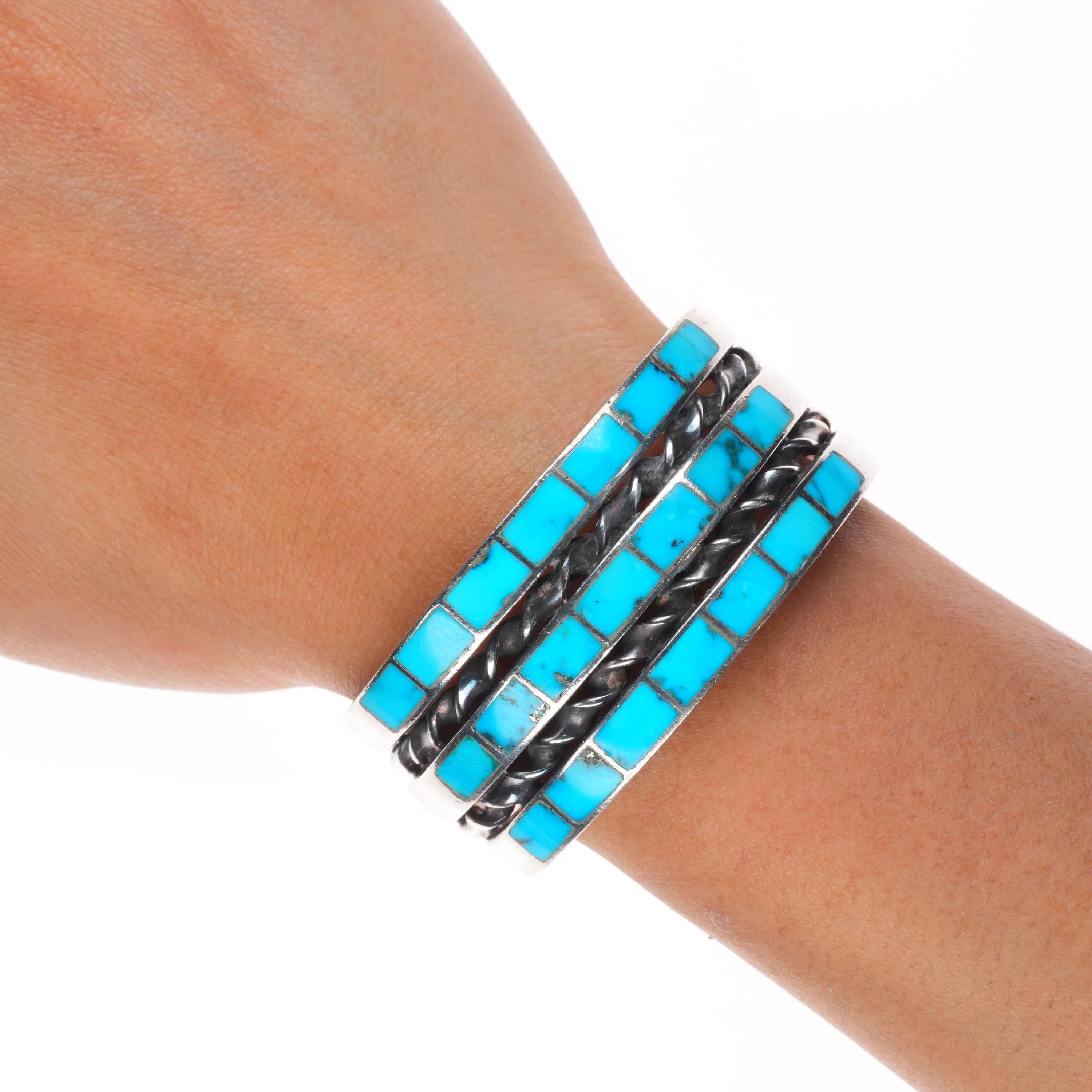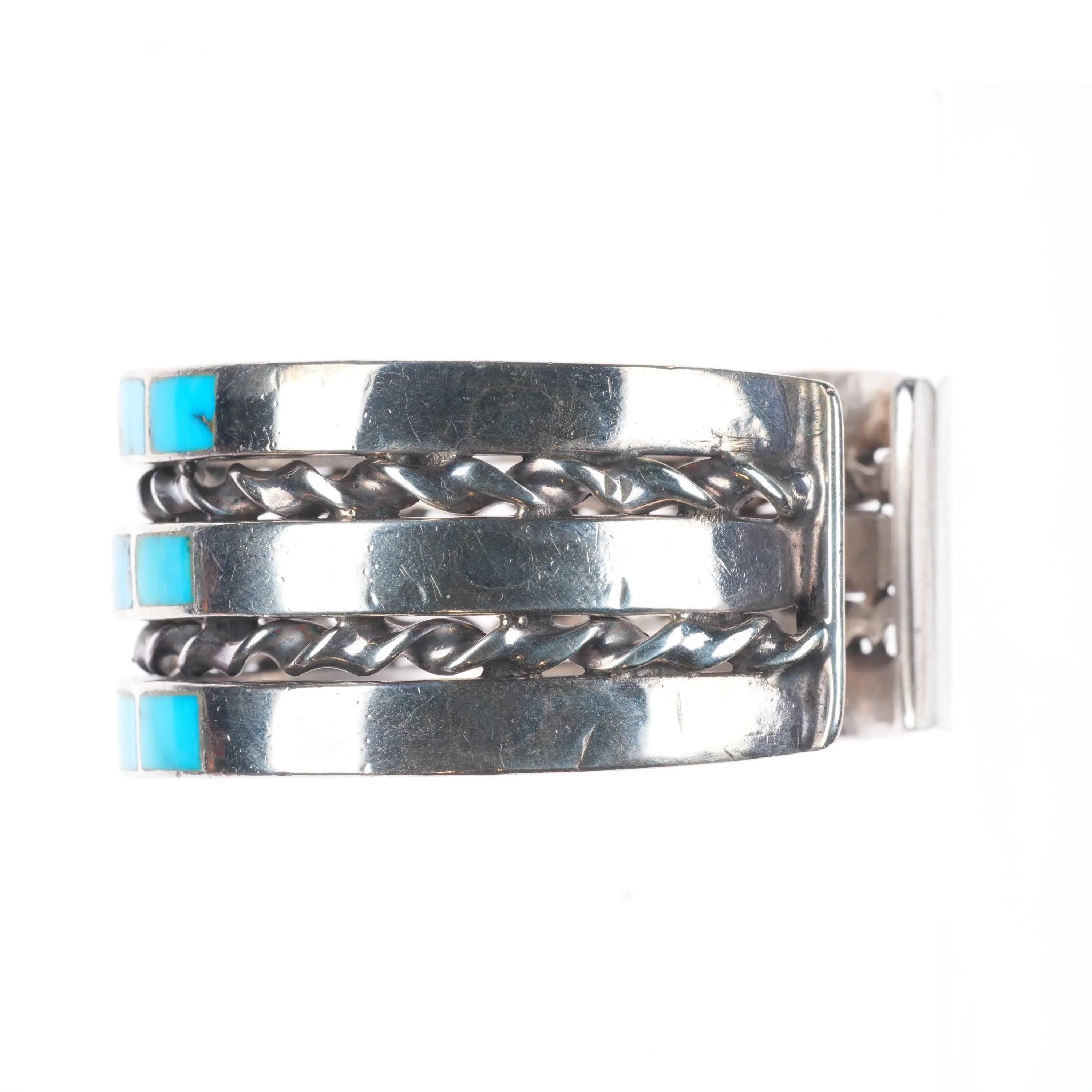 6.25" Vintage Zuni sterling silver 3 row channel inlay turquoise cuff bracelet