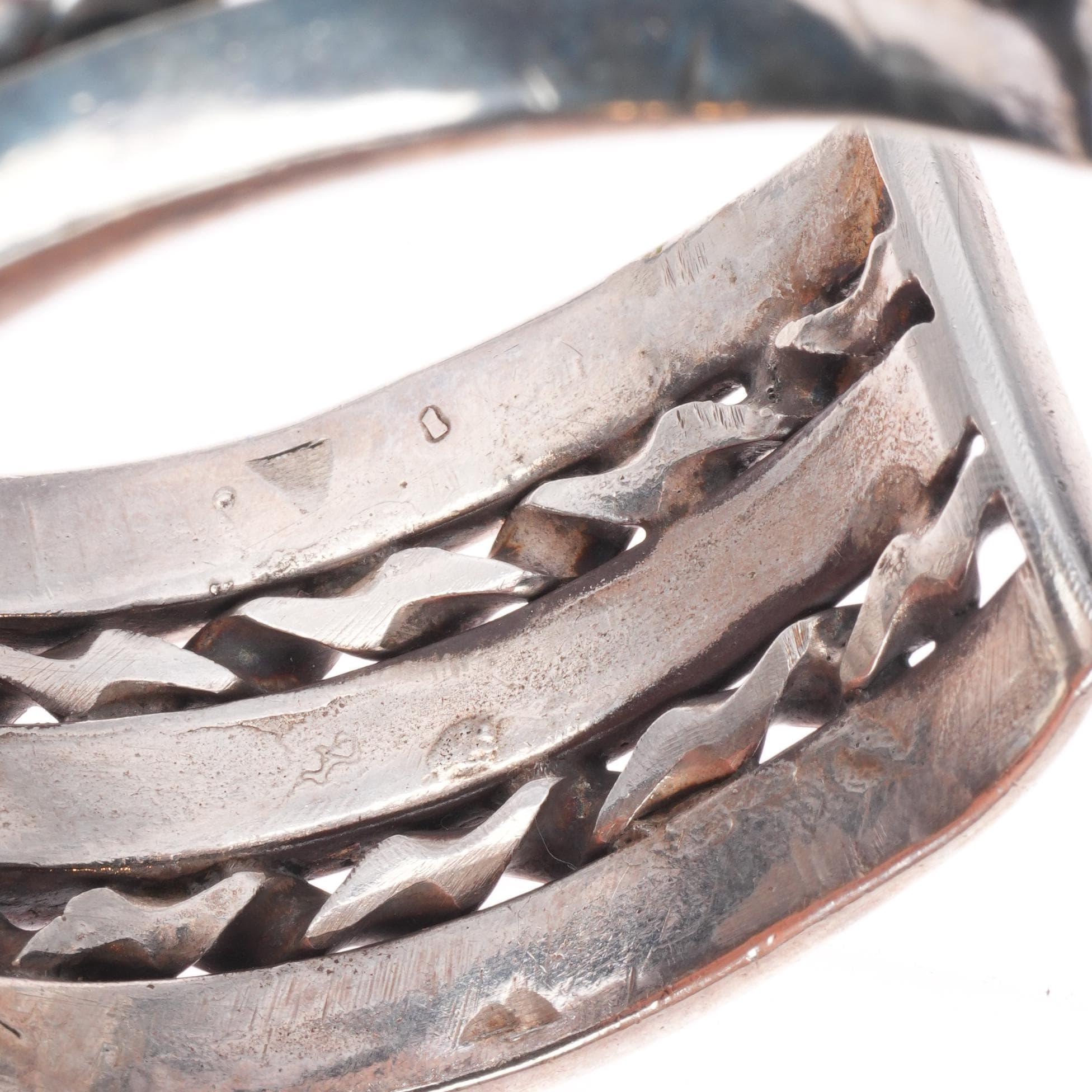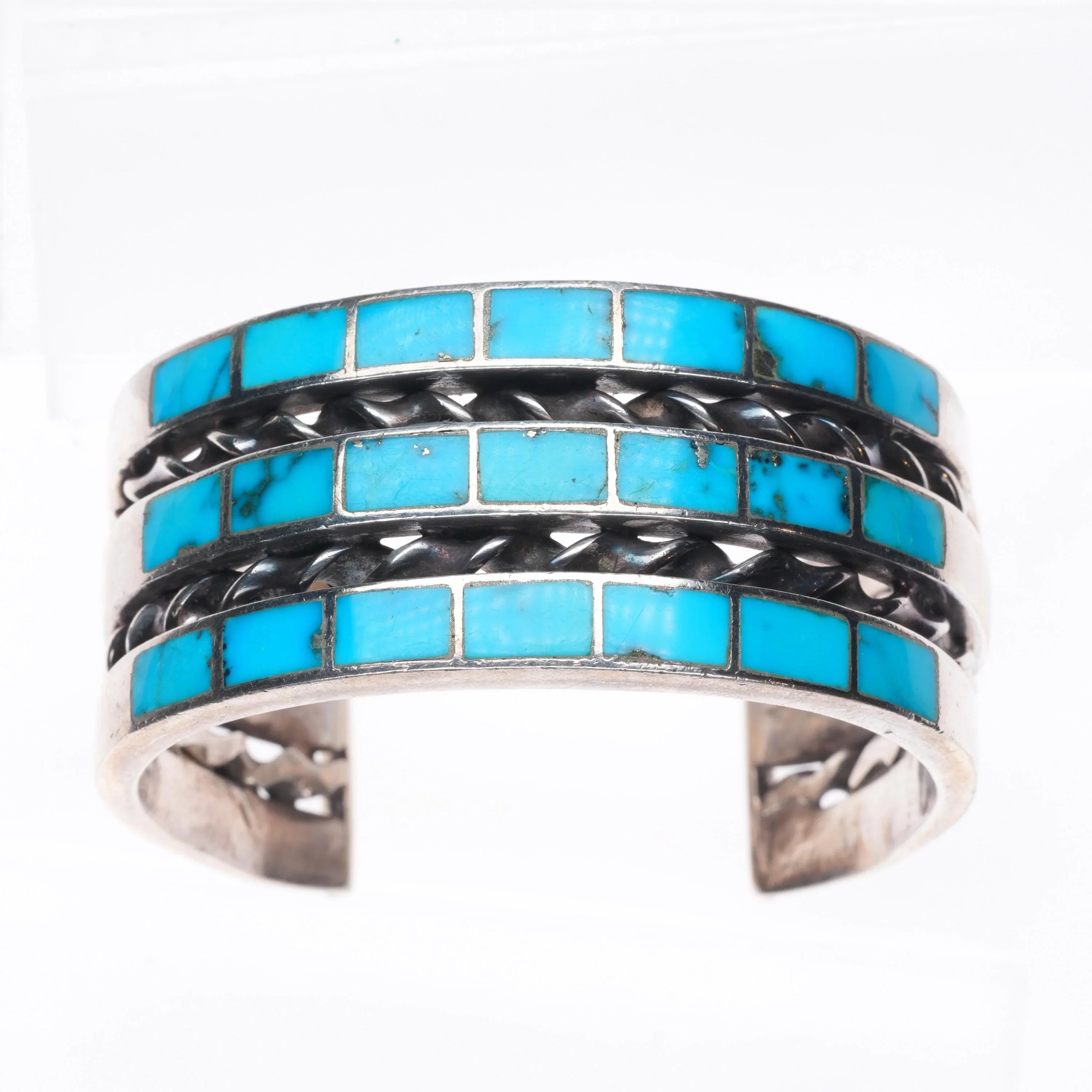 6.25" Vintage Zuni sterling silver 3 row channel inlay turquoise cuff bracelet. Tested and guaranteed solid sterling silver with weight and measurements in pictures. No damage or significant wear, circa third quarter of the 20th century. apparently unmarked.