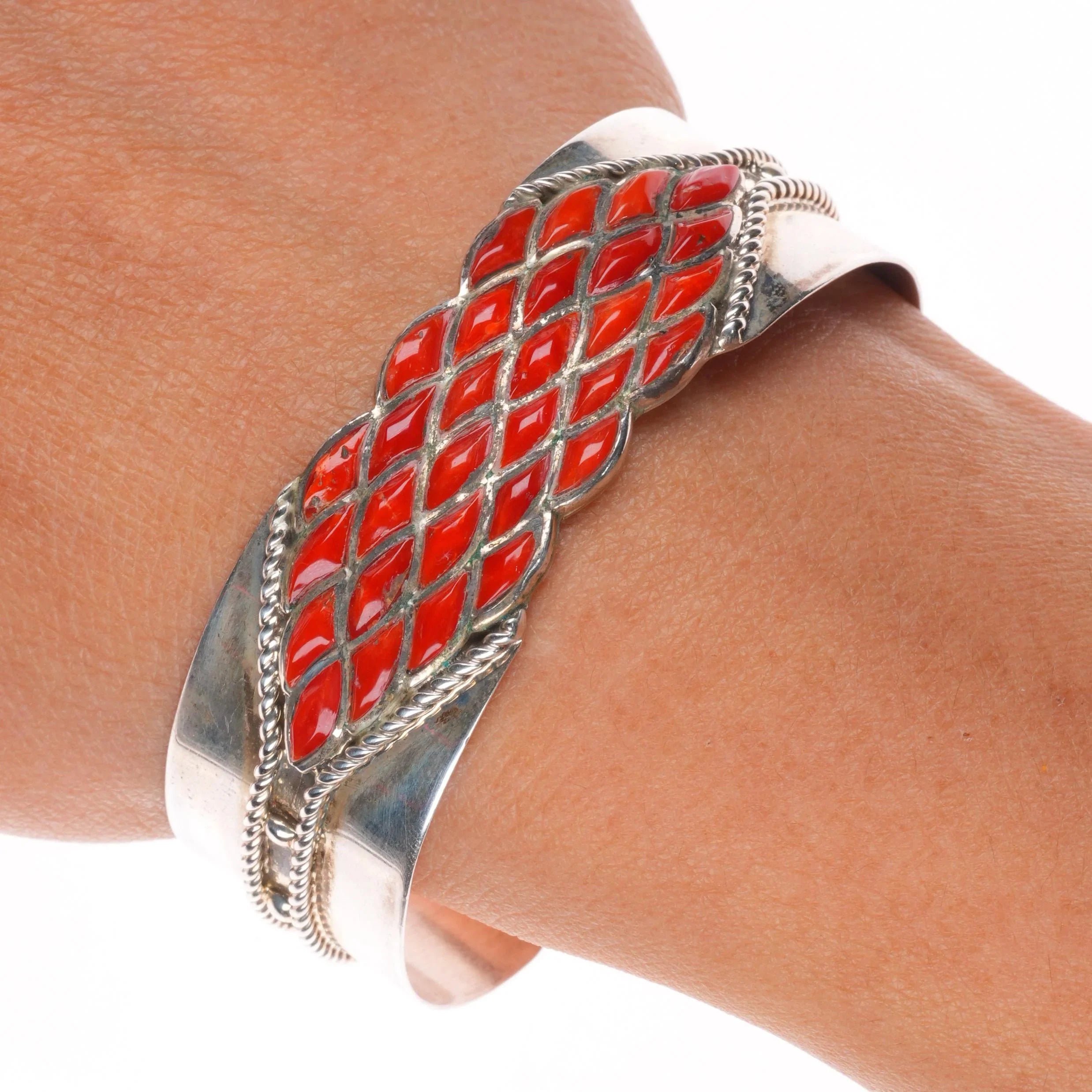 6.3" Derrick-Lorelia Chavez Zuni sterling silver coral raise inlay cuff bracelet