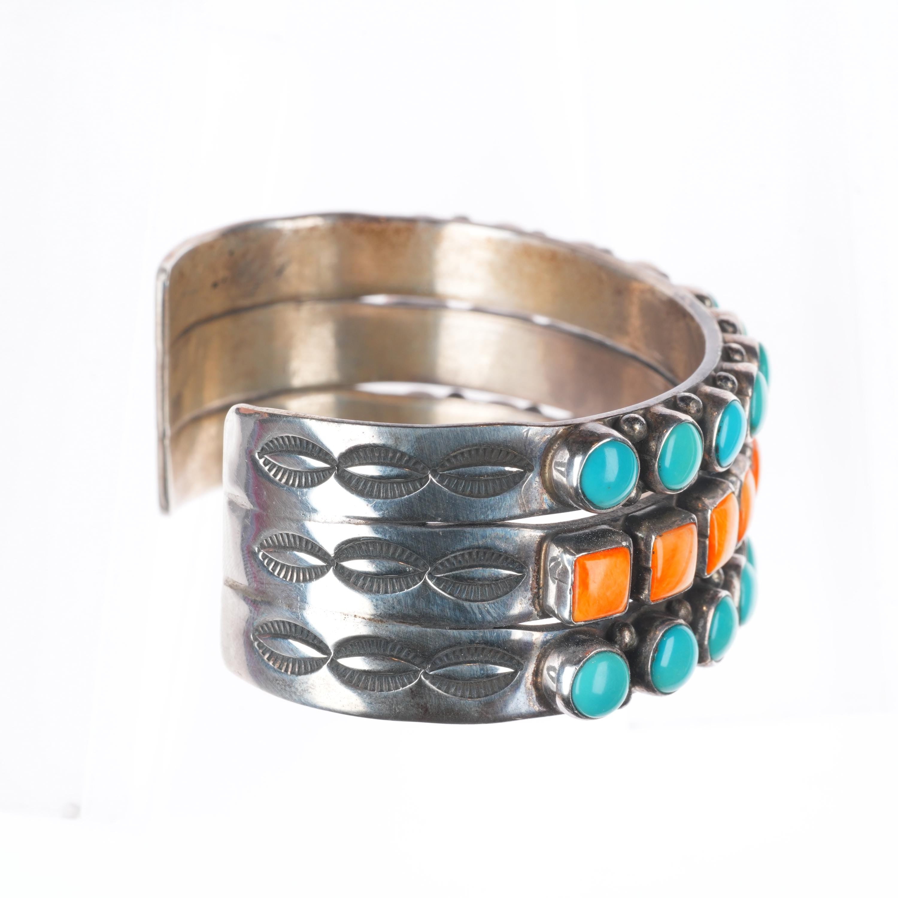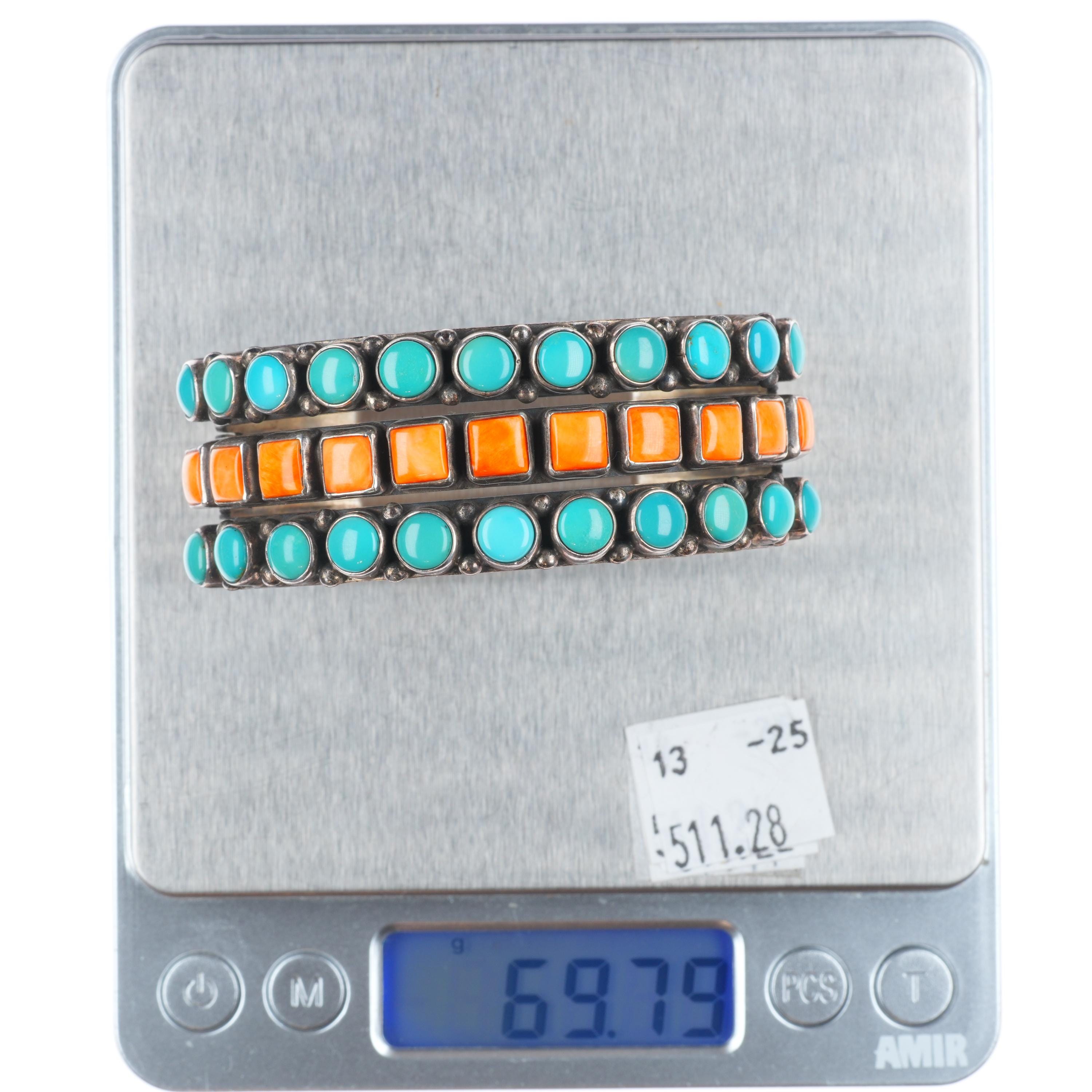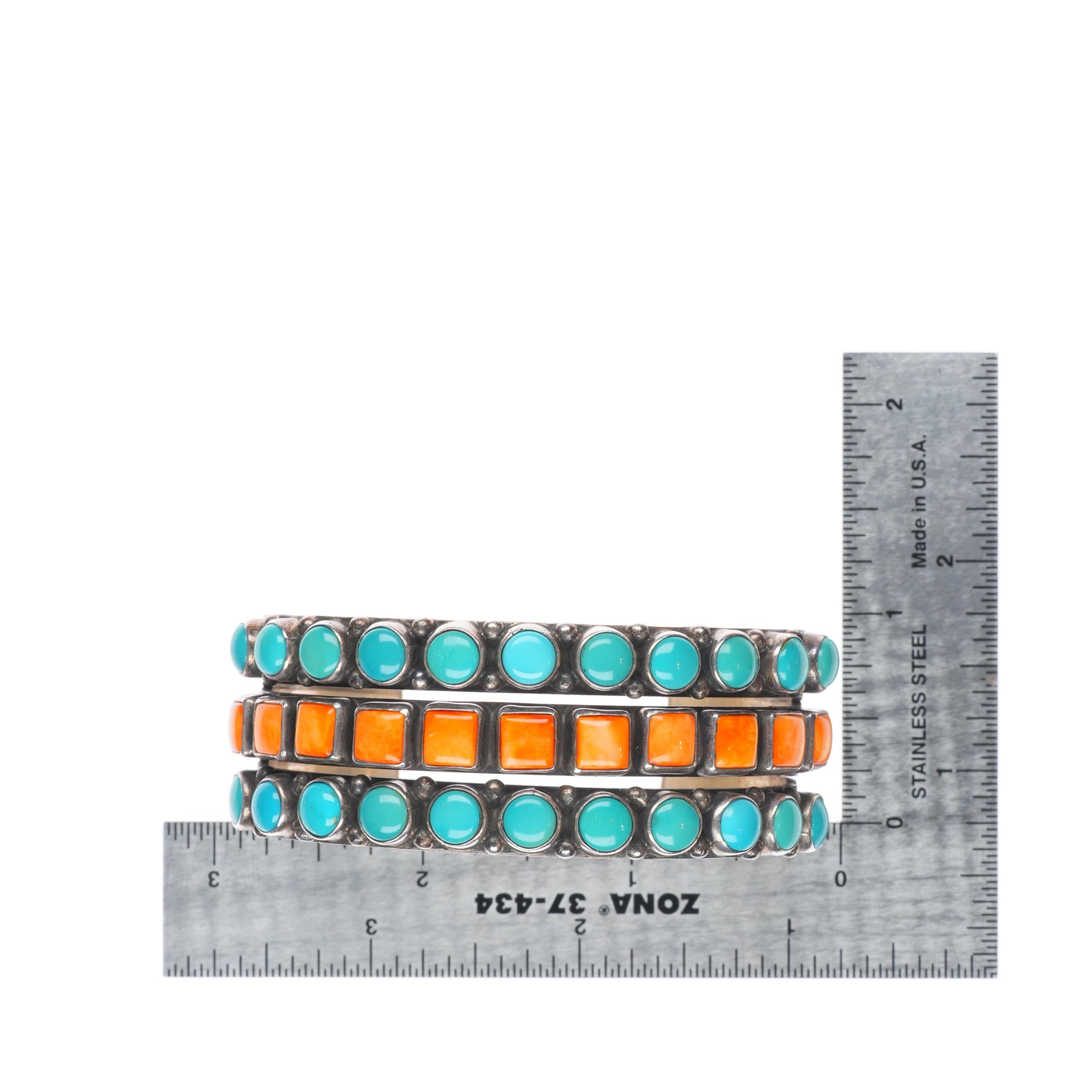 6.4" Alvin Lee Navajo sterling silver, turquoise, spiny oyster row cuff bracelet. Tested and guaranteed solid sterling silver with weight and measurements in pictures. Circa last quarter of the 20th century with some expected age appropriate wear. Alvin Lee, Navajo, is from Shiprock, New Mexico. He is the cousin of Albert Jake.