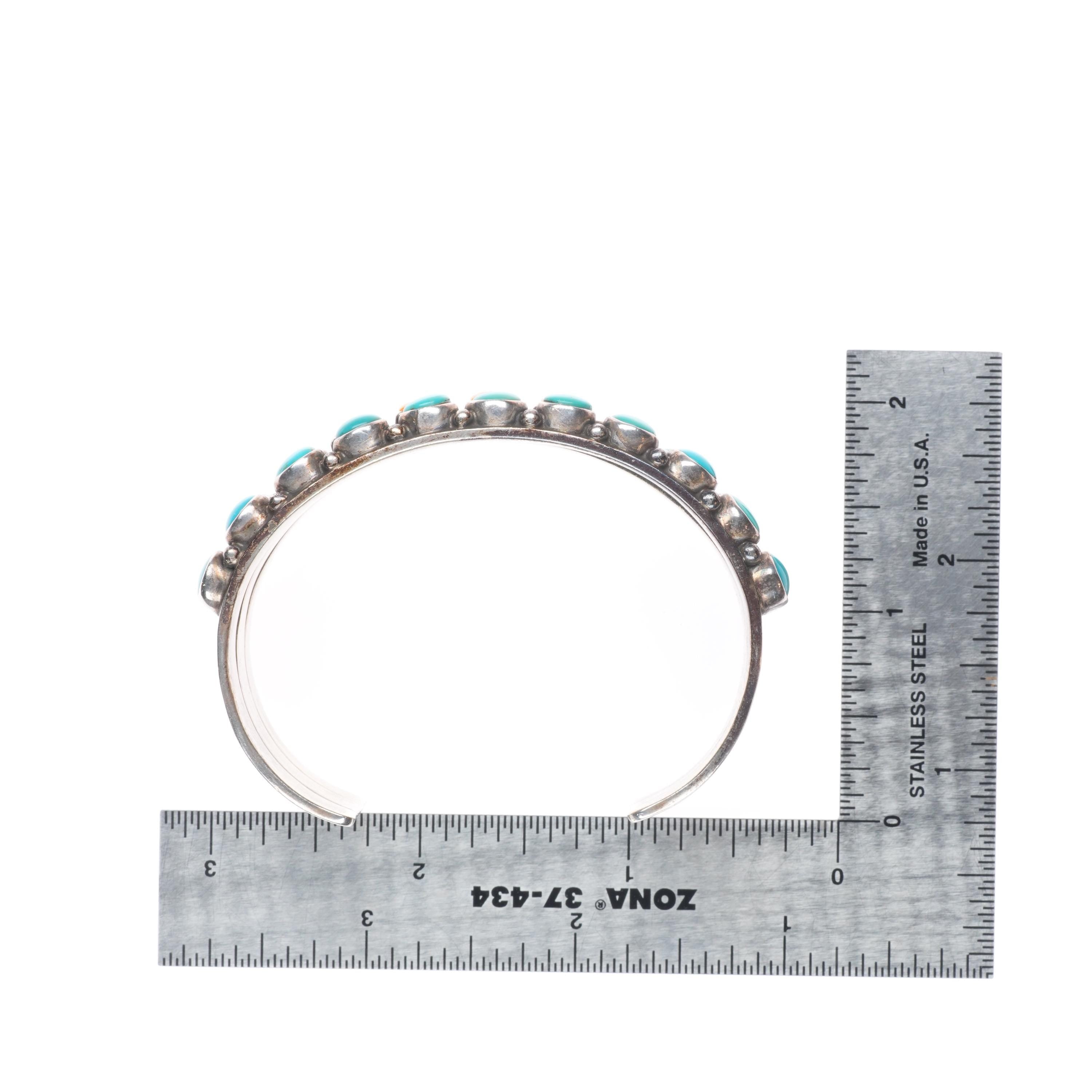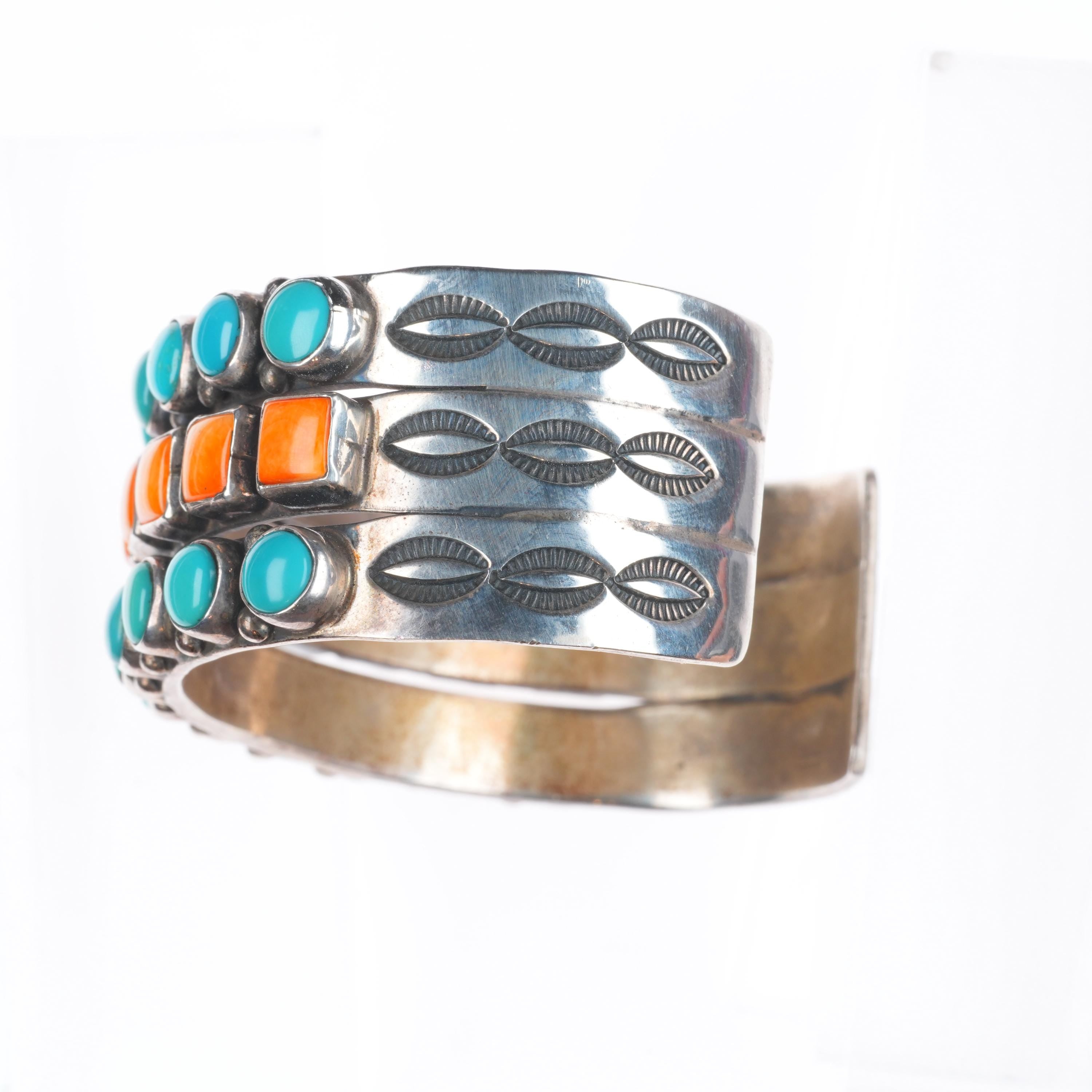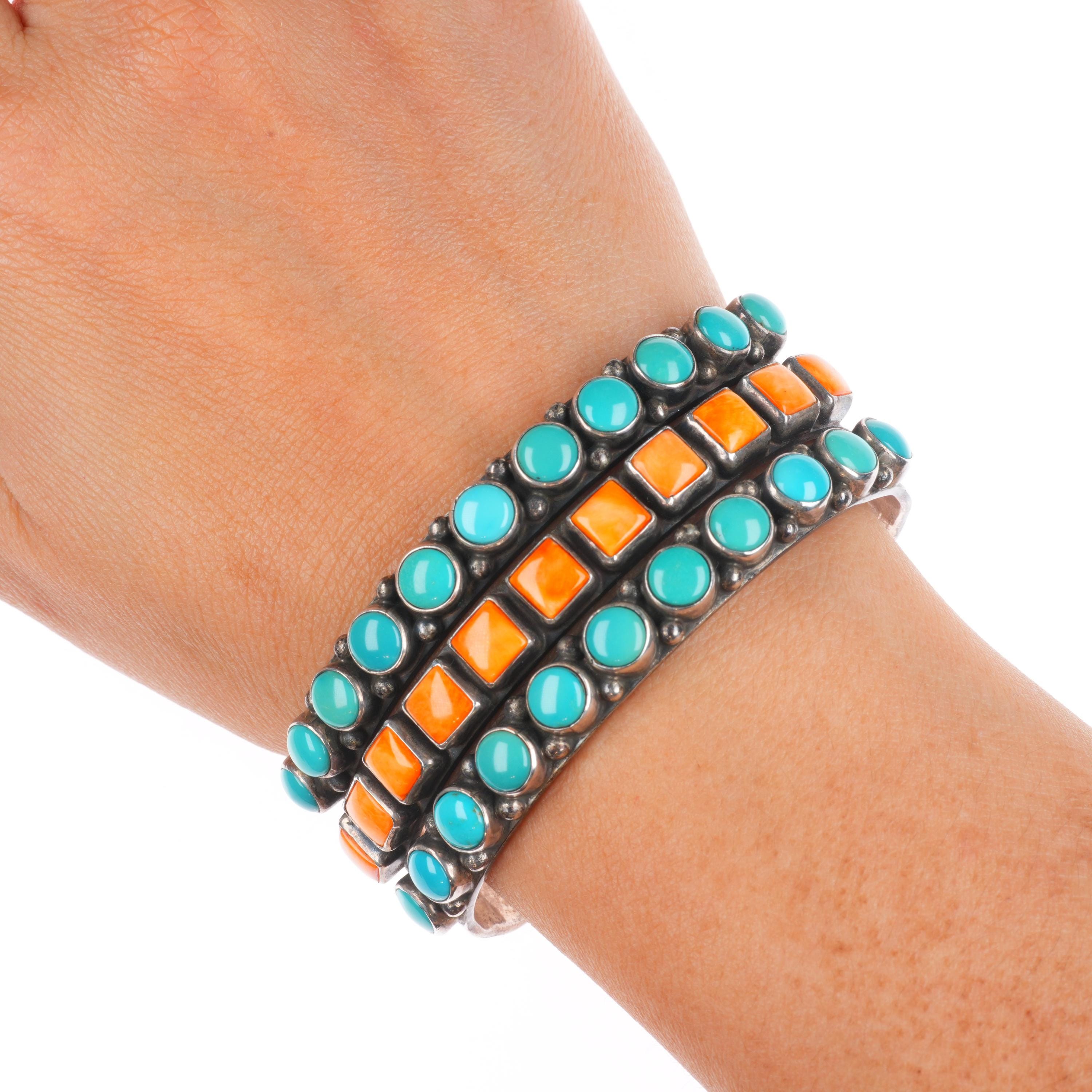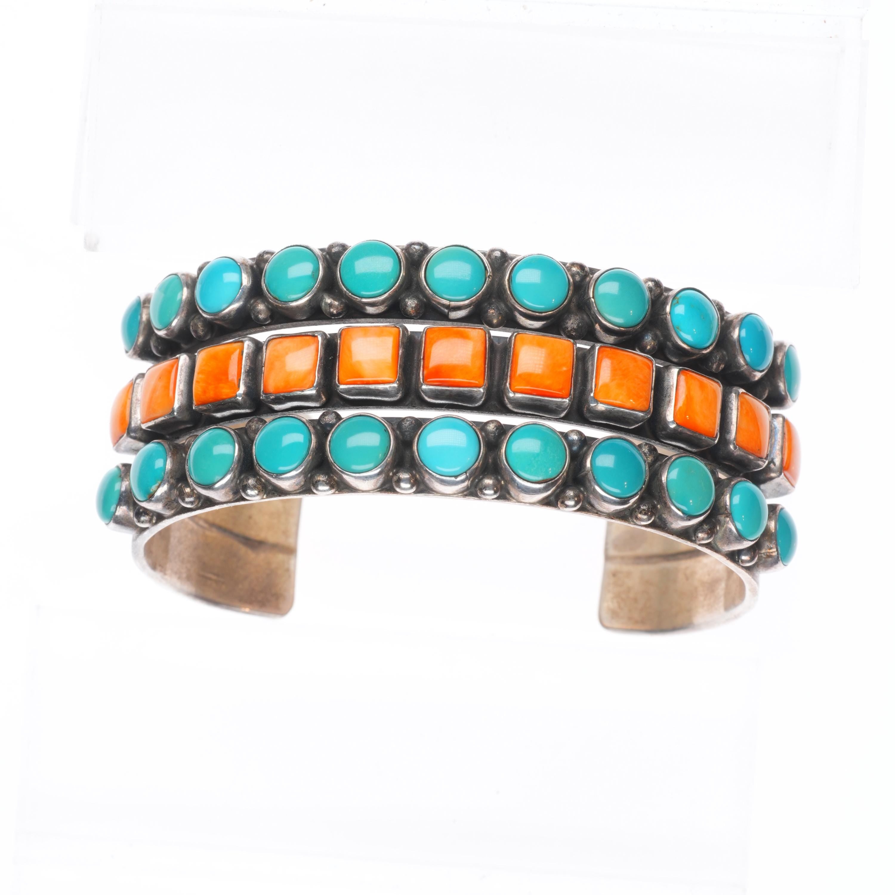 6.4" Alvin Lee Navajo sterling silver, turquoise, spiny oyster row cuff bracelet. Tested and guaranteed solid sterling silver with weight and measurements in pictures. Circa last quarter of the 20th century with some expected age appropriate wear. Alvin Lee, Navajo, is from Shiprock, New Mexico. He is the cousin of Albert Jake.