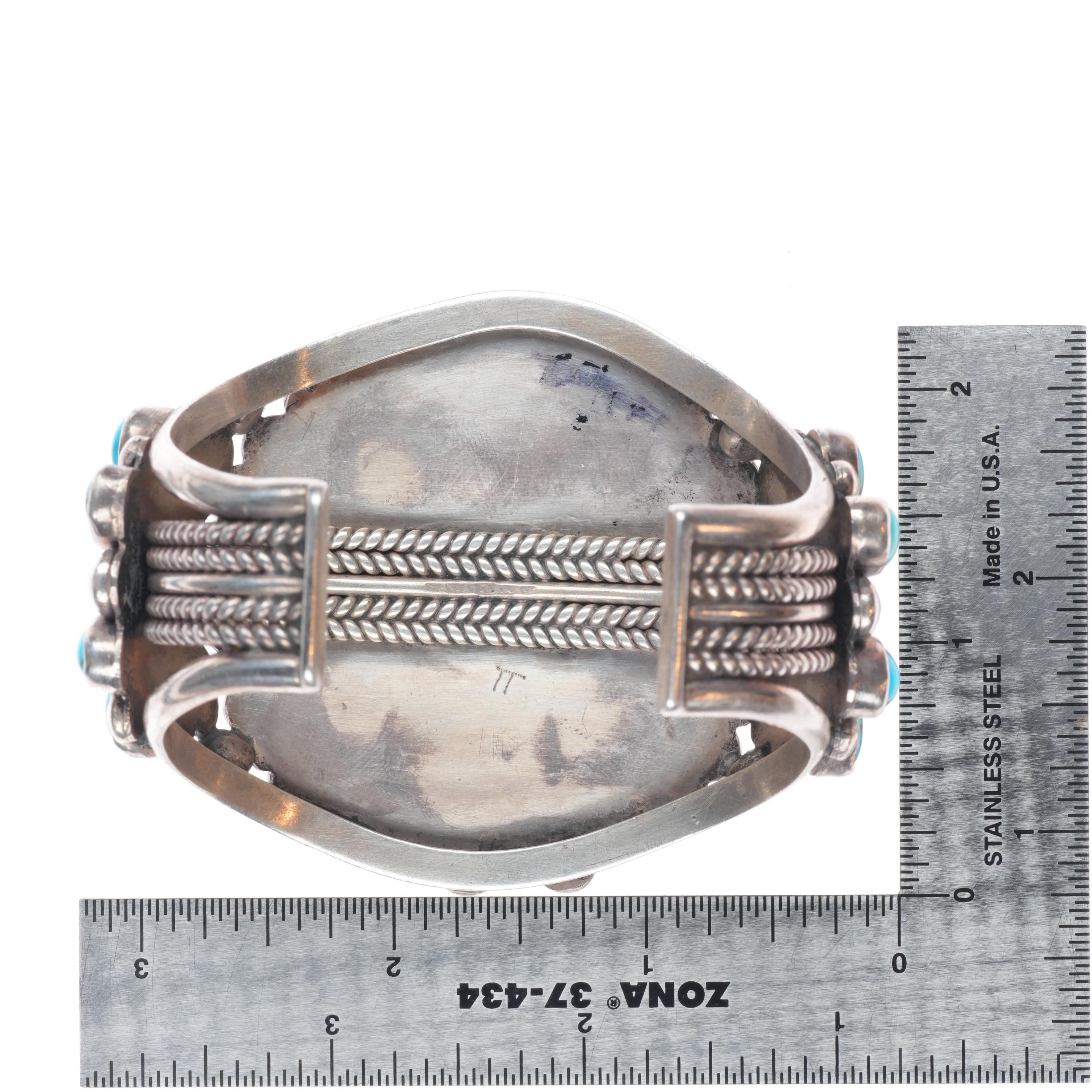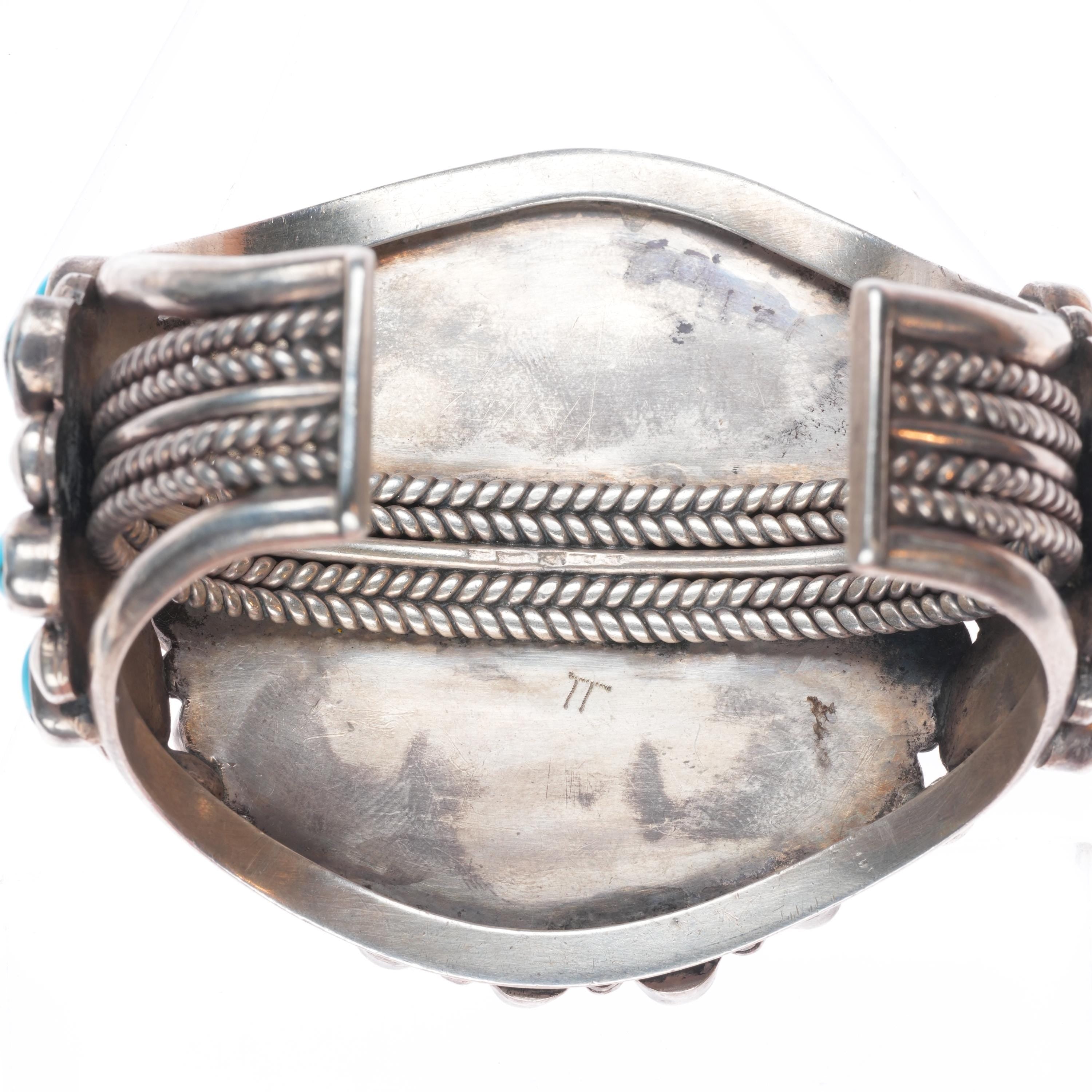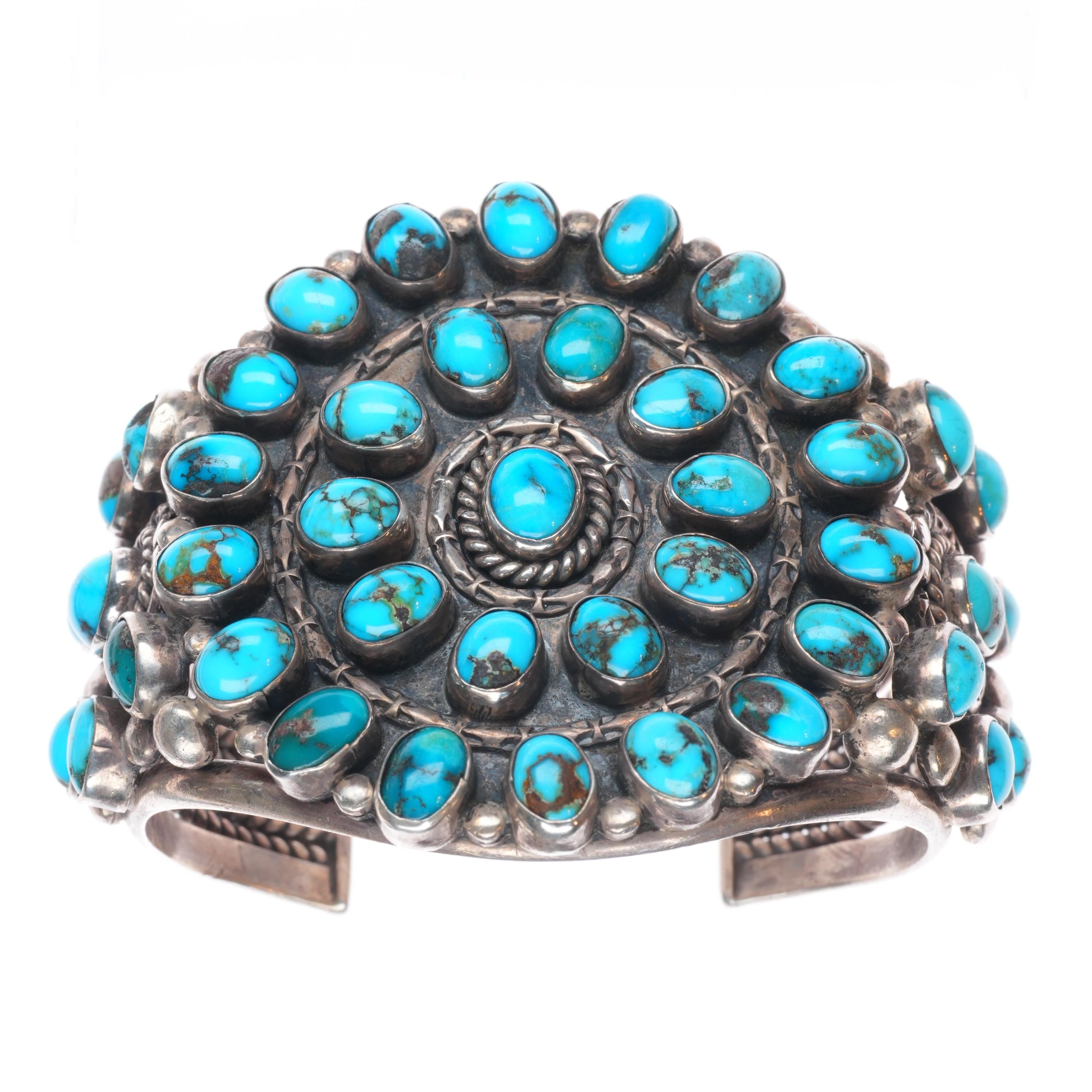 6.4" c1940‘s Zuni sterling silver big high grade turquoise cluster cuff bracelet. Tested and guaranteed solid sterling silver with weight and measurements in pictures. Circa second quarter of the 20th century. No apparent markings.