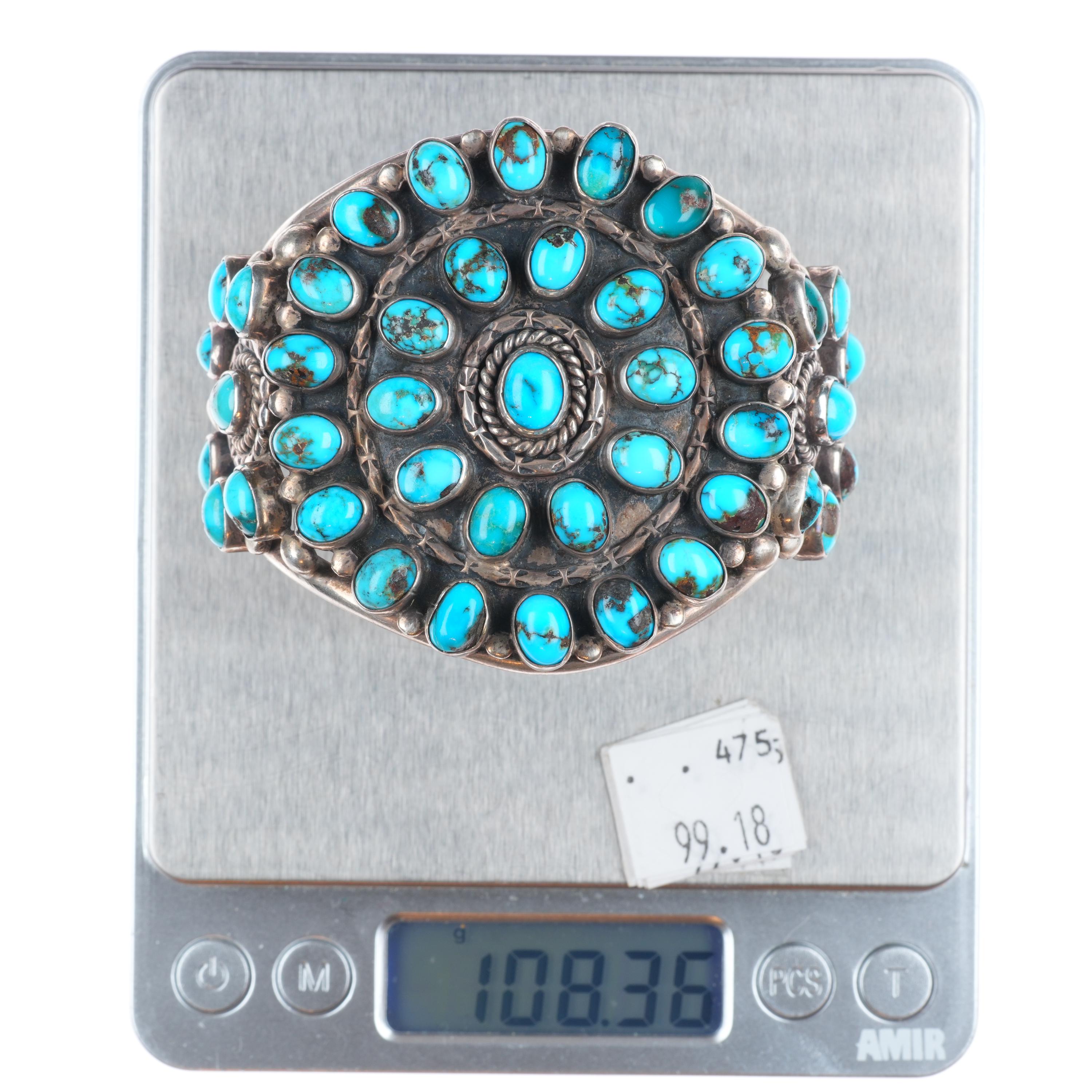 6.4" c1940's Zuni sterling silver big high grade turquoise cluster cuff bracelet
