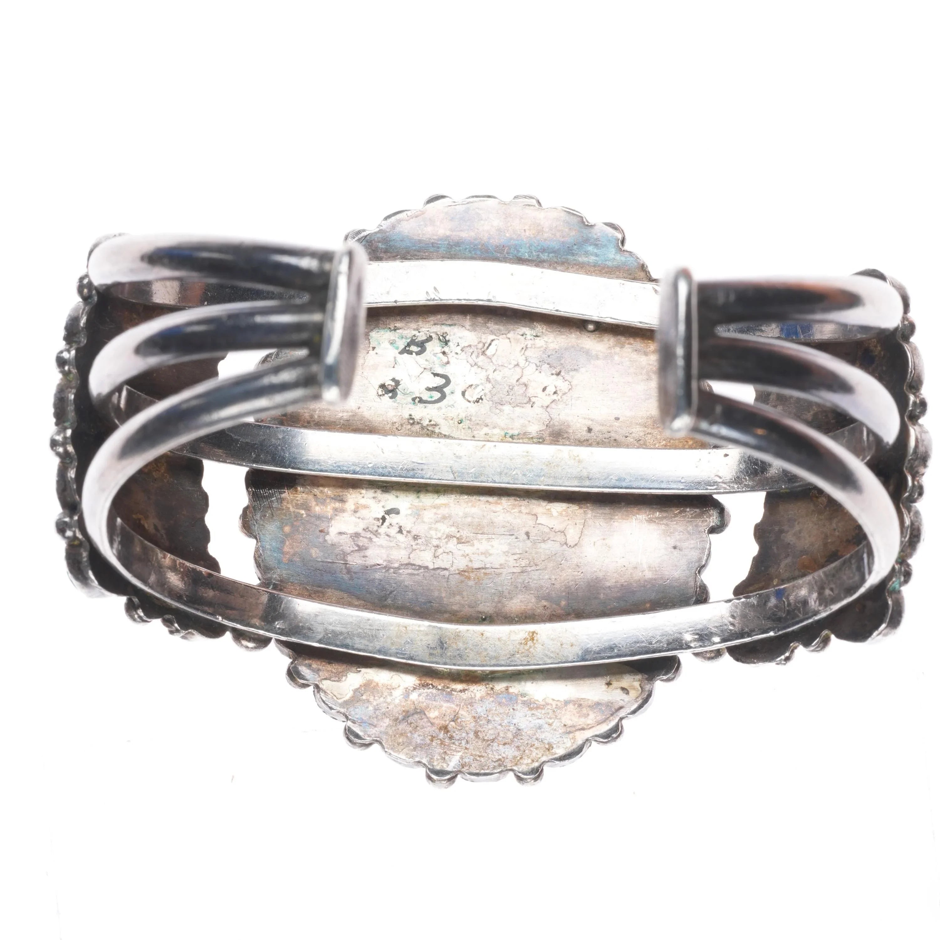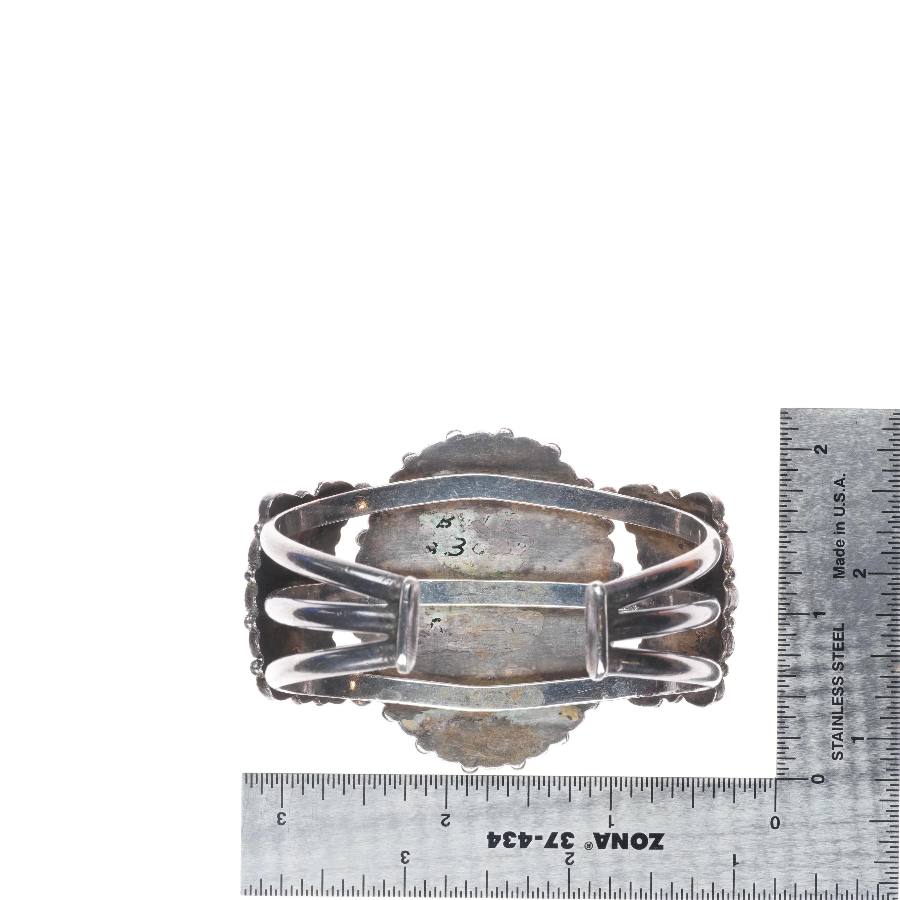 6.5" 50‘s-60‘s Zuni Blue Gem turquoise cluster cuff bracelet sterling silver . Tested and guaranteed solid sterling silver with weight and measurements in pictures. No damage or significant wear, circa third quarter of the 20th century.