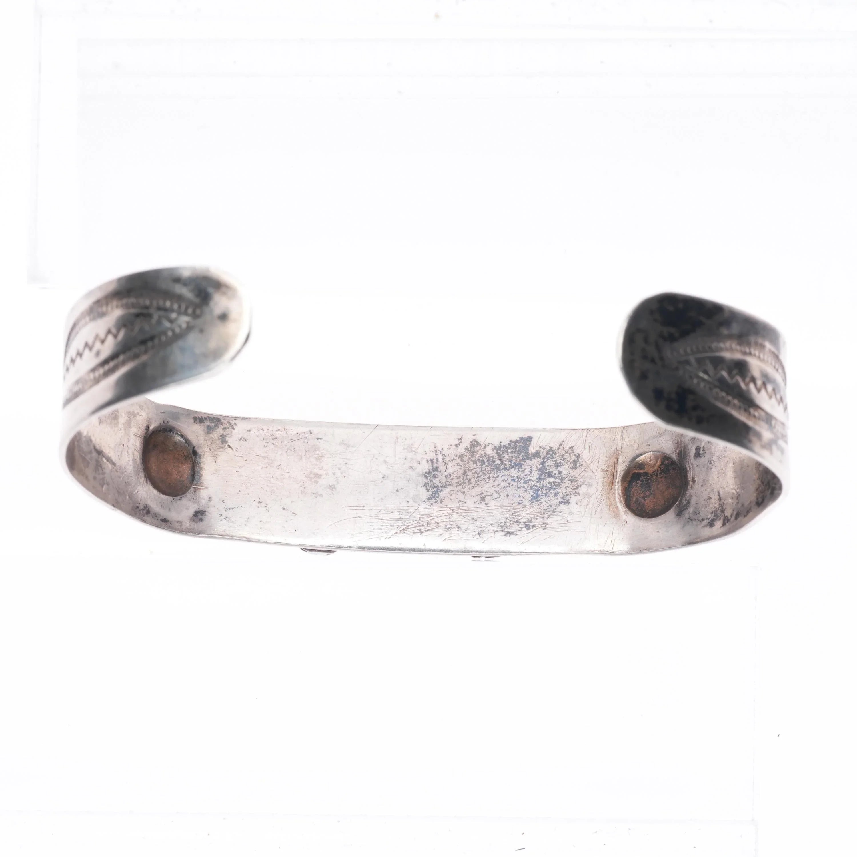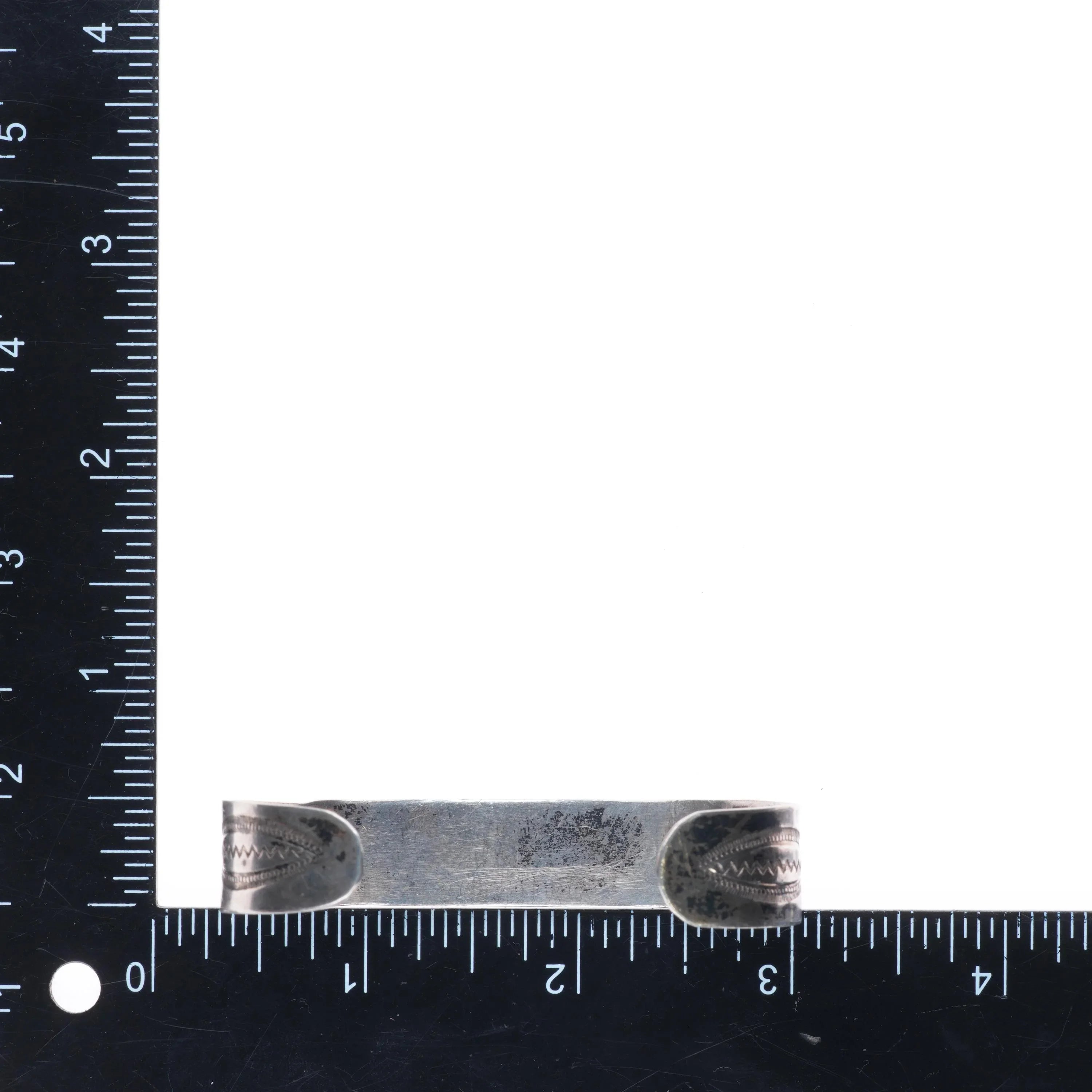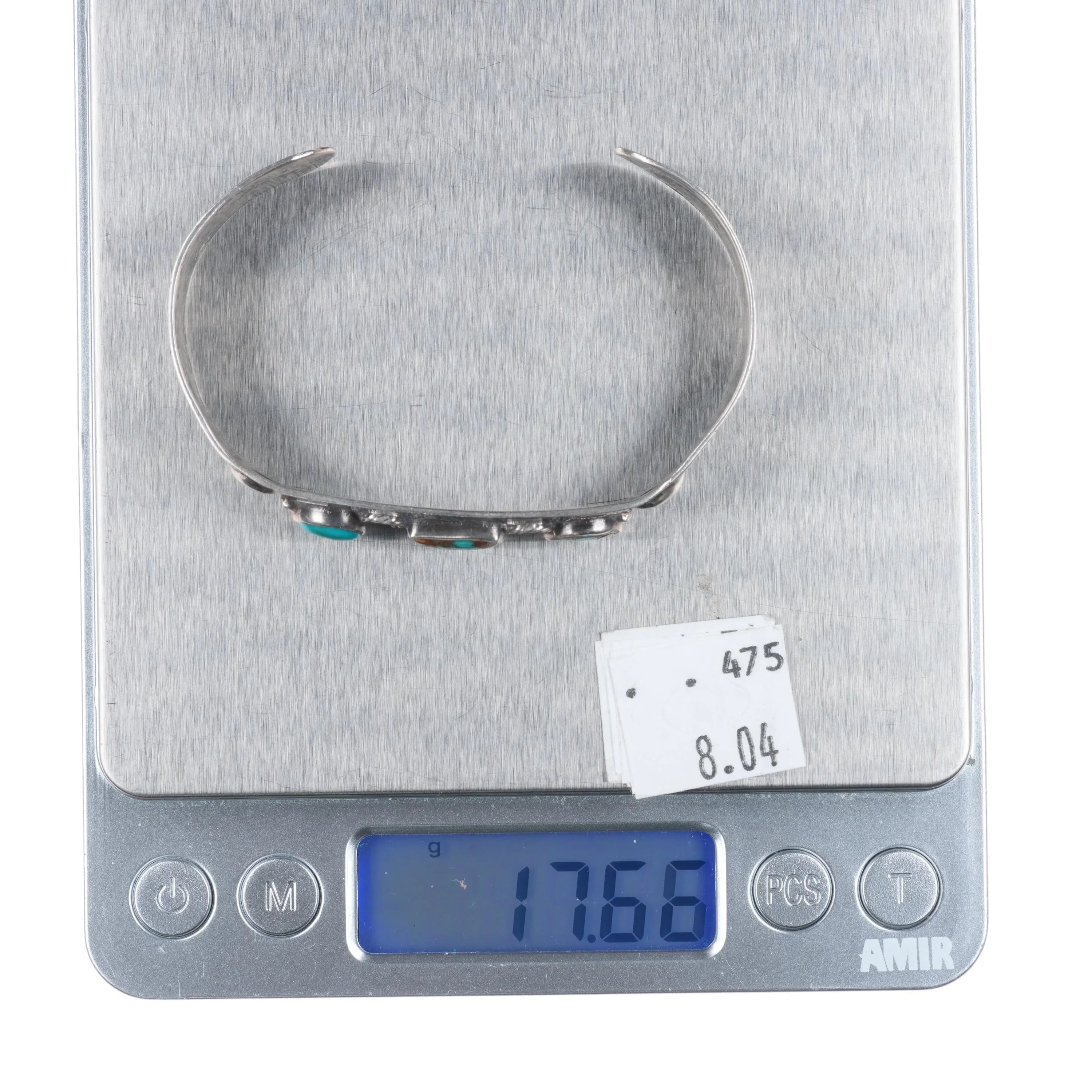 6.6" c1940‘s Vintage Navajo sterling silver high grade turquoise cuff bracelet. Tested and guaranteed solid sterling silver with appropriate wear, one stone with old fracture. All stones secure in bezels. Weight and measurements in pictures. Circa tsecond quarter of the 20th century. unmarked