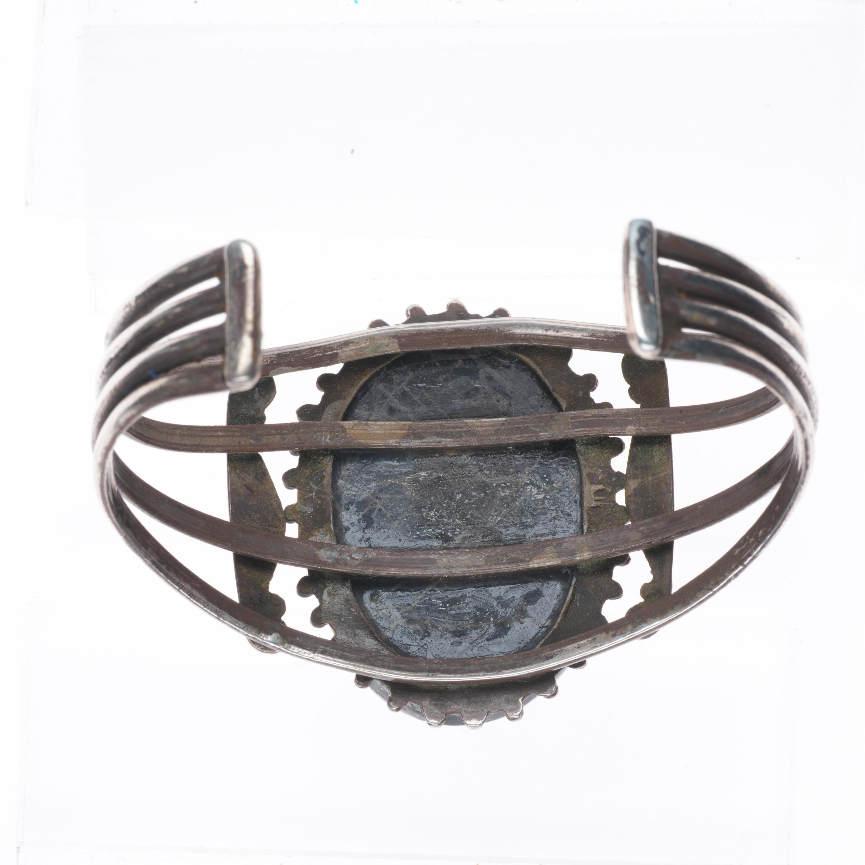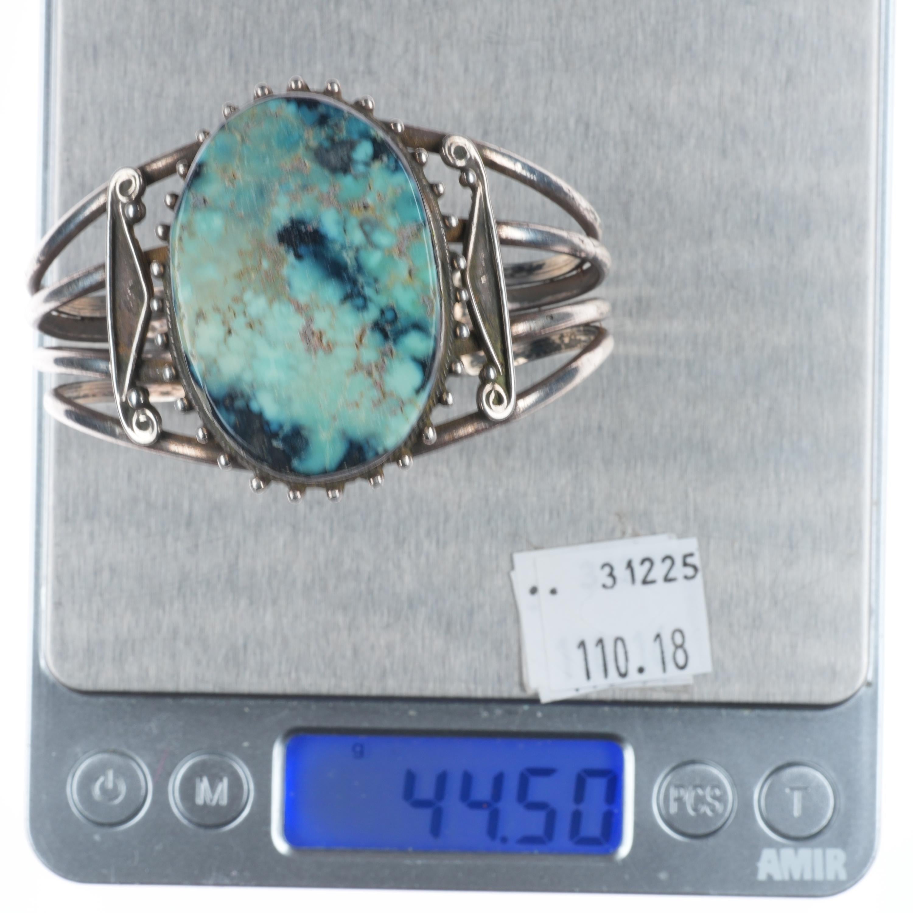 6.75" c1930 Navajo ingot silver variscite cuff bracelet . Tested and guaranteed solid ingot/sterling silver with weight and measurements in pictures. Circa early second quarter of the 20th century with age appropriate wear.. I believe the stone may be a replacement, also the back of the bezel is open which is different, still the bezel/patina looks right.