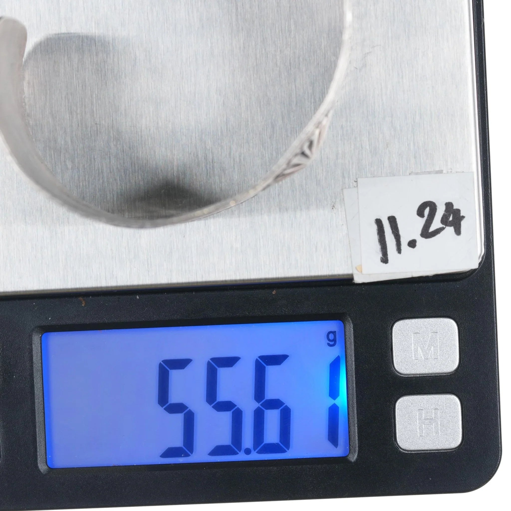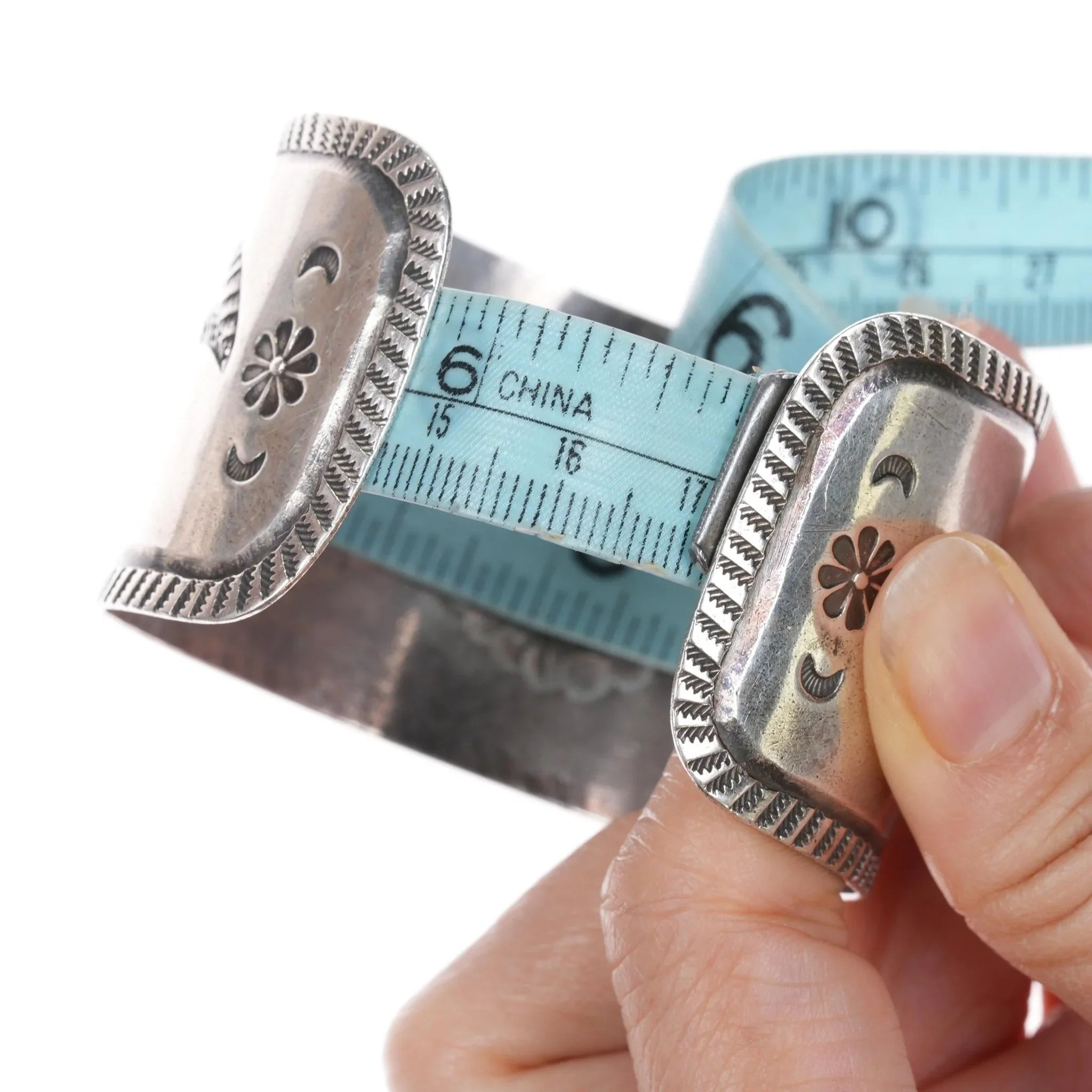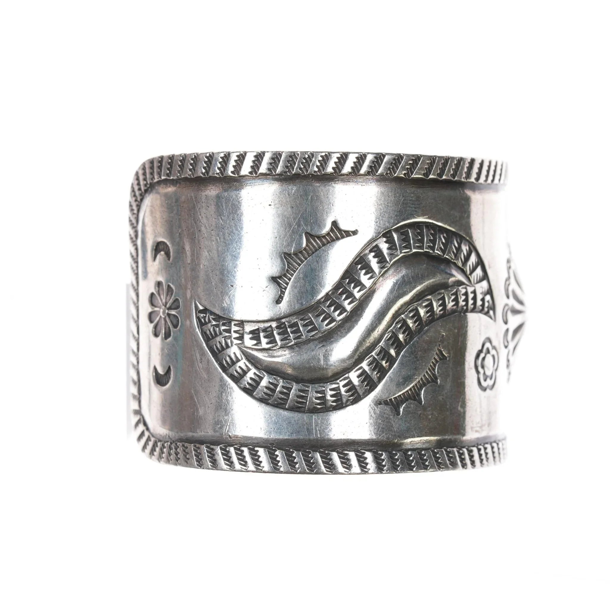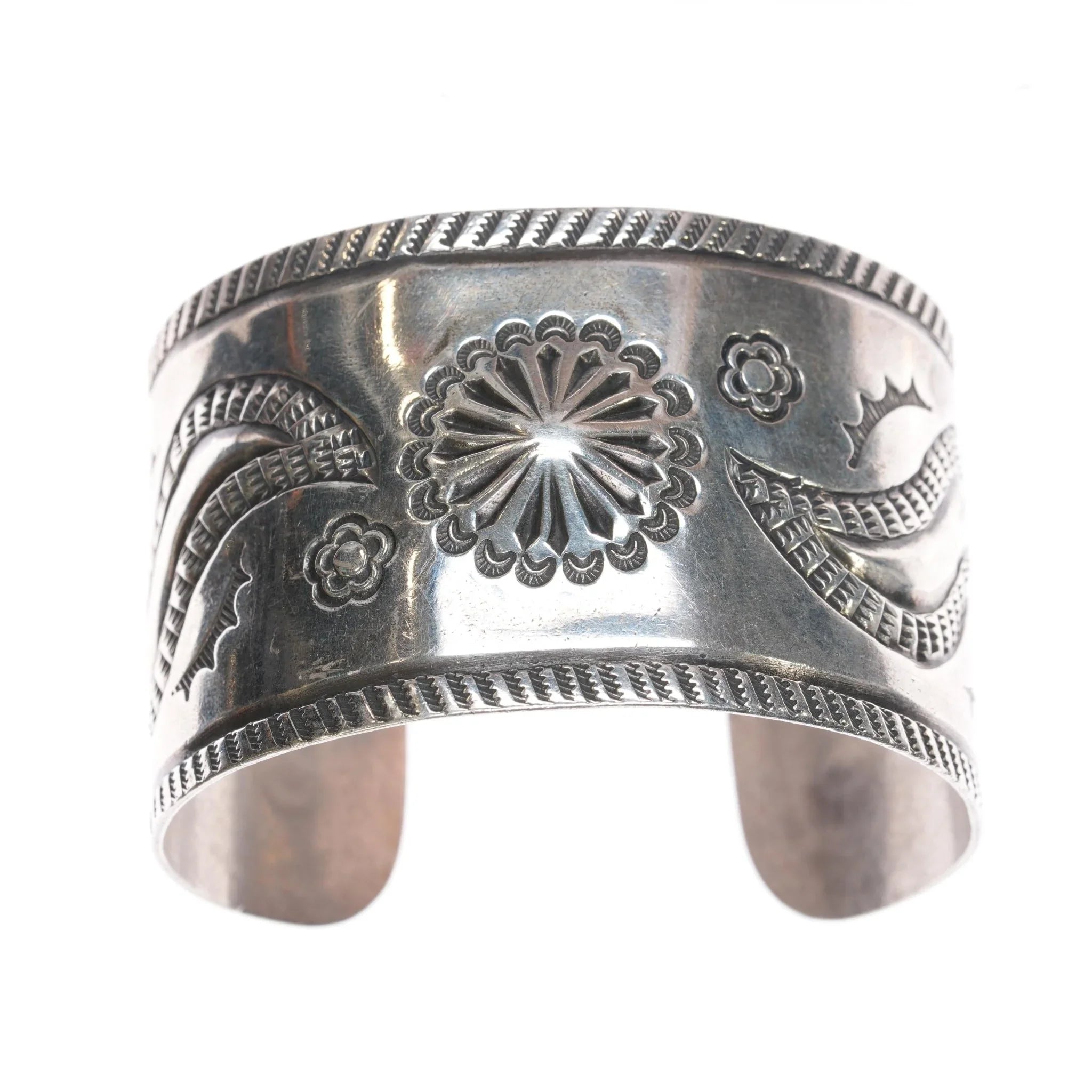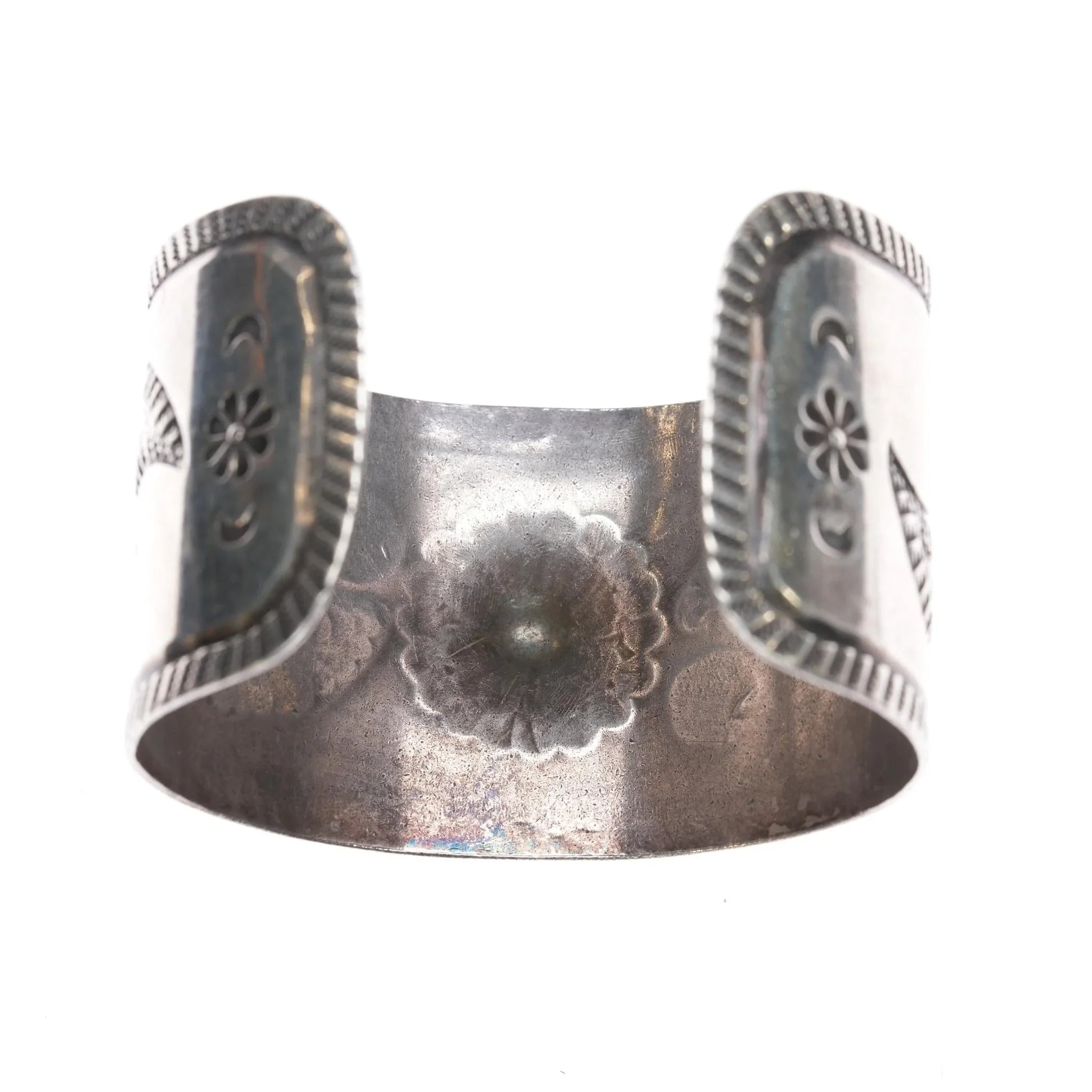 6.75" Vintage Navajo wide band heavily stamped silver cuff bracelet. Weight and measurements in pics. Solid sterling, unmarked, circa mid 20th century.