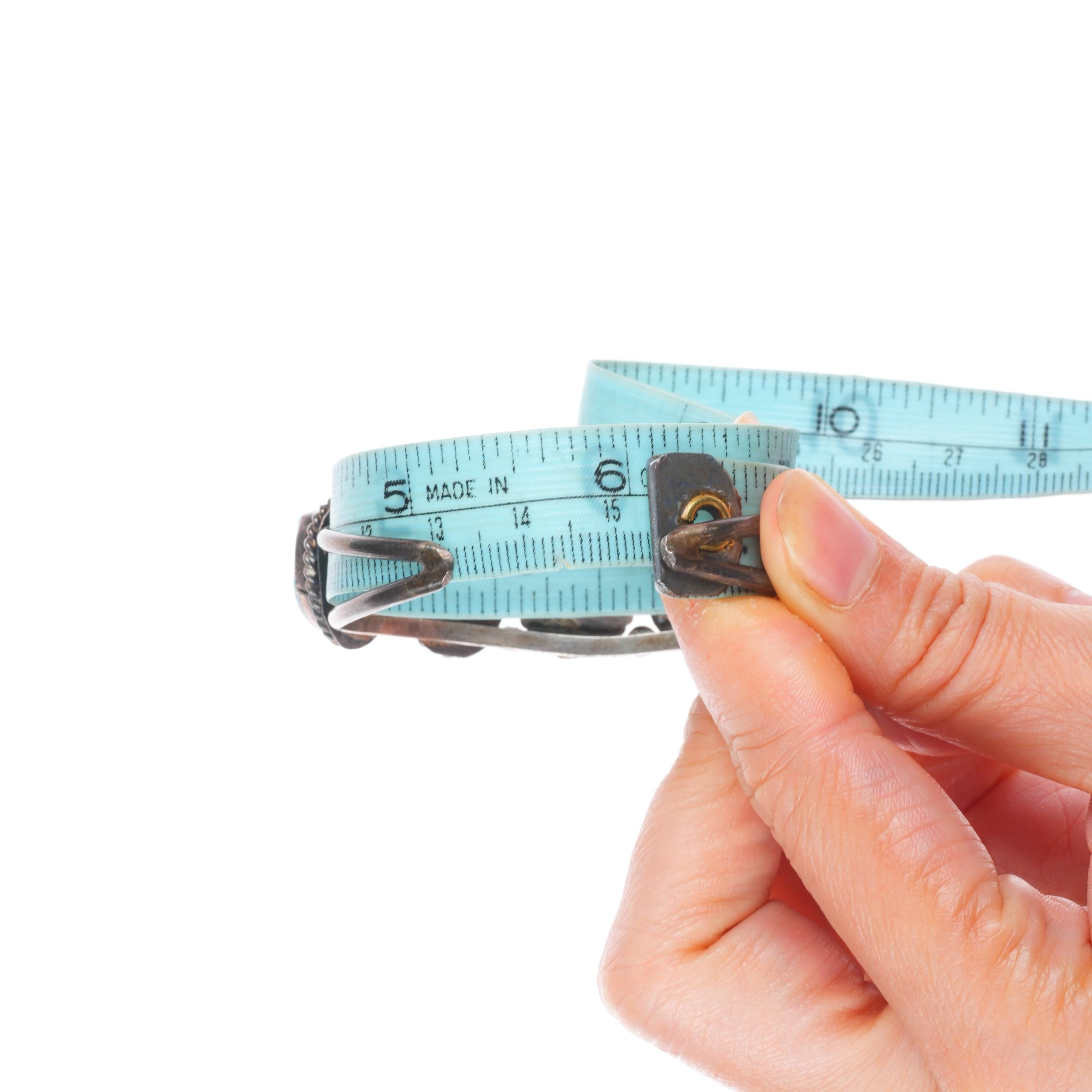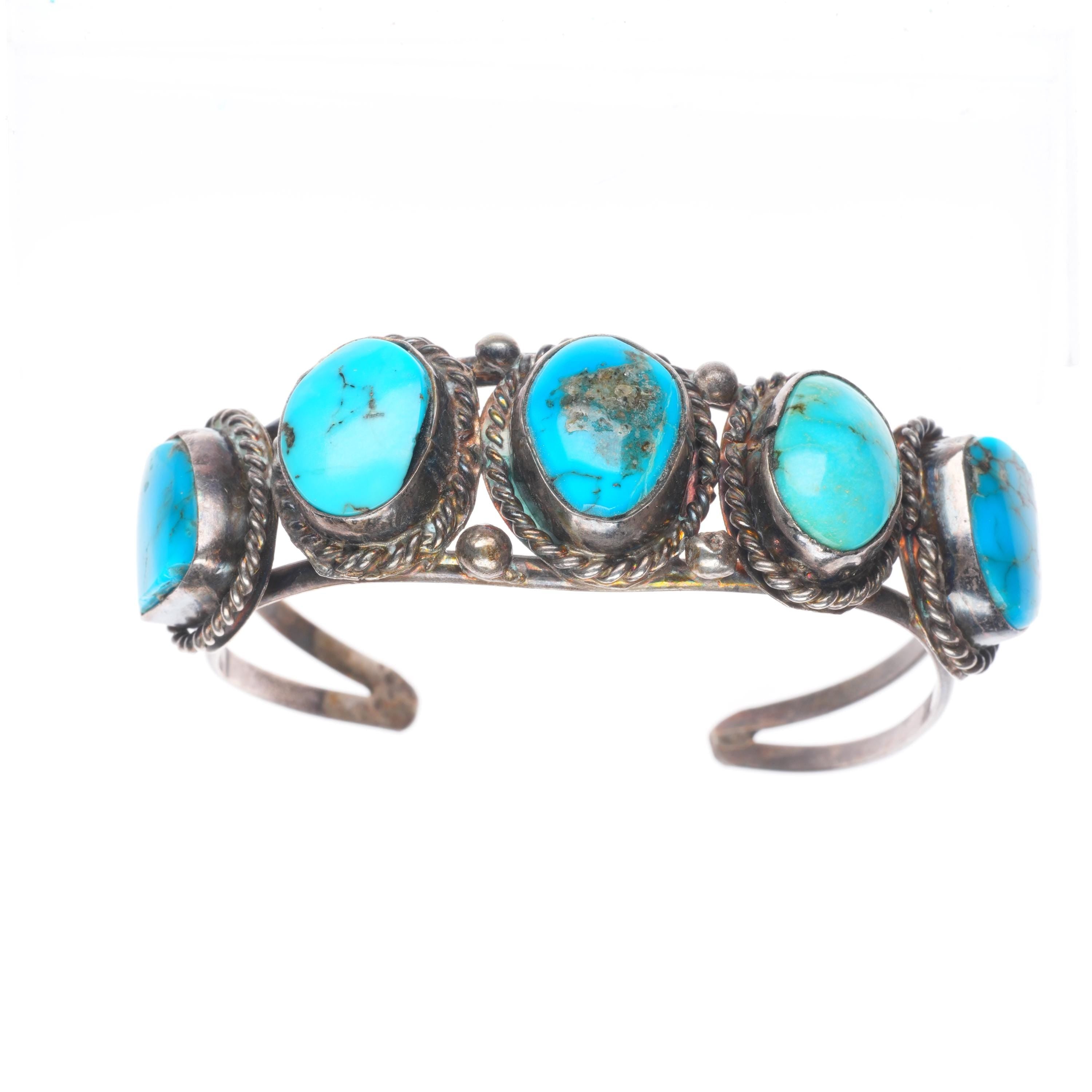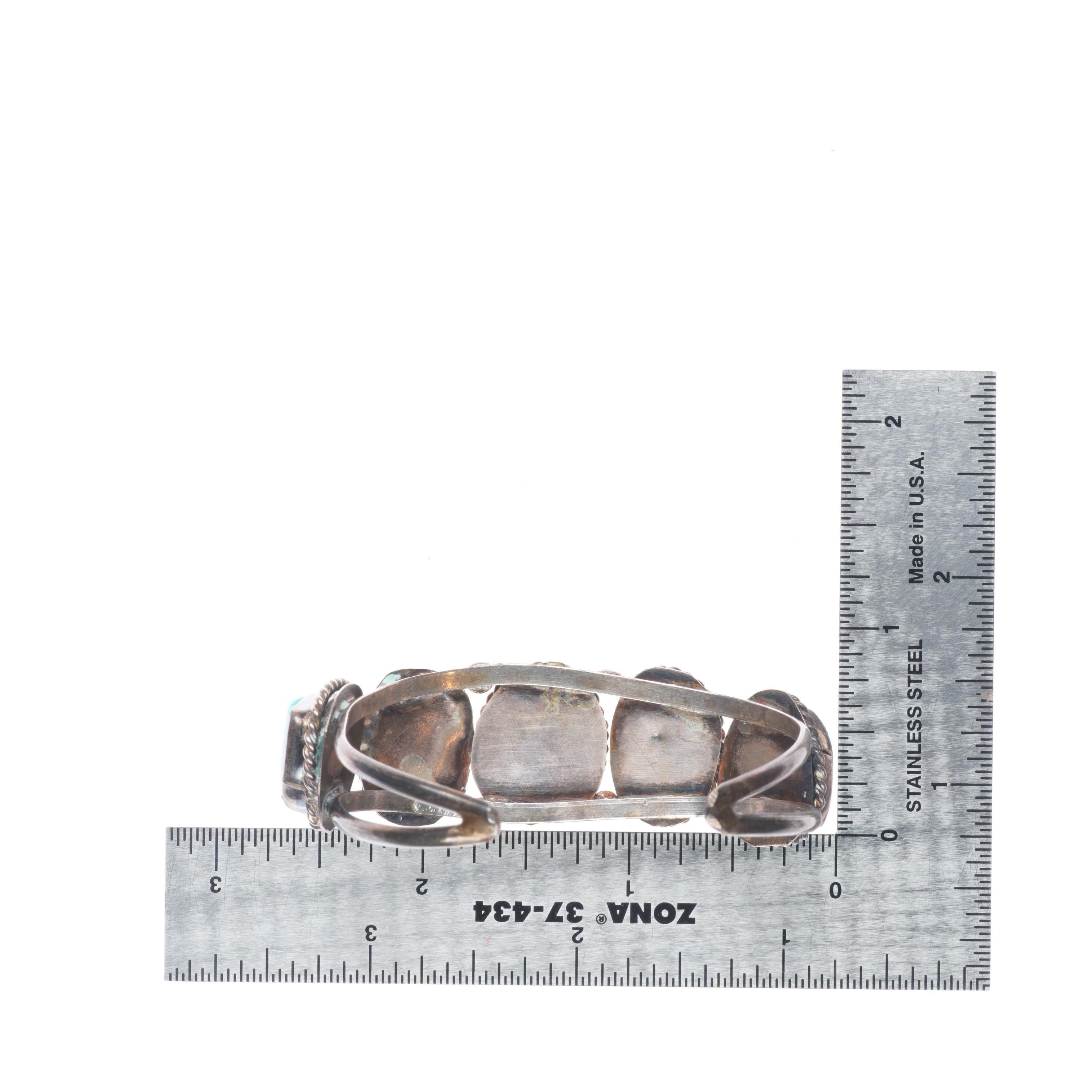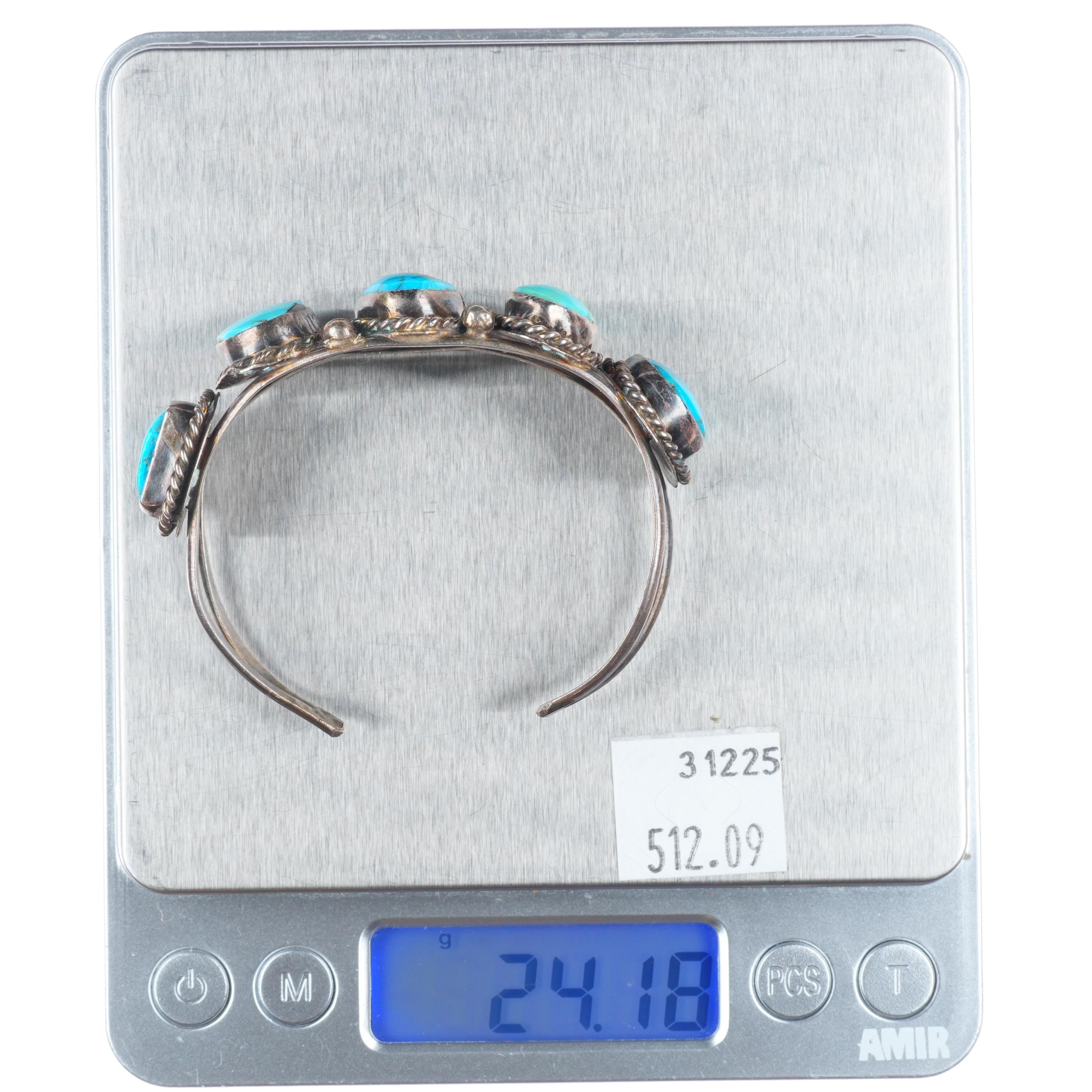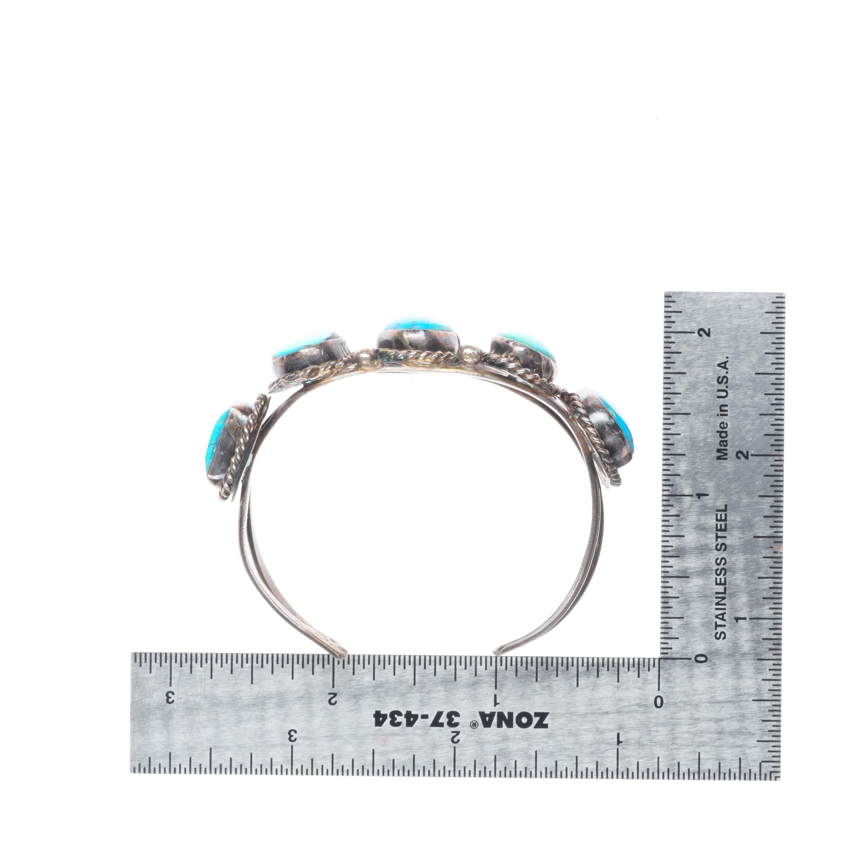 6" c1960's sterling silver turquoise row cuff bracelet with rope bezels. Tested and guaranteed solid sterling silver with weight and measurements in pictures. Overall expected wear with apparent circa third quarter of the 20th century with some expected overall wear but no damage..