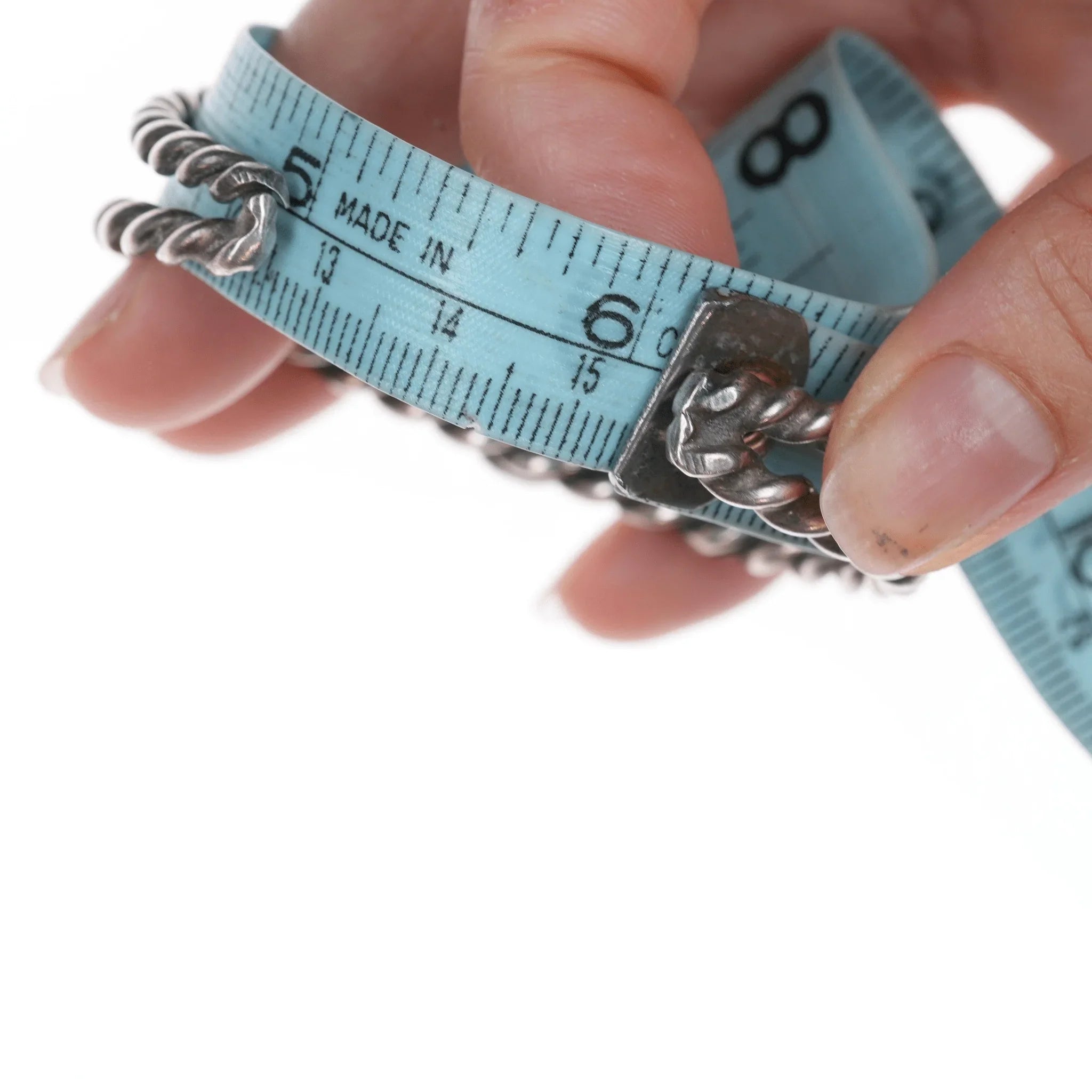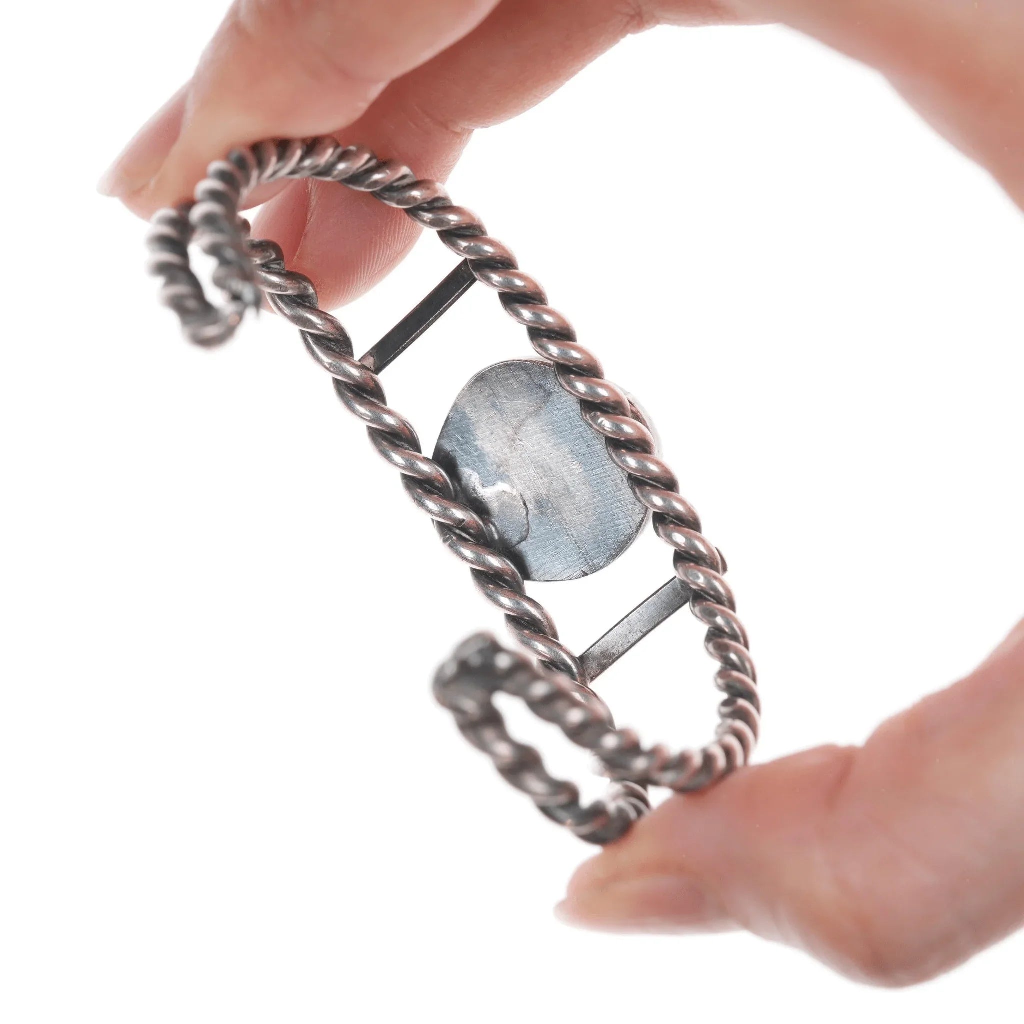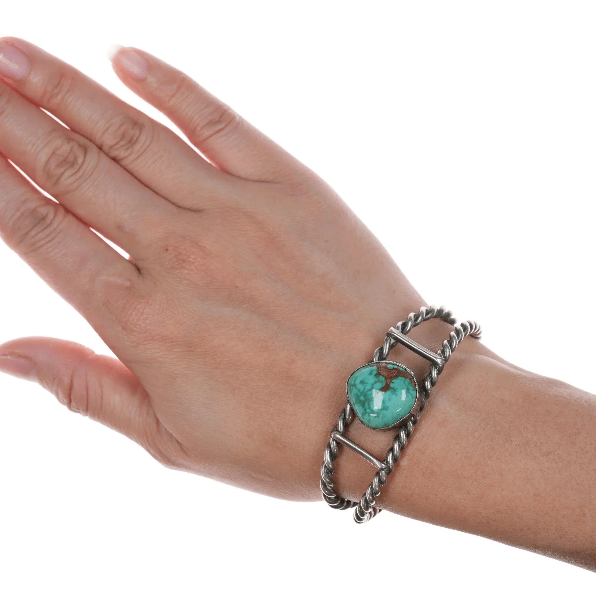 6" Vintage High grade turquoise twisted wire cuff bracelet 22mm wide in center.<br><br> Marked or unmarked as shown in pics, weight and other measurements in pics. Sorry but my jewelry is stored in a secure location and cannot be accessed for more pictures,<br>videos, or measurements until sold. If you look at pictures/description your<br>question should be answered. Thank you so much for your time and consideration!<br><br>All precious metals are tested and guaranteed. A Native American jewelry piece referred to as "silver" or "ingot" is guaranteed to be at least 90% silver. Bracelets are photographed on a 6" women's wrist.