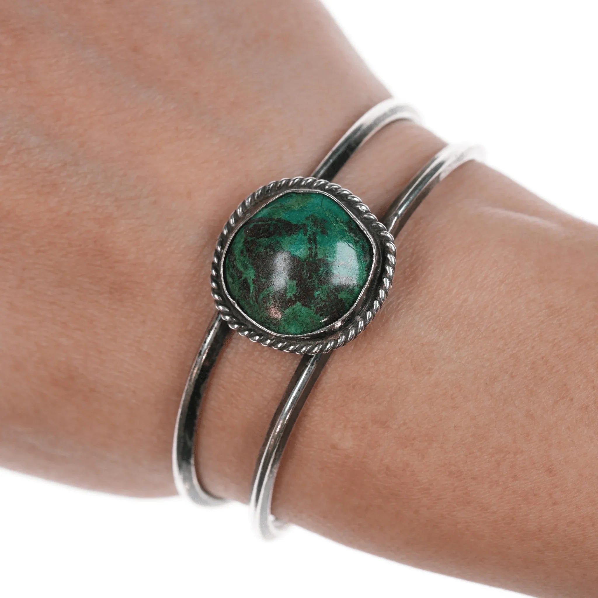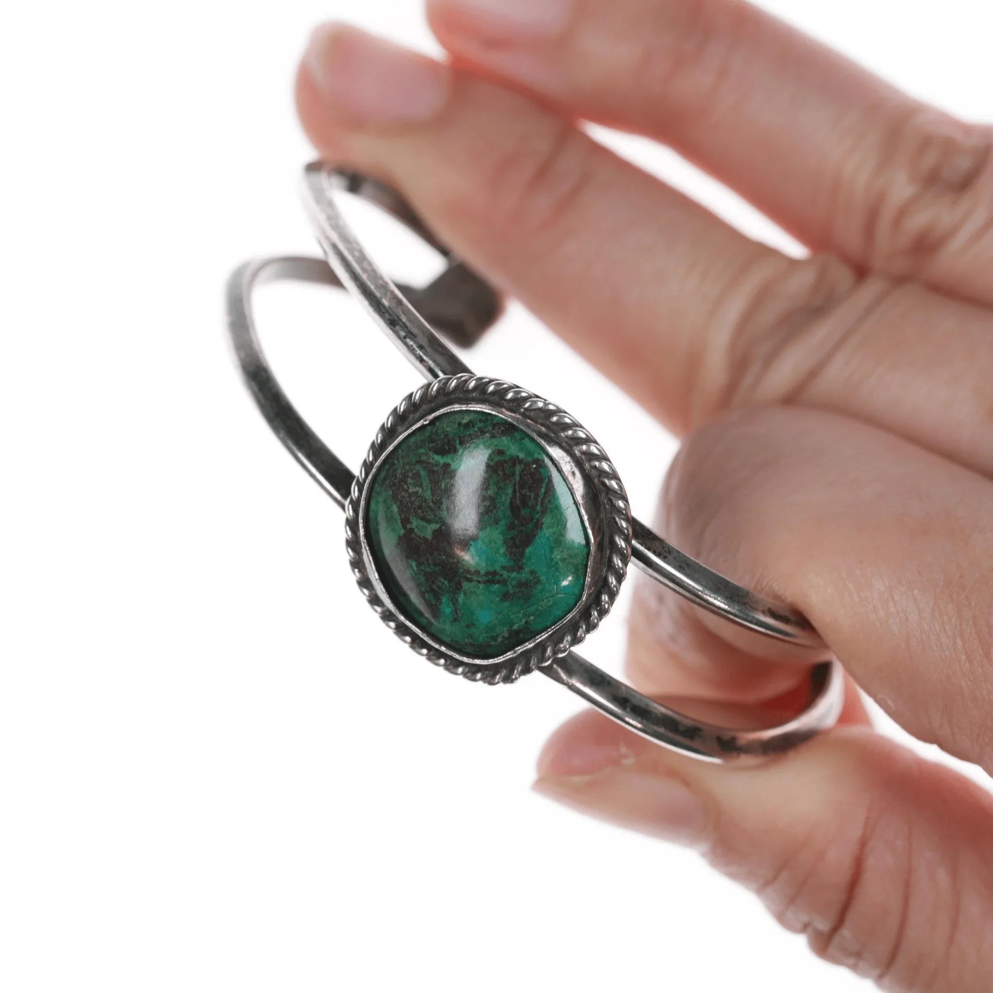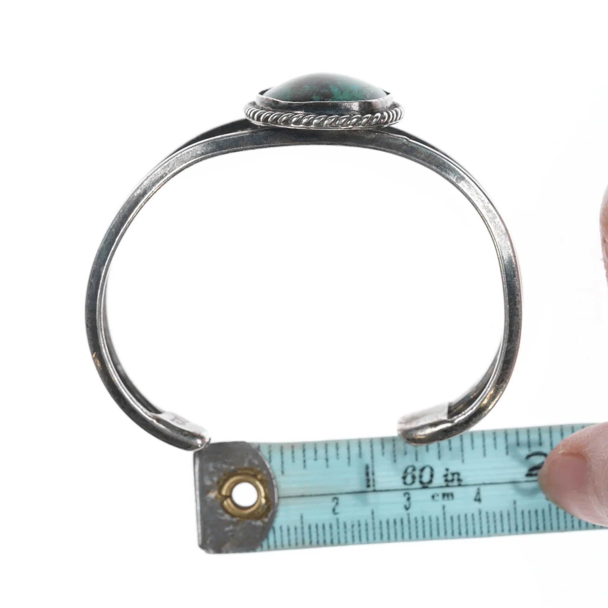 6" Vintage Native American silver and green stone cuff bracelet<br><br> Marked or unmarked as shown in pics, weight and other measurements in pics. Sorry but my jewelry is stored in a secure location and cannot be accessed for more pictures,<br>videos, or measurements until sold. If you look at pictures/description your<br>question should be answered. Thank you so much for your time and consideration!<br><br>All precious metals are tested and guaranteed. A Native American jewelry piece referred to as "silver" or "ingot" is guaranteed to be at least 90% silver. Bracelets are photographed on a 6" women's wrist.