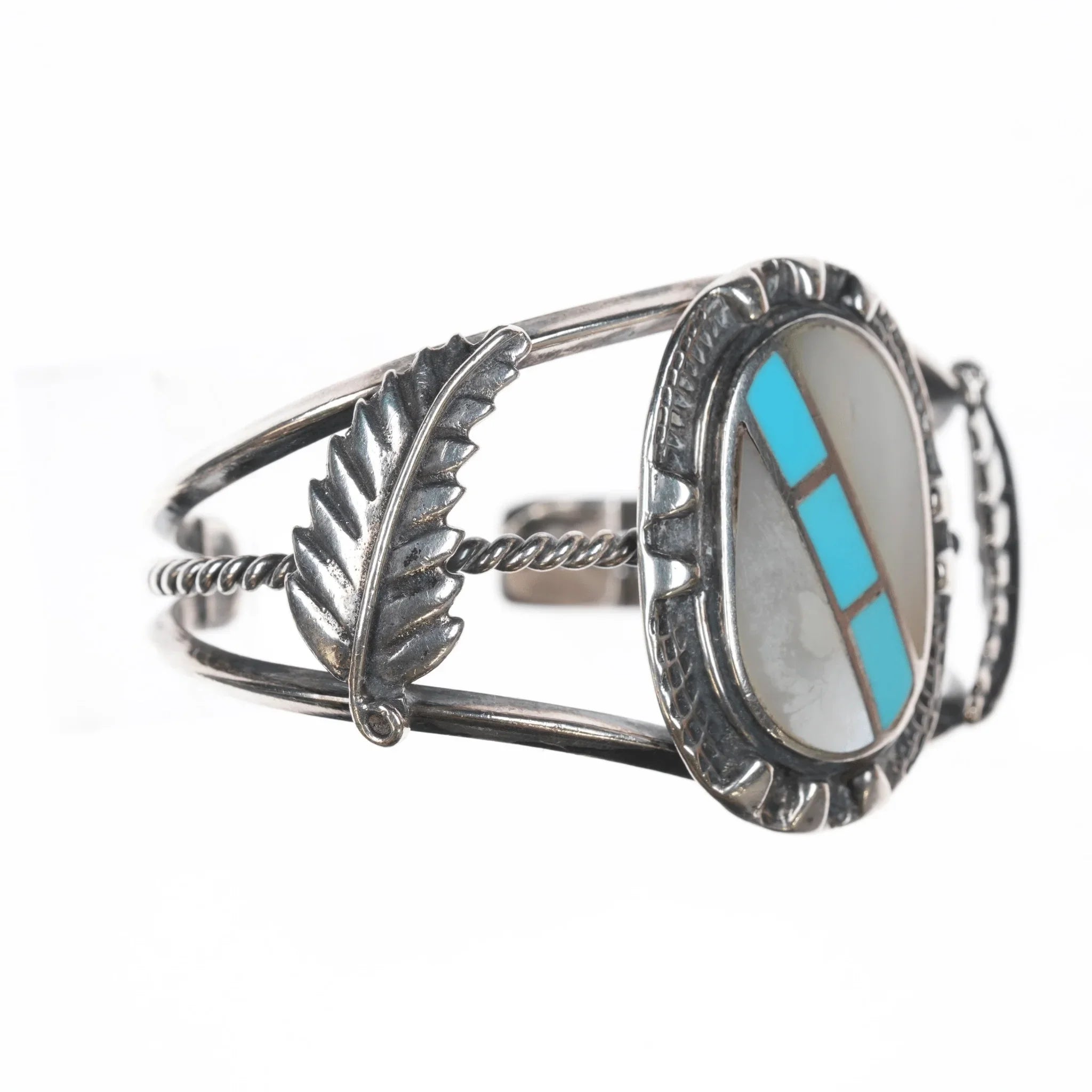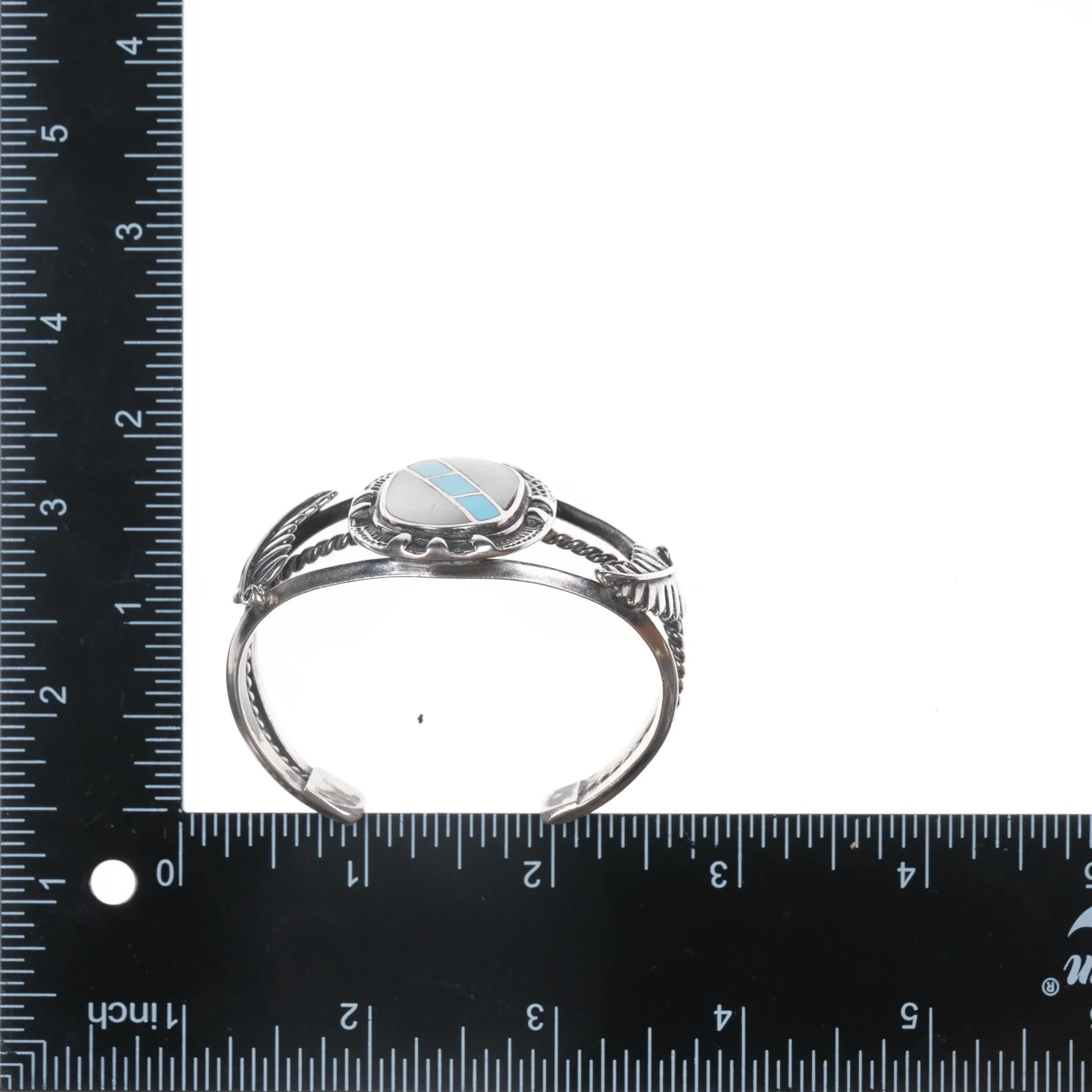 6" Vintage Native American sterling- turquoise and shell channel inlay cuff bracelet. No issues.