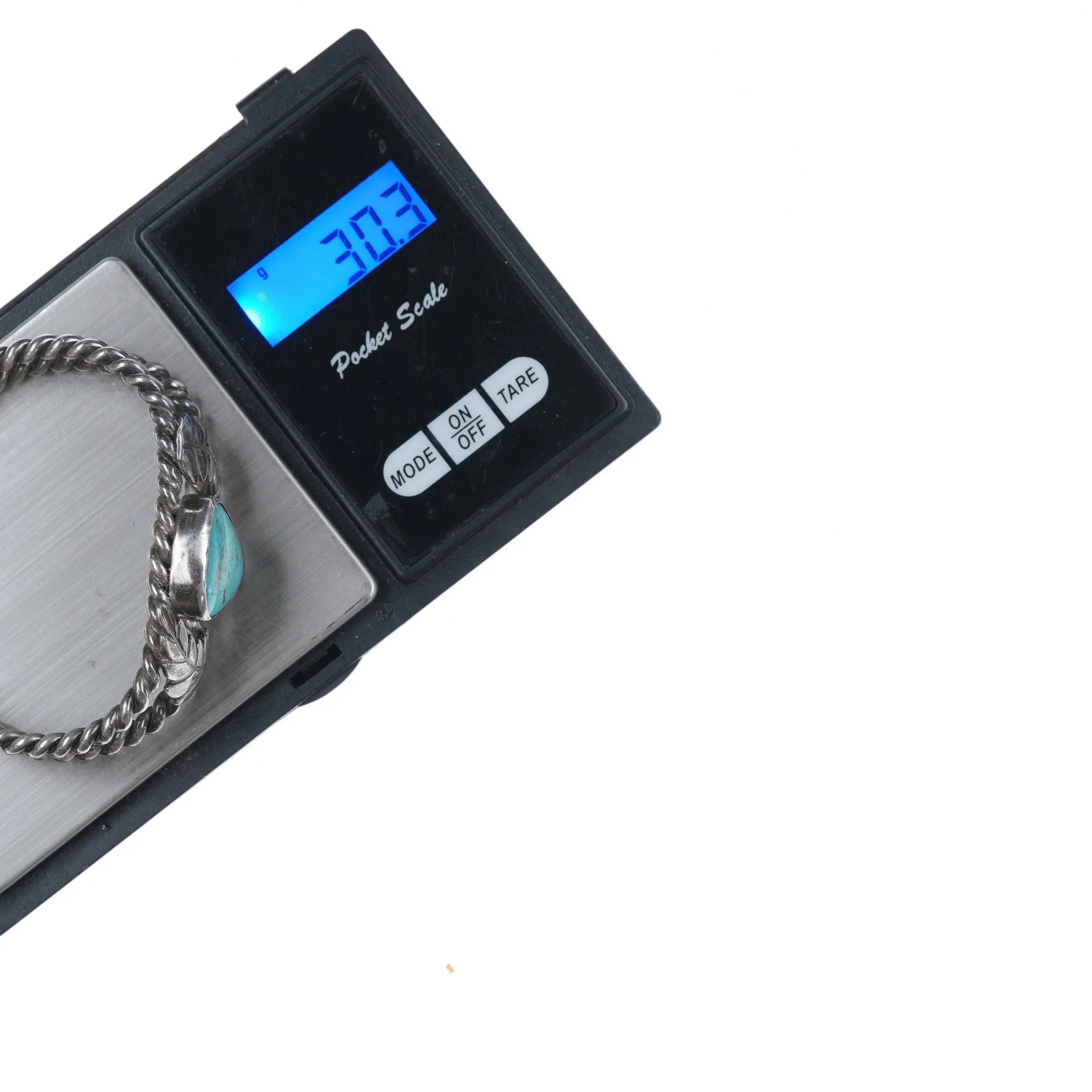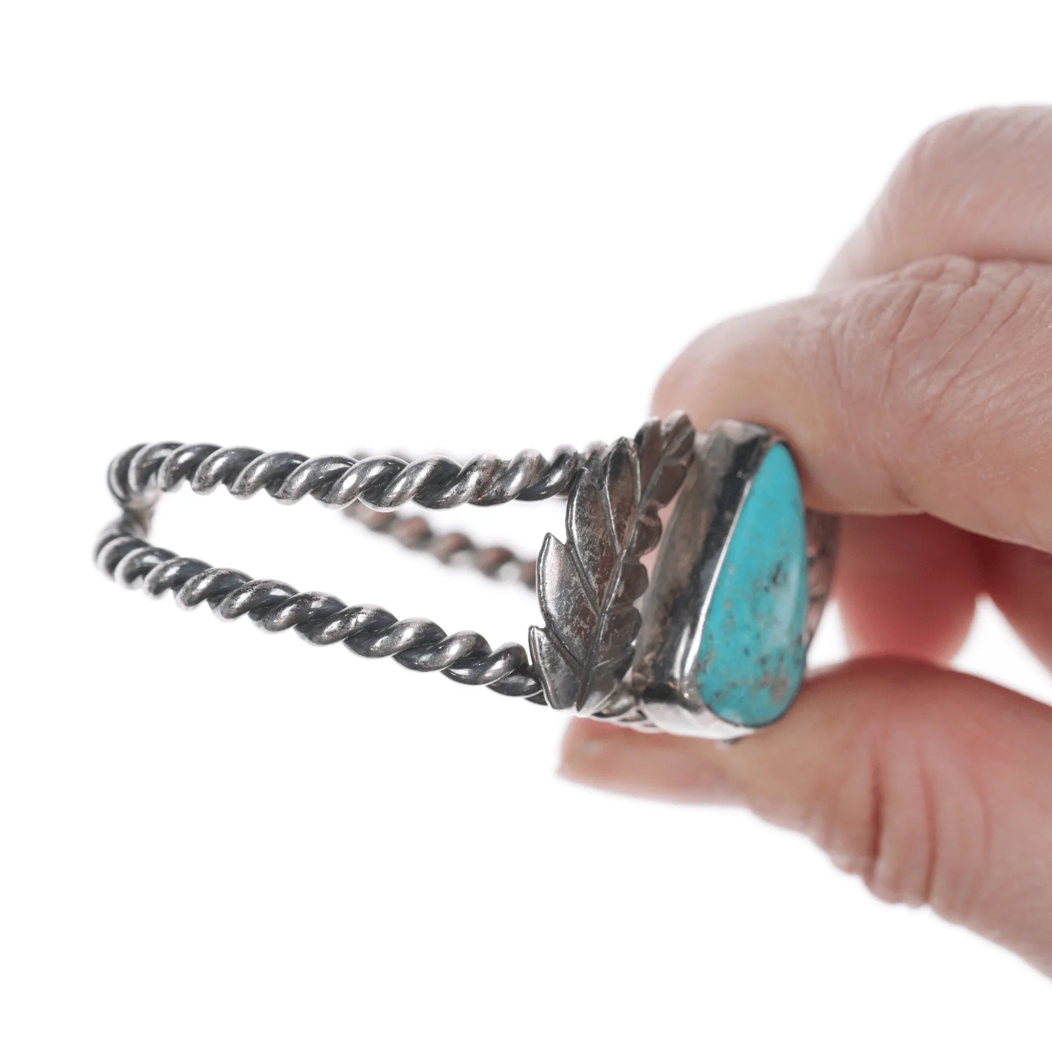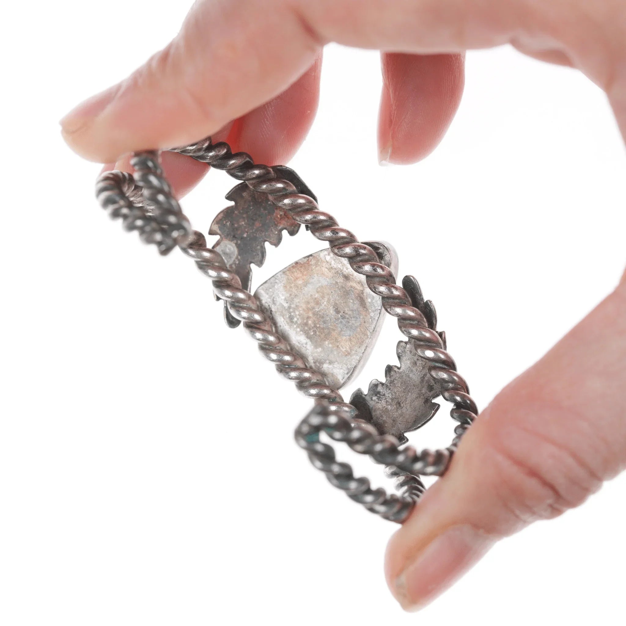 6" Vintage Navajo Twisted silver wire turquoise cuff bracelet 7/8" wide in<br>center, unmarked, weight and other measurements in pics. Sorry but my jewelry is<br>stored in a secure location and connot be accessed for more pictures, videos, or<br>measurements until sold. If you look at pictures/description your question<br>should be answered. Thank you so much for your time and consideration!<br><br>All precious metals are tested and guaranteed, any Native American jewelry<br>referred to as Silver or Sterling is guaranteed to be a minimum of 90% (coin)<br>silver and possibly higher content. Anything marked is guaranteed to be what<br>it's marked, most bracelets are photographed on a 6" wrist (non hairy), rings<br>photographed on the appropriate sized finger when possible. With bracelets if<br>the measurement is not given in the description then inside circumference is<br>shown where the metal meets the number on the the cloth tape measure.