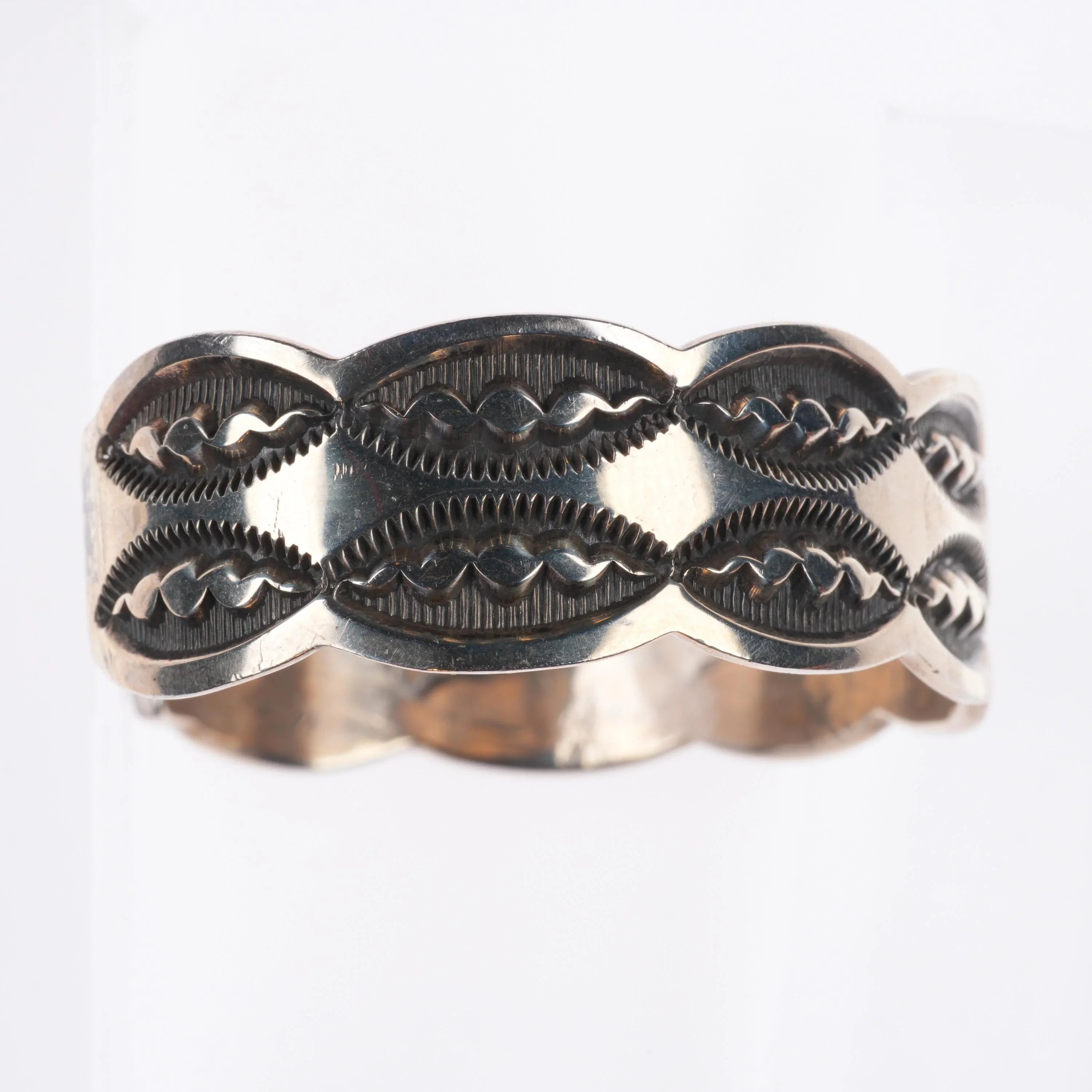 One well-versed in Native American jewelry might notice that the traditional Navajo stamp style seen in Marcs jewelry is liken to a fellow Native American artists work: Emerson Bill. This is no coincidence, as both artists learned the ways of their trade together. This occurred in their salad days, and they grew to be close friends. Marcs work can be distinguished from Emersons by his addition of extra embellishments and flourishes in his stamp work.