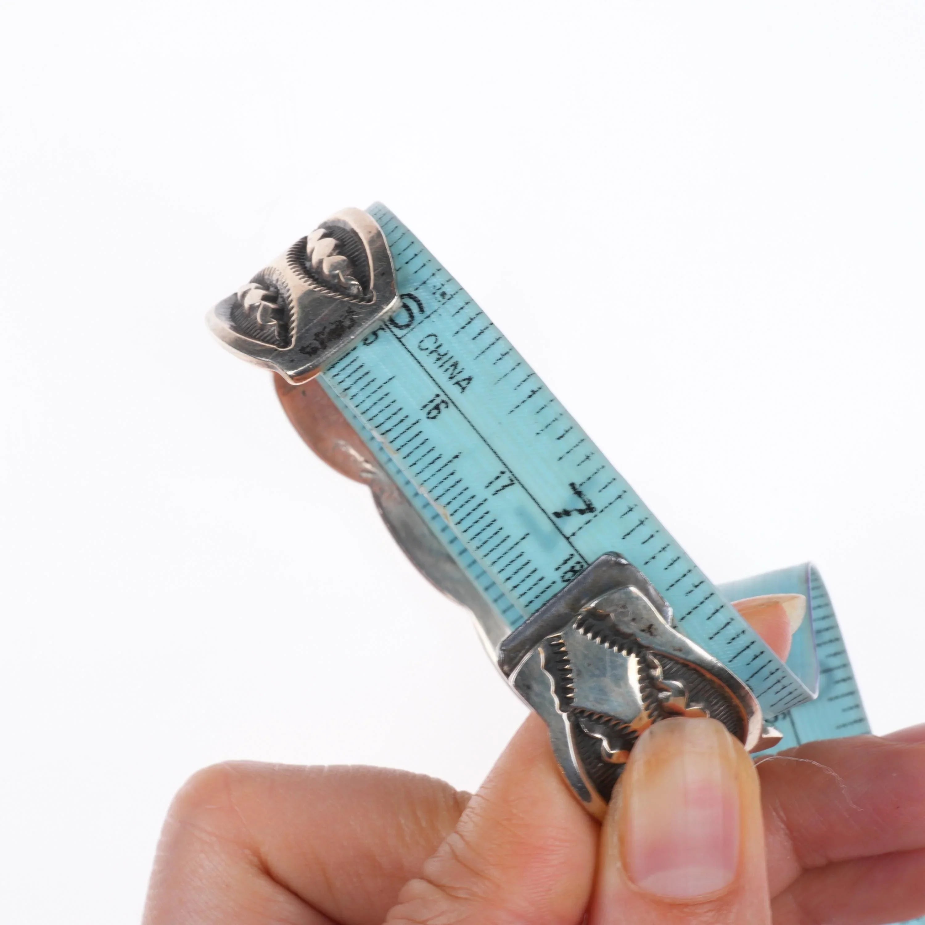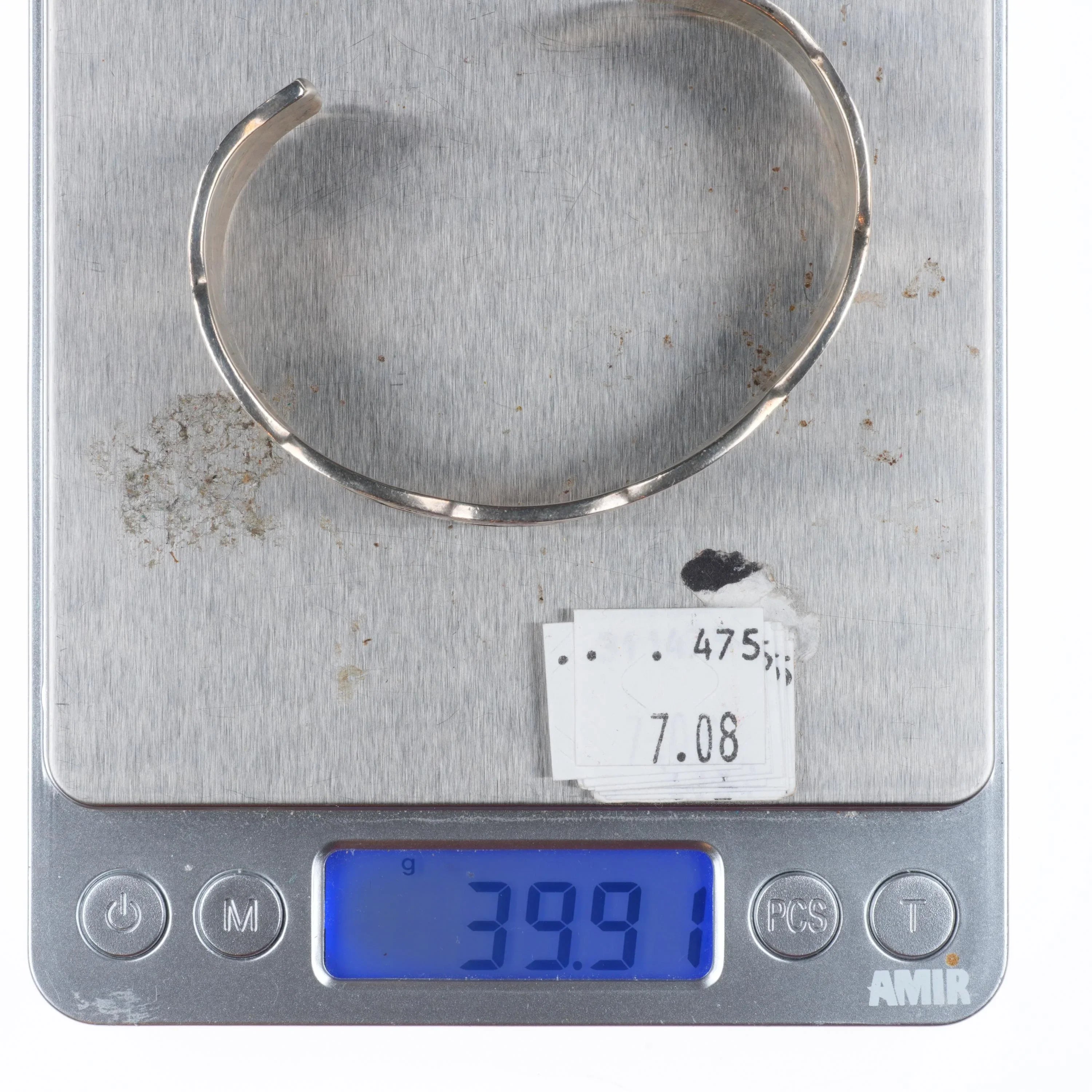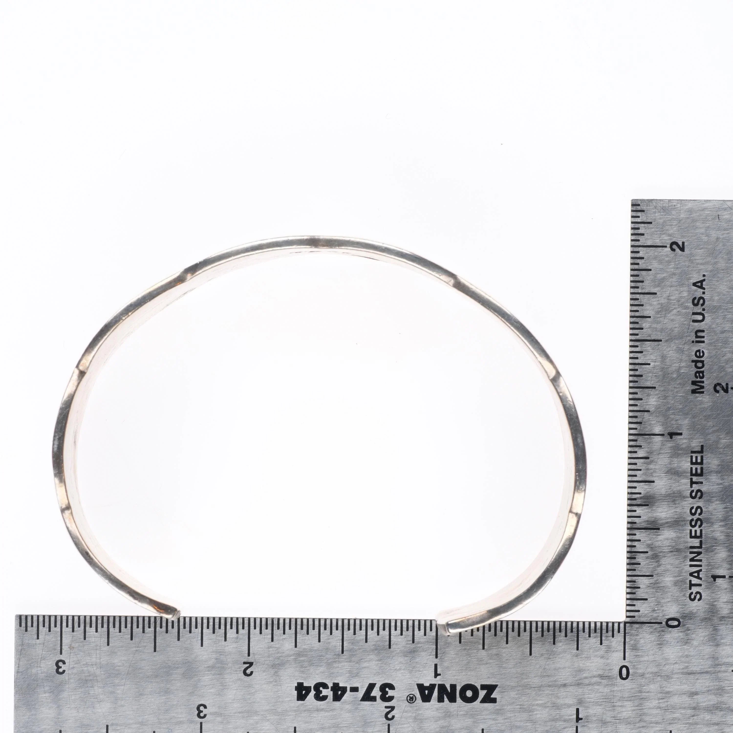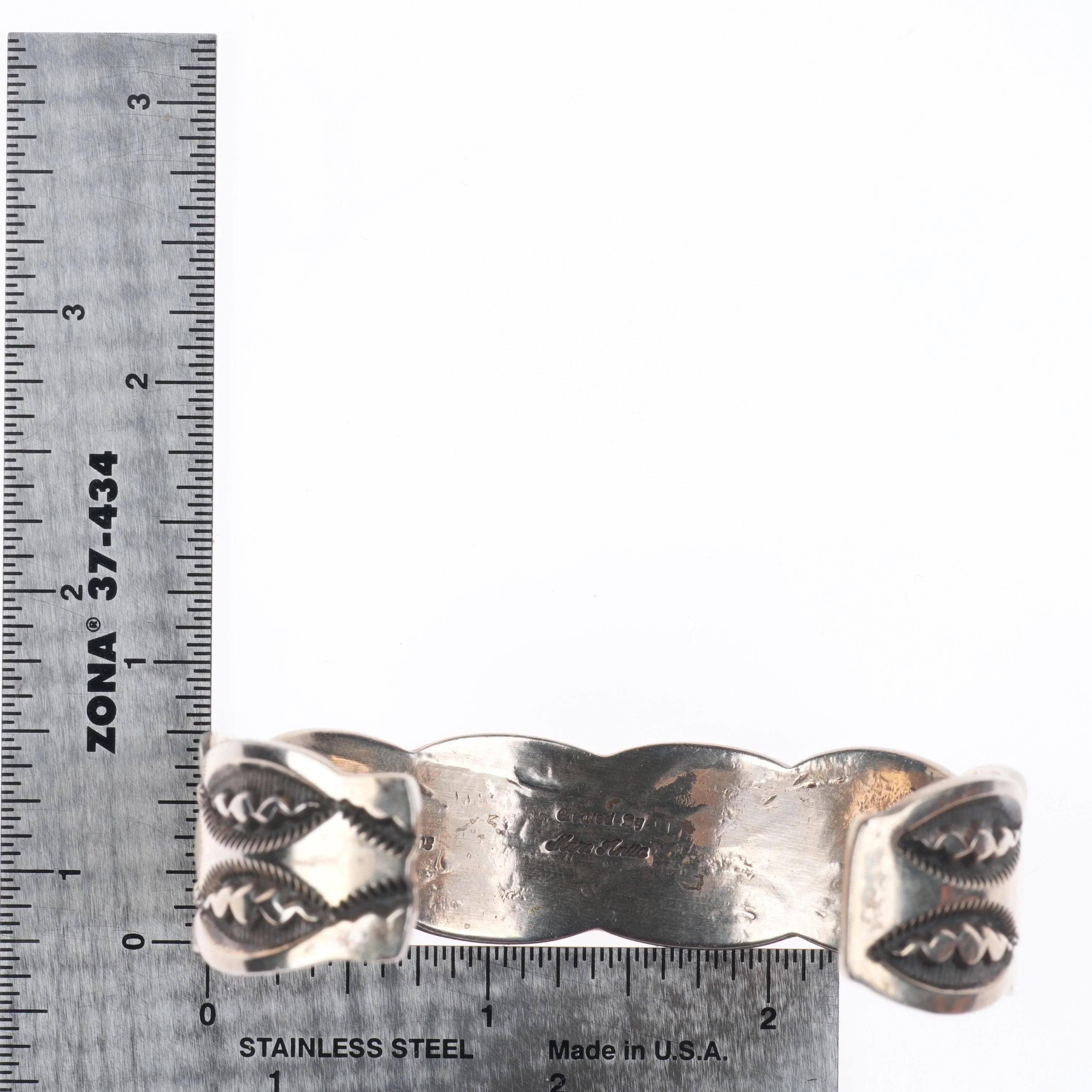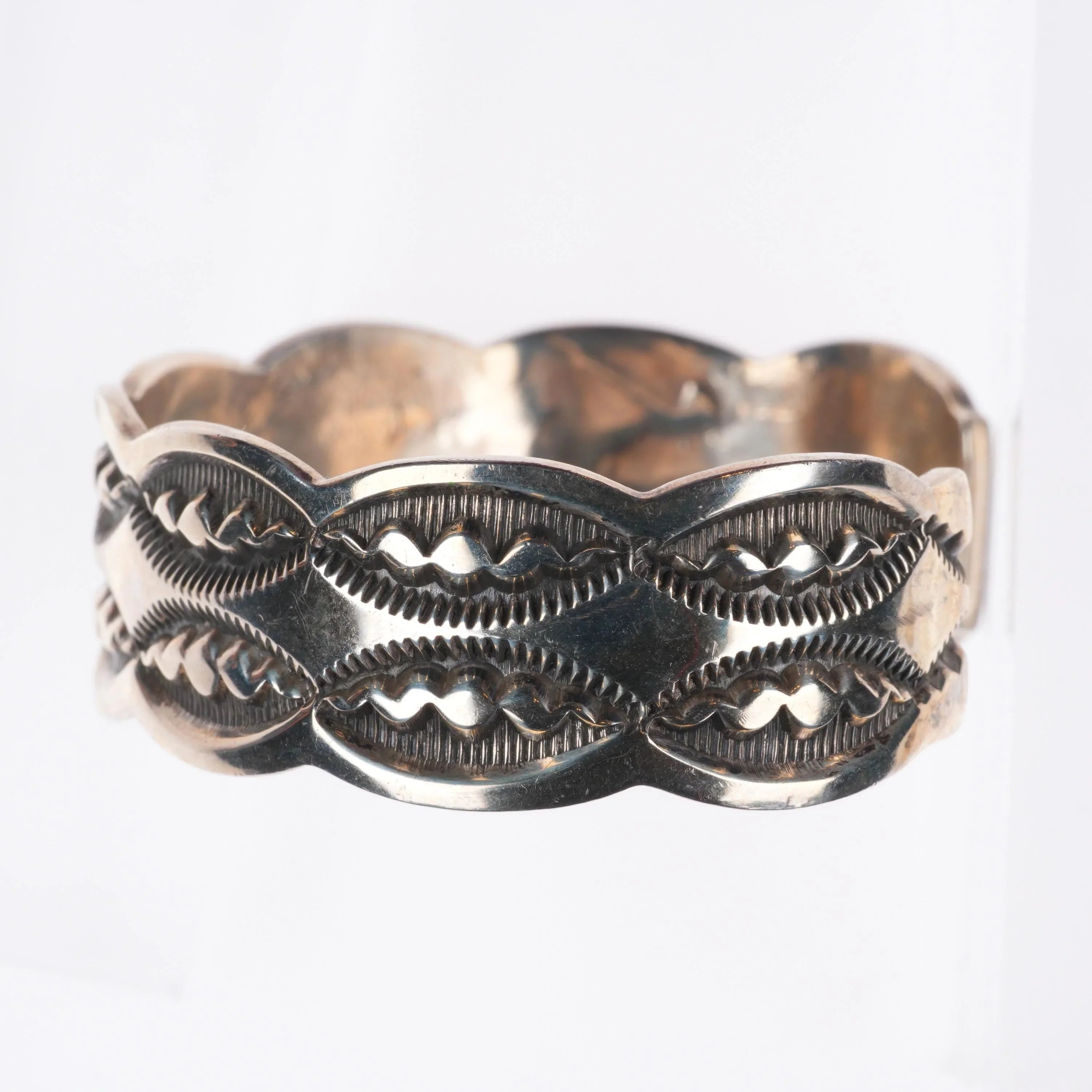 7.1" Marc Antia Apache Heavily stamped sterling silver cuff bracelet. Tested and guaranteed solid sterling silver with weight and measurements in pictures. Good condition, circa last quarter of the 20th century with no damage.