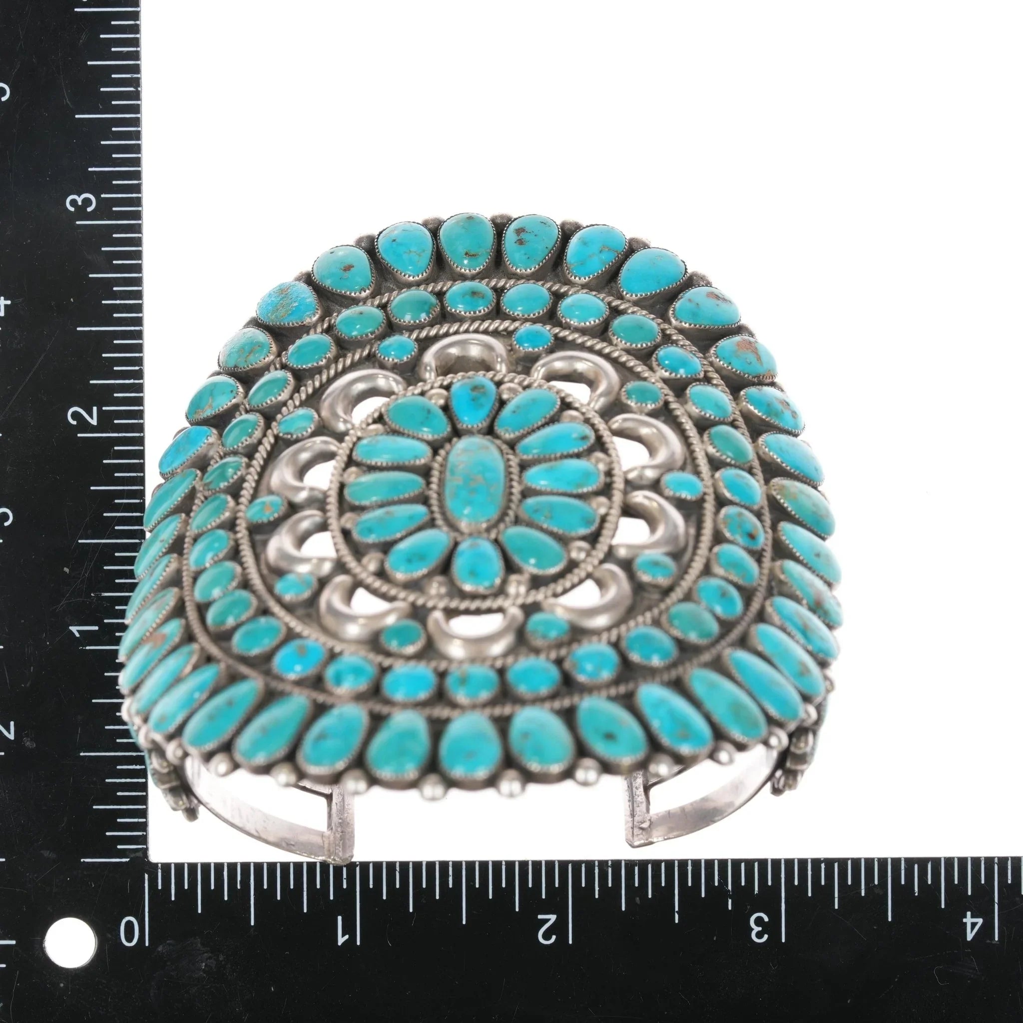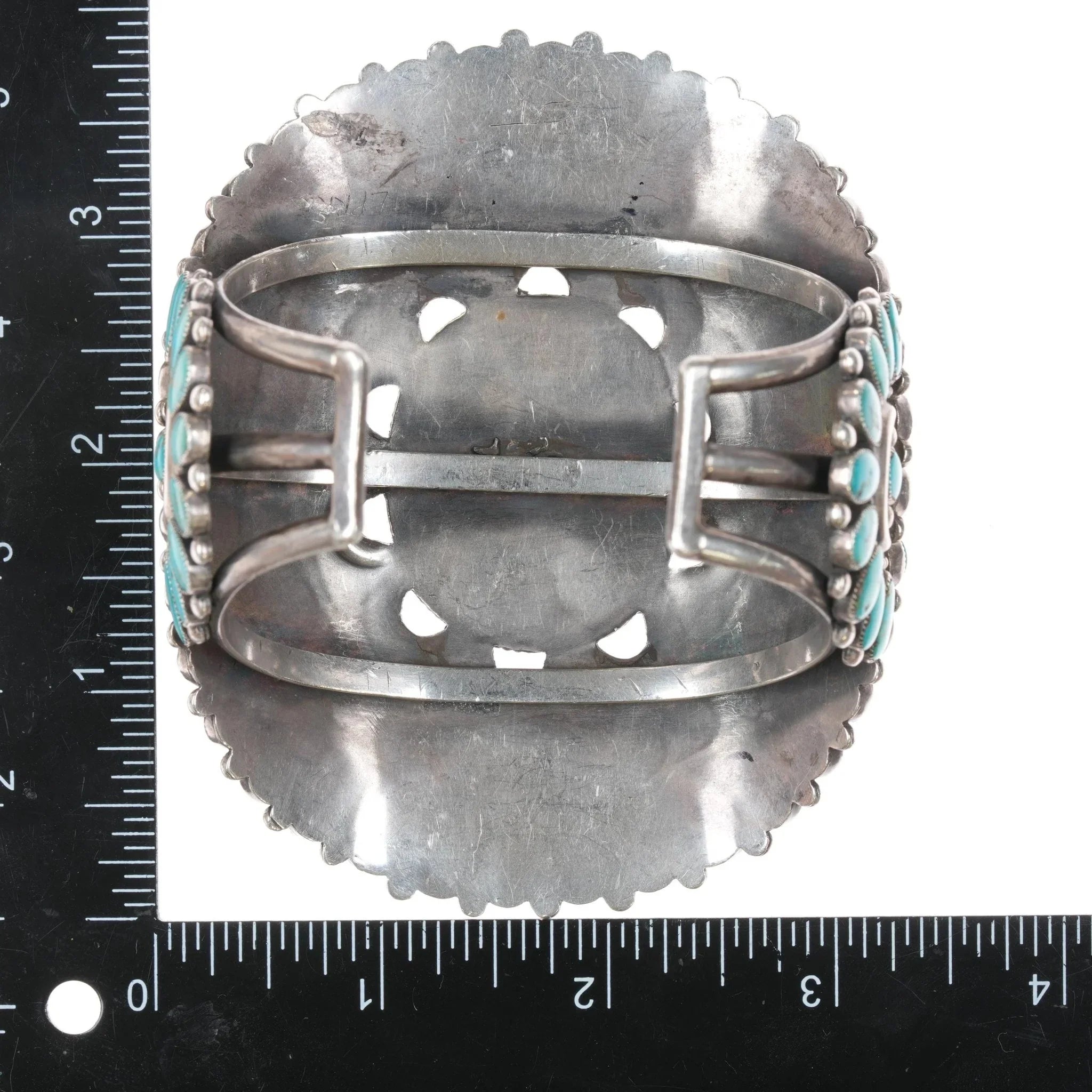 7.25" 40‘s-50‘s Large Ondelacy Blue Gem turquoise cluster cuff bracelet, measurements in pics. No issues, CG Wallace code on reverse side. Nice old bracelet Natural American turquoise, solid sterling silver from the second quarter of the 20th century.