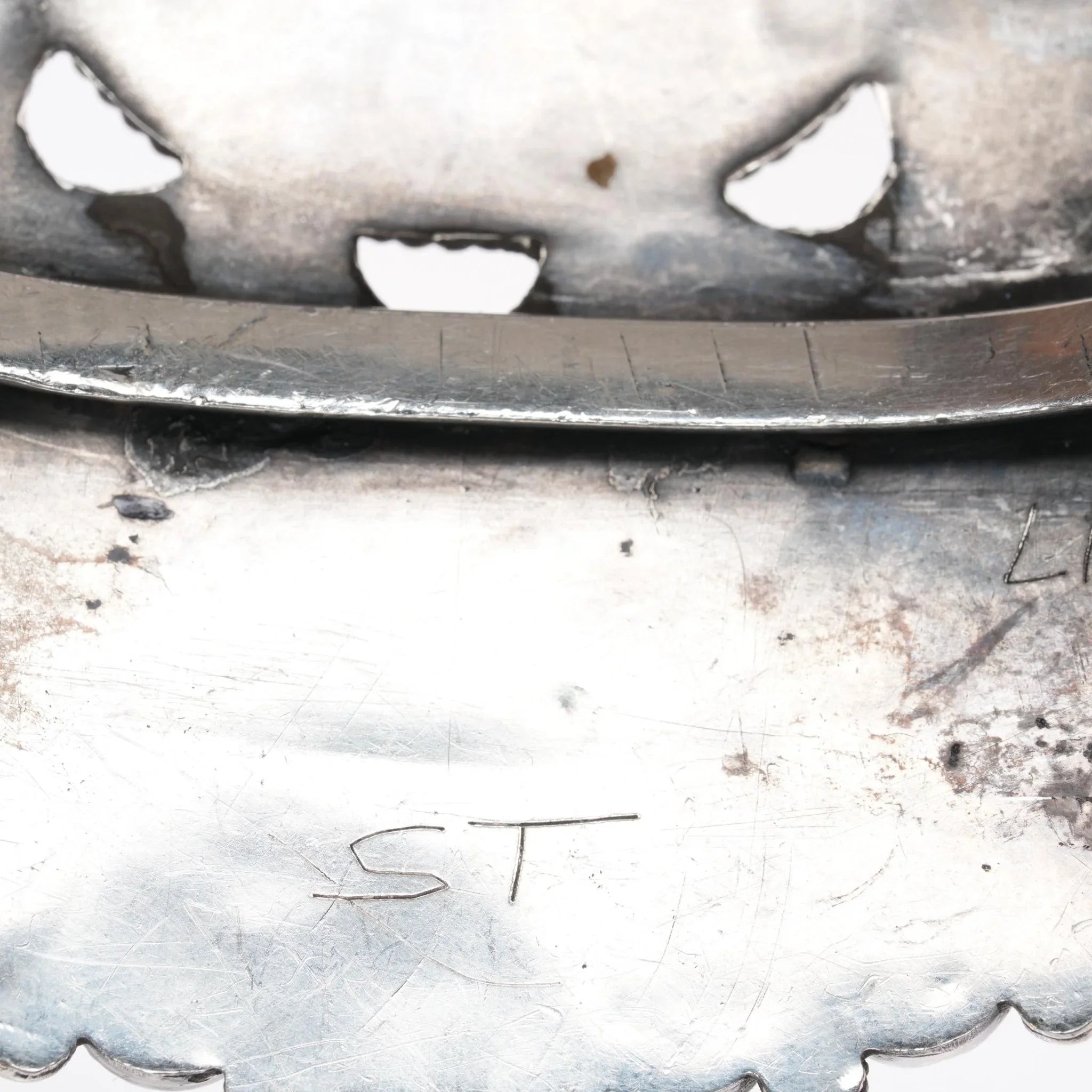 ONDELACY, WARREN & DORIS (Zuni, active.1940-1960‘s). Specialized in large Zuni cluster work. Warren was considered a master silversmith along with his wife Doris. Recognizable techniques of silver repousse work often accompanied their designs along with the consistent use of high quality materials. Trader C. G. Wallace, retained many of the Ondelacy‘s pieces for his private collection.