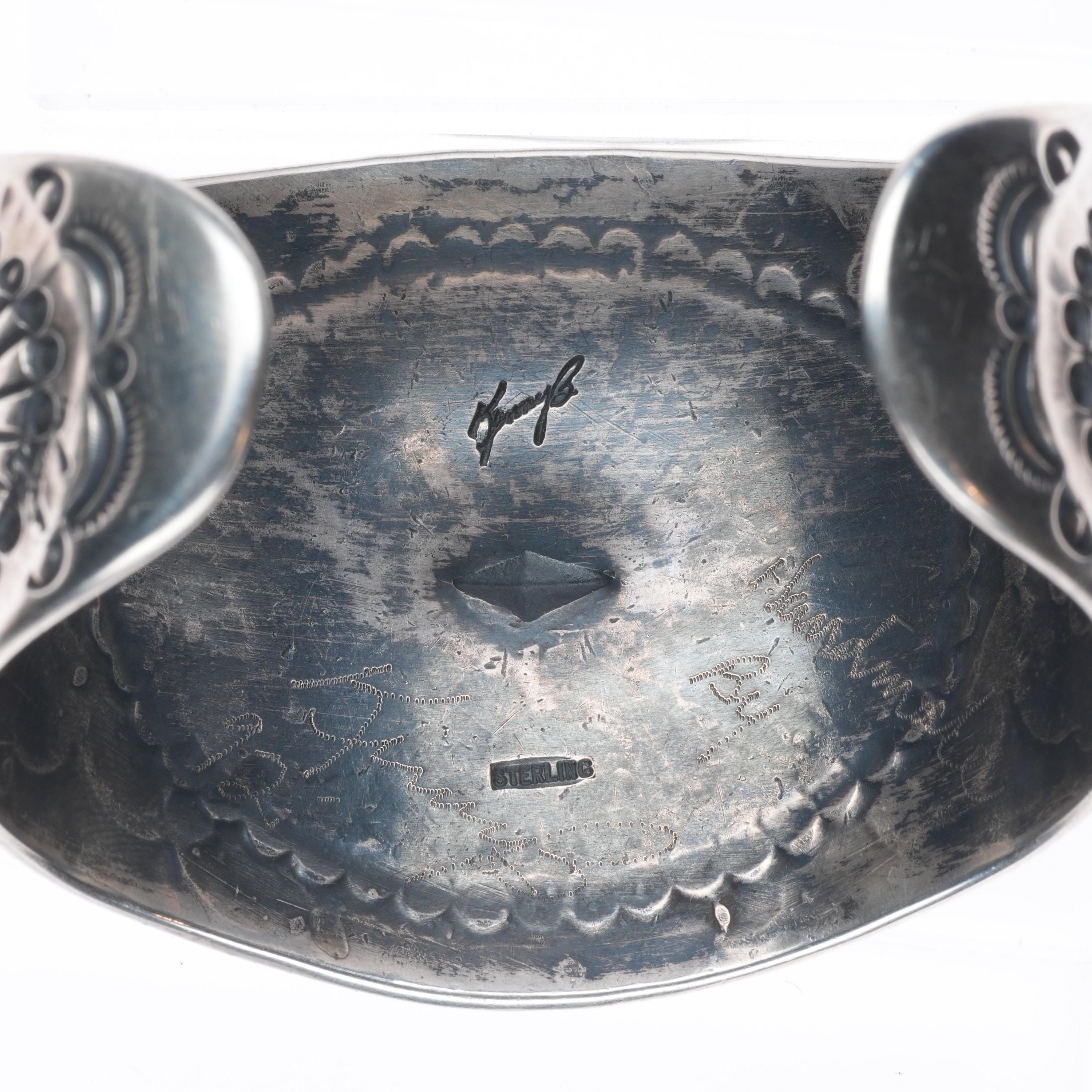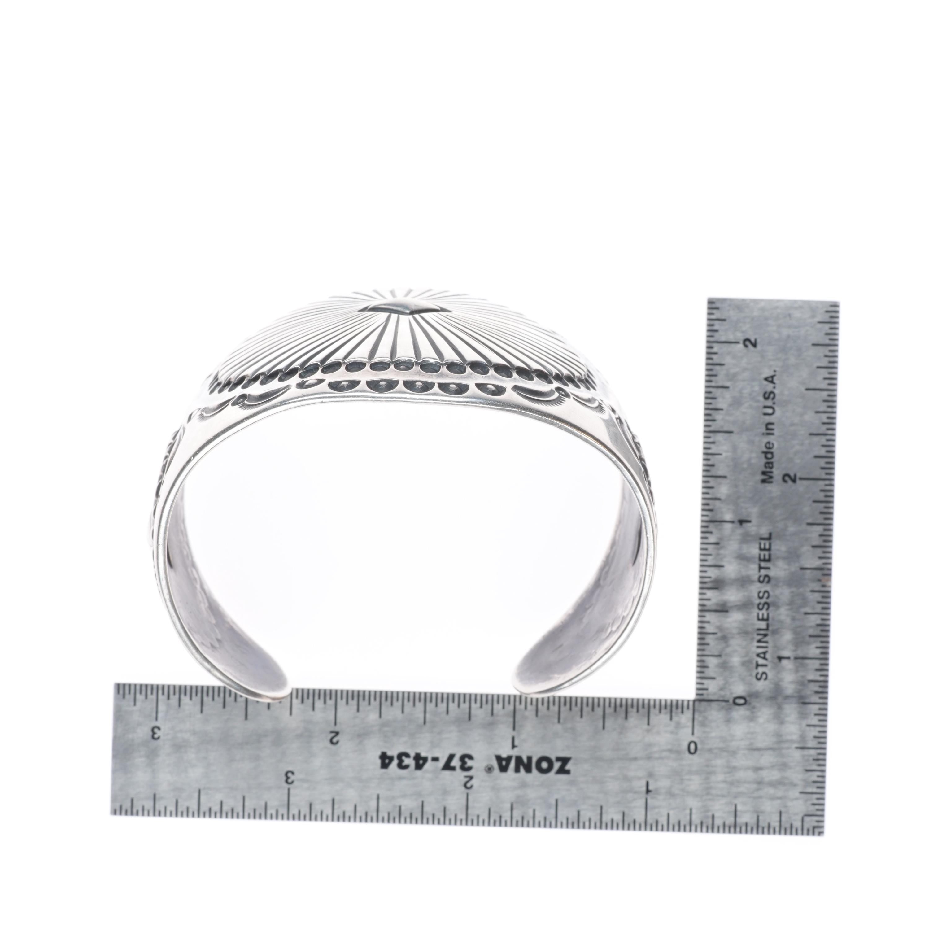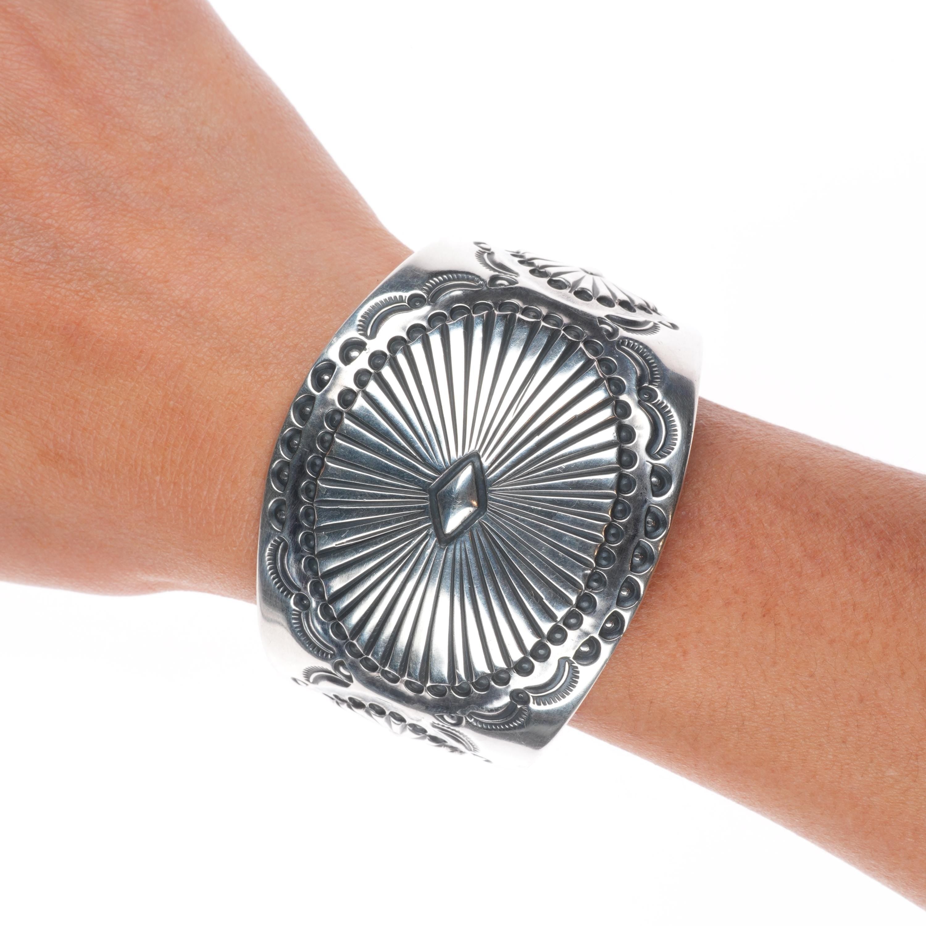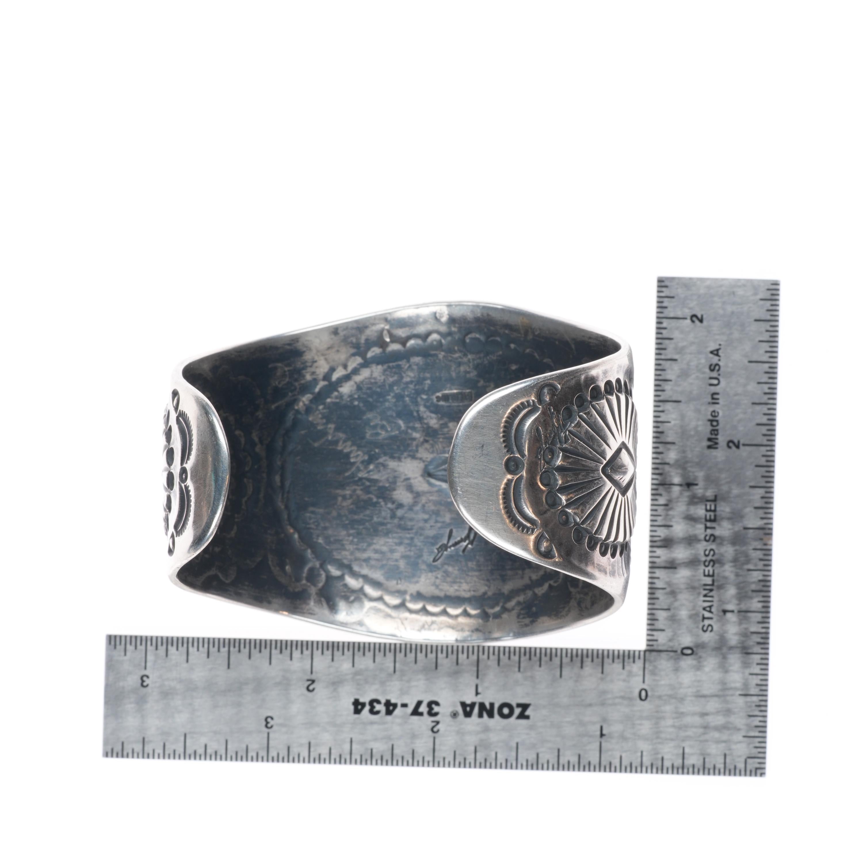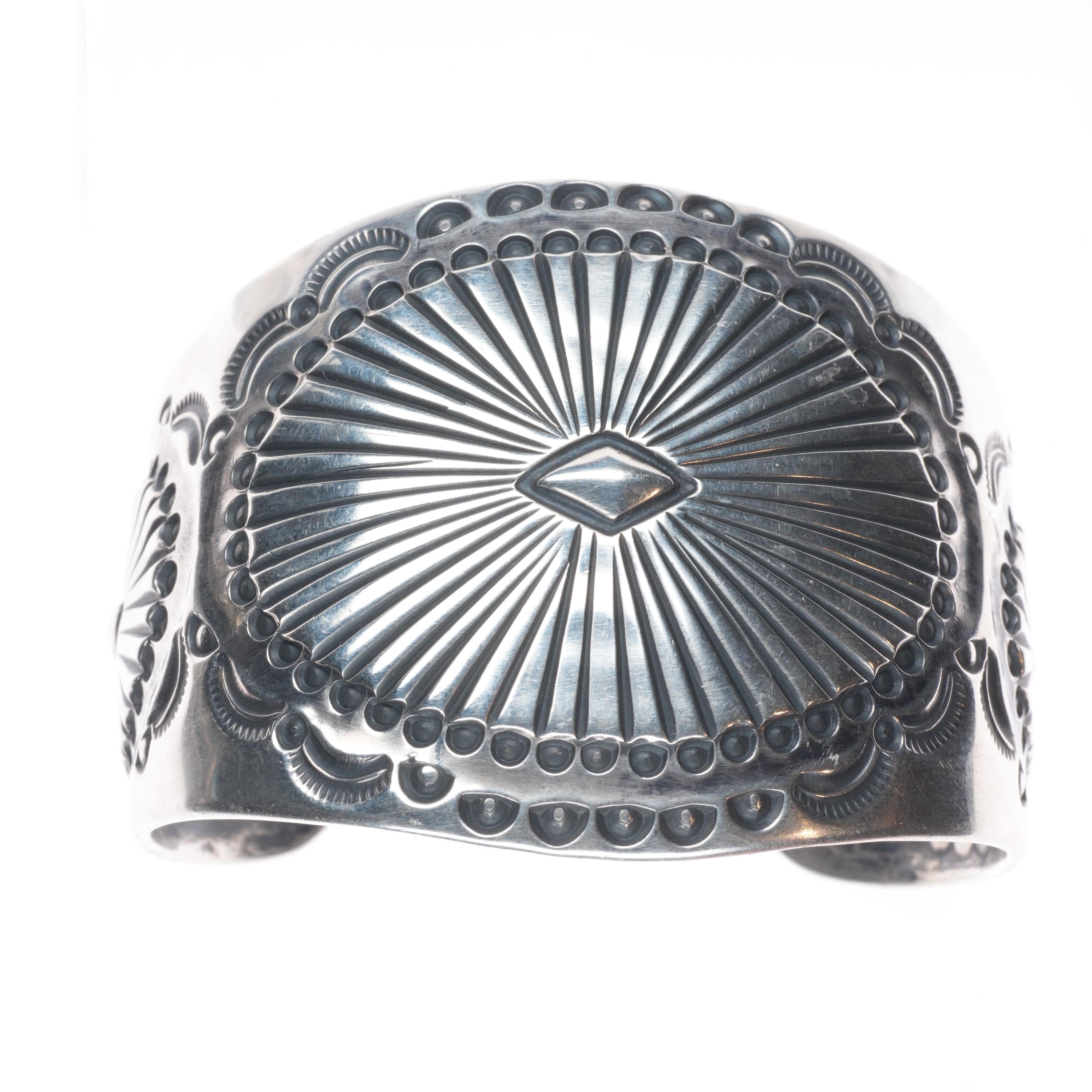 7.25" Kenny Bracken deep stamped southwestern sterling silver wide cuff bracelet. Tested and guaranteed solid sterling silver with weight and measurements in pictures. Circa last quarter of the 20th century with age appropriate wear.. Very skilled anglo artist who‘s work is only offered by the highest end galleries.