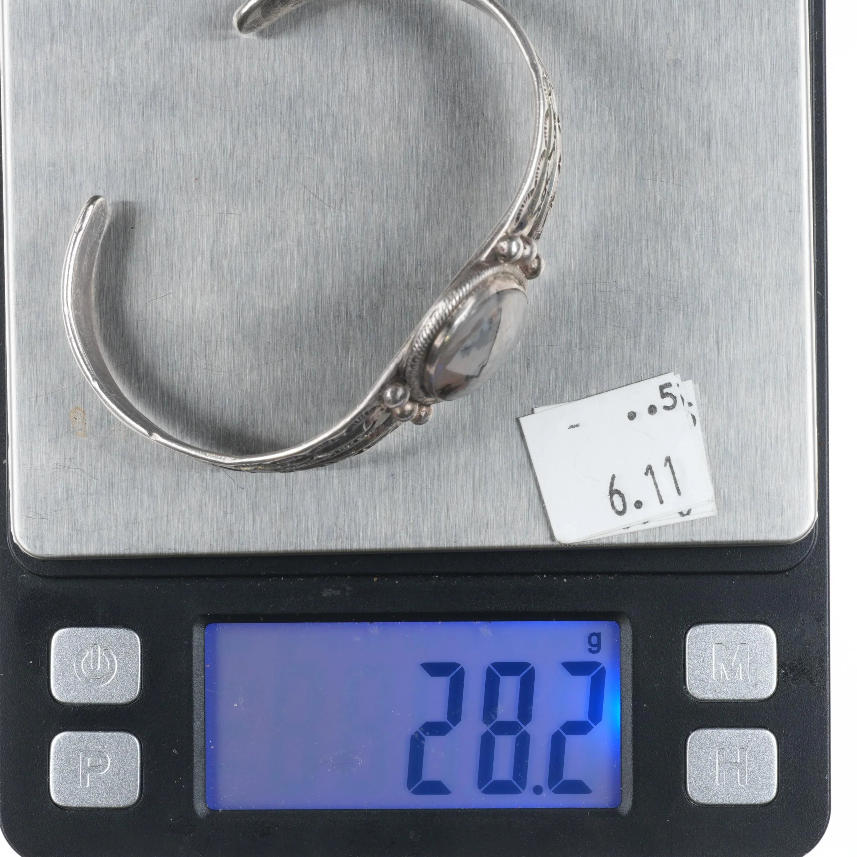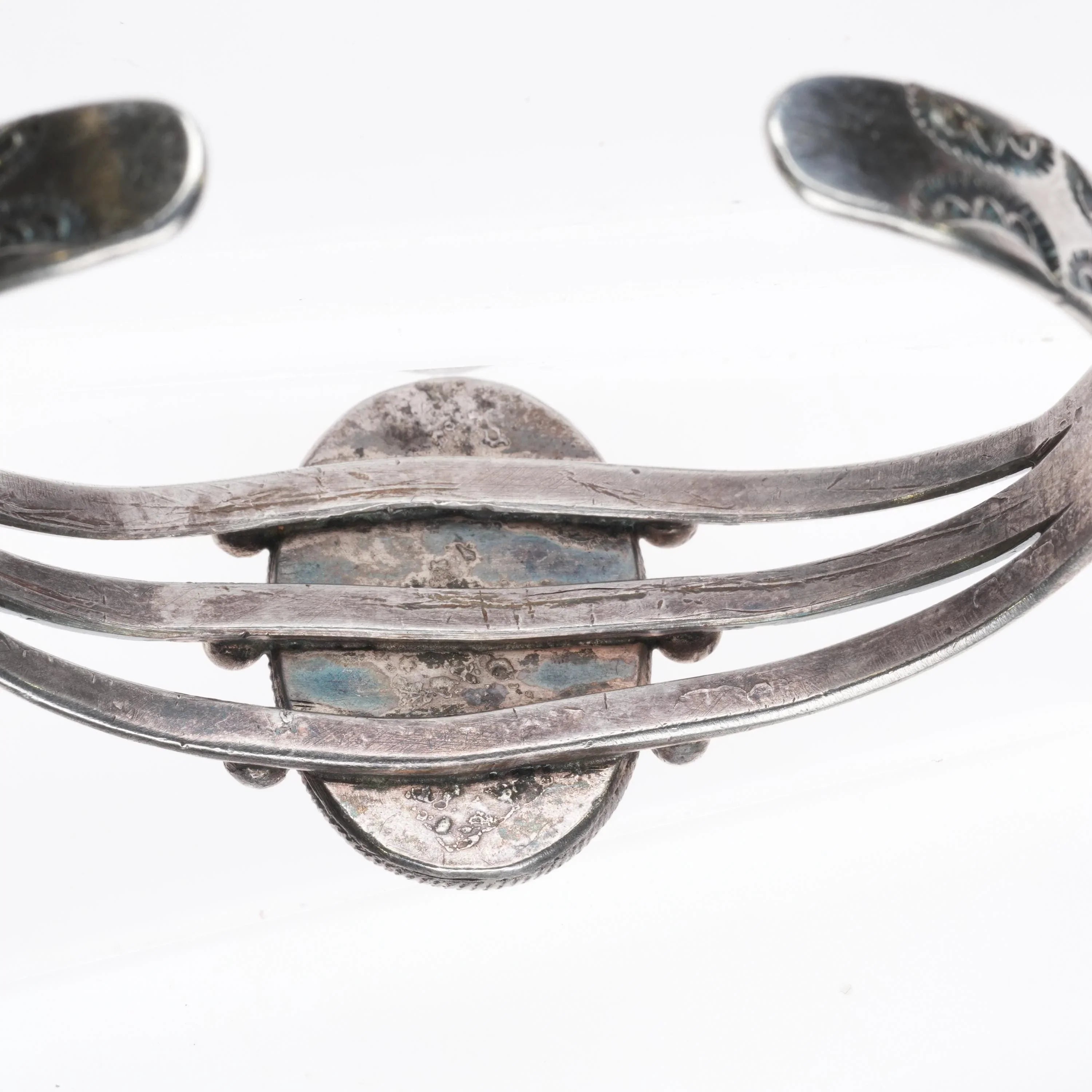 7" 30‘s-40‘s Navajo petrified wood stamped sterling silver cuff bracelet. Tested and guaranteed solid sterling silver with no hallmarks which is common with Native American jewelry of this era. Weight and measurements in pictures. Some expected wear, no cracks or breaks. Circa second quarter of the 20th century by unknown artist.
