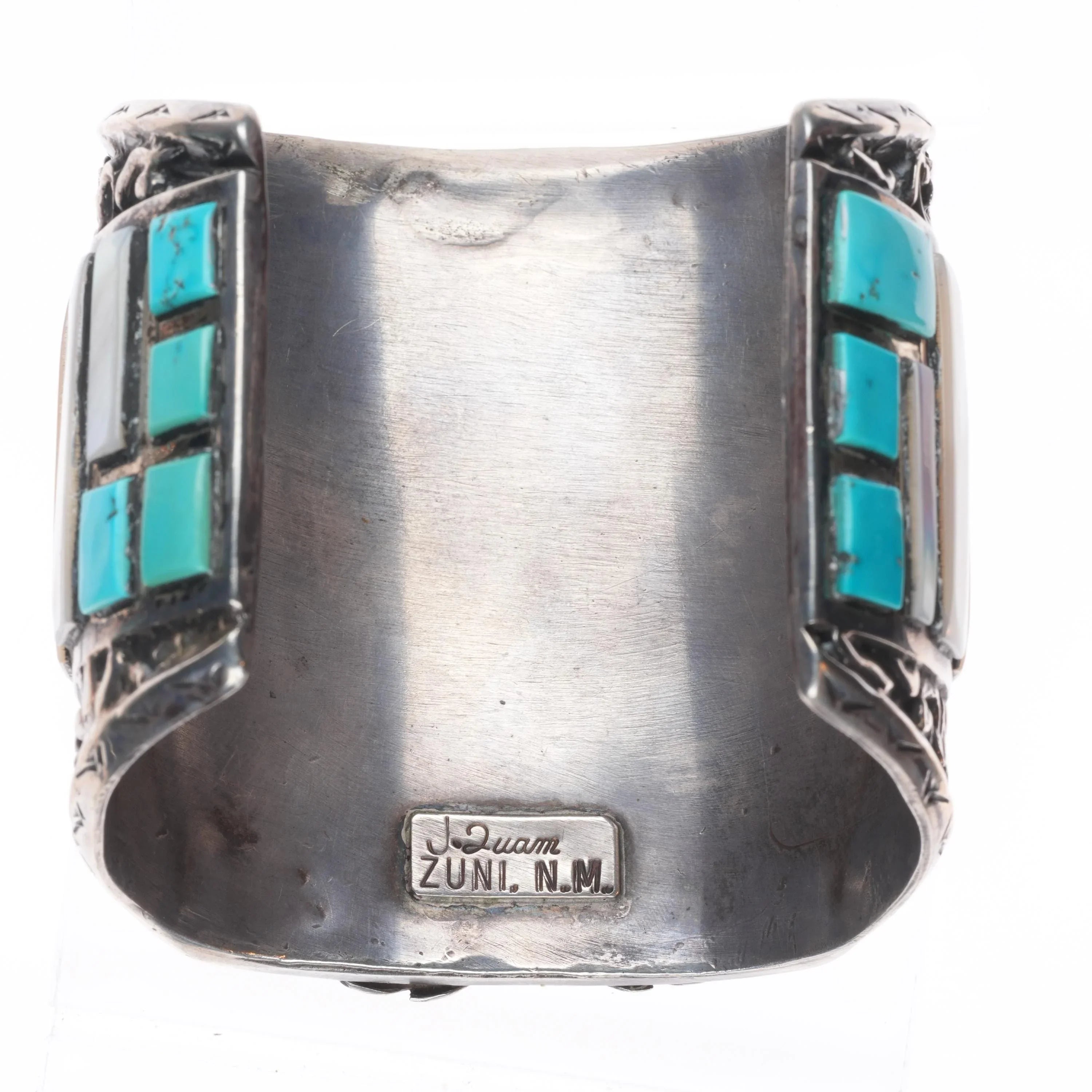 7.5" Huge J Quam Zuni Vintage Bighorn Sheep sterling silver inlay cuff bracelet. Tested and guaranteed solid sterling silver with weight and measurements in pictures. Circa third quarter of the 20th century. Amazing bracelet in clean condition with no issues.