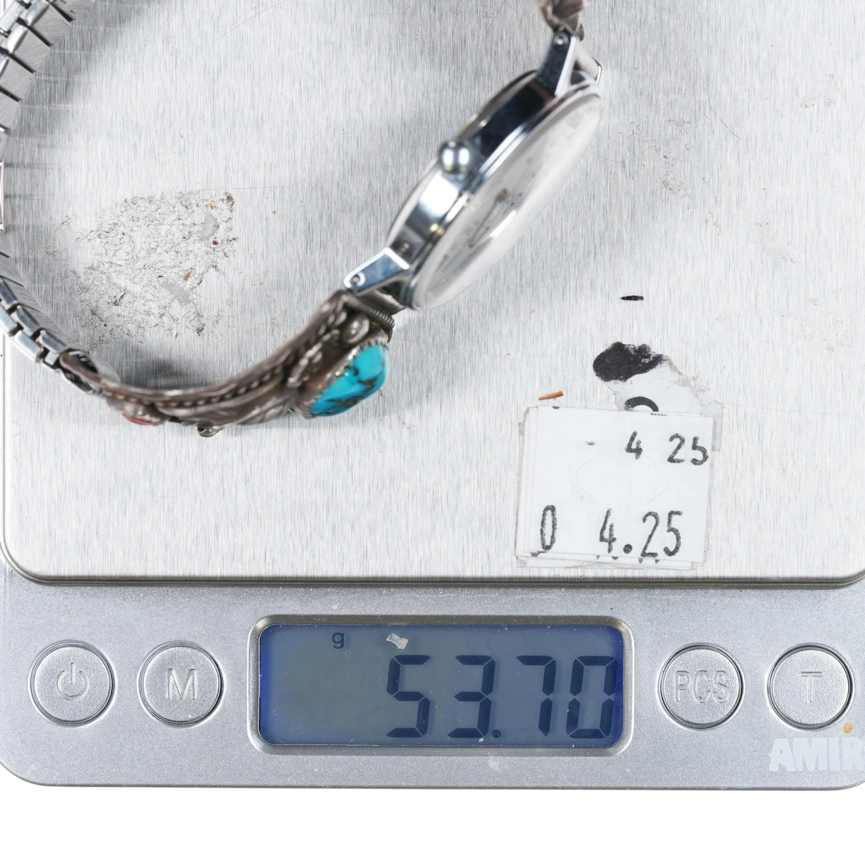 7" SC Navajo 70‘s-80‘s Sterling silver watch tips w/turquoise/coral. Solid sterling silver tips, watch is currently running. Band stretches wider to put it on.