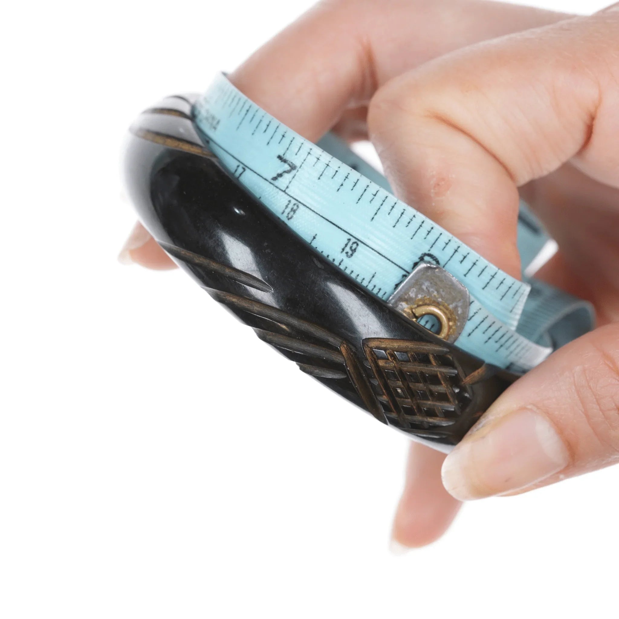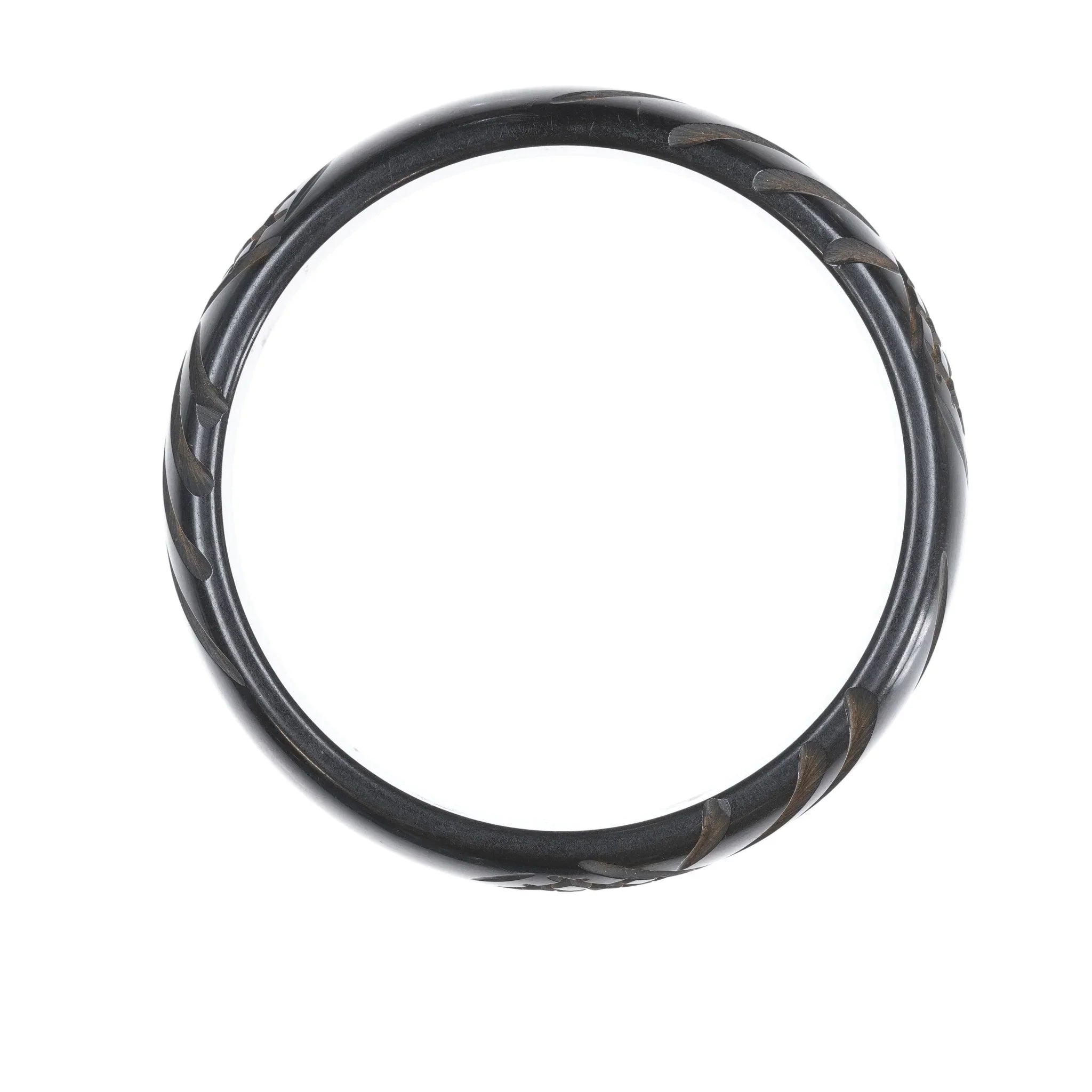 8" c1940's Carved black bakelite bangle, fun with no issues. Very well preserved authentic item from an extensive long time collection put together in the last quarter of the 20th century. Shown on a 6" women's wrist. Measurements in pics.
