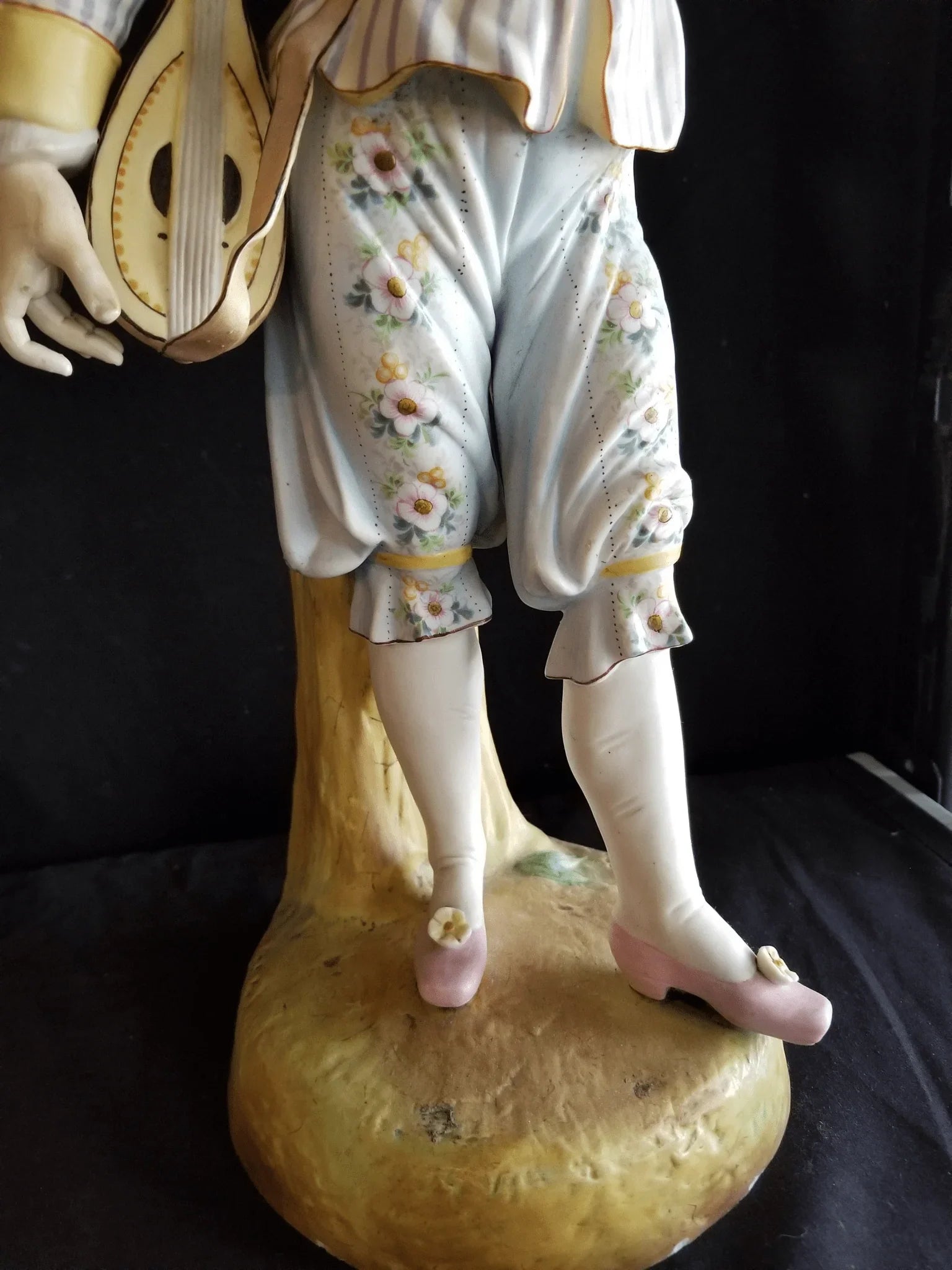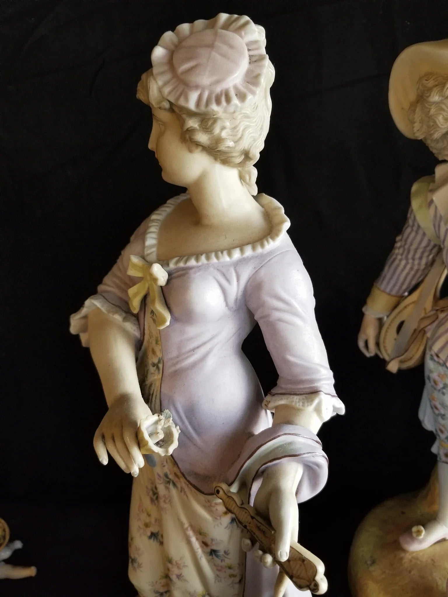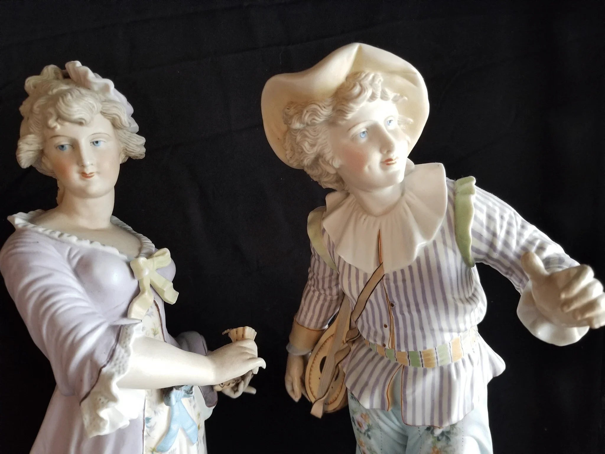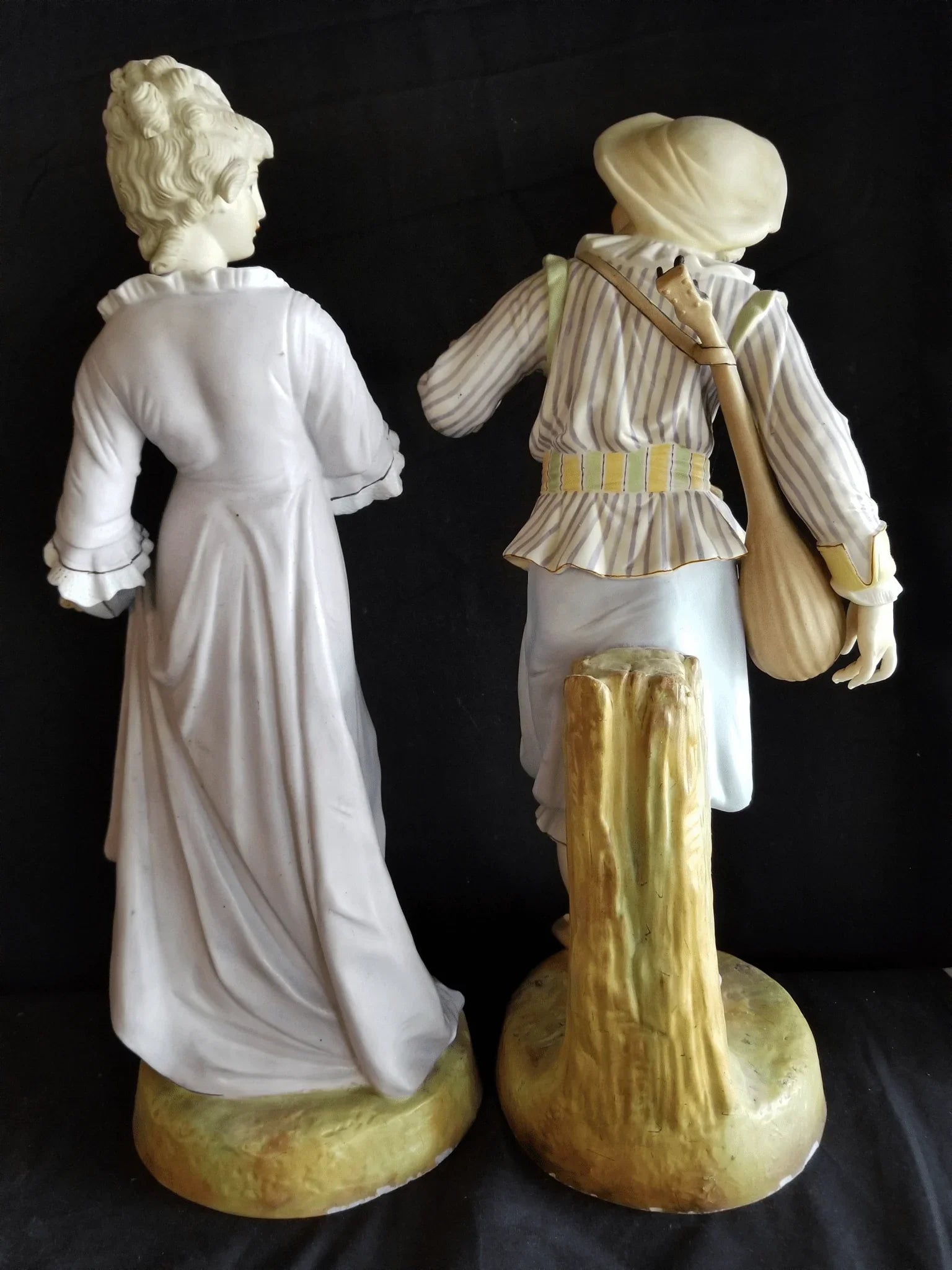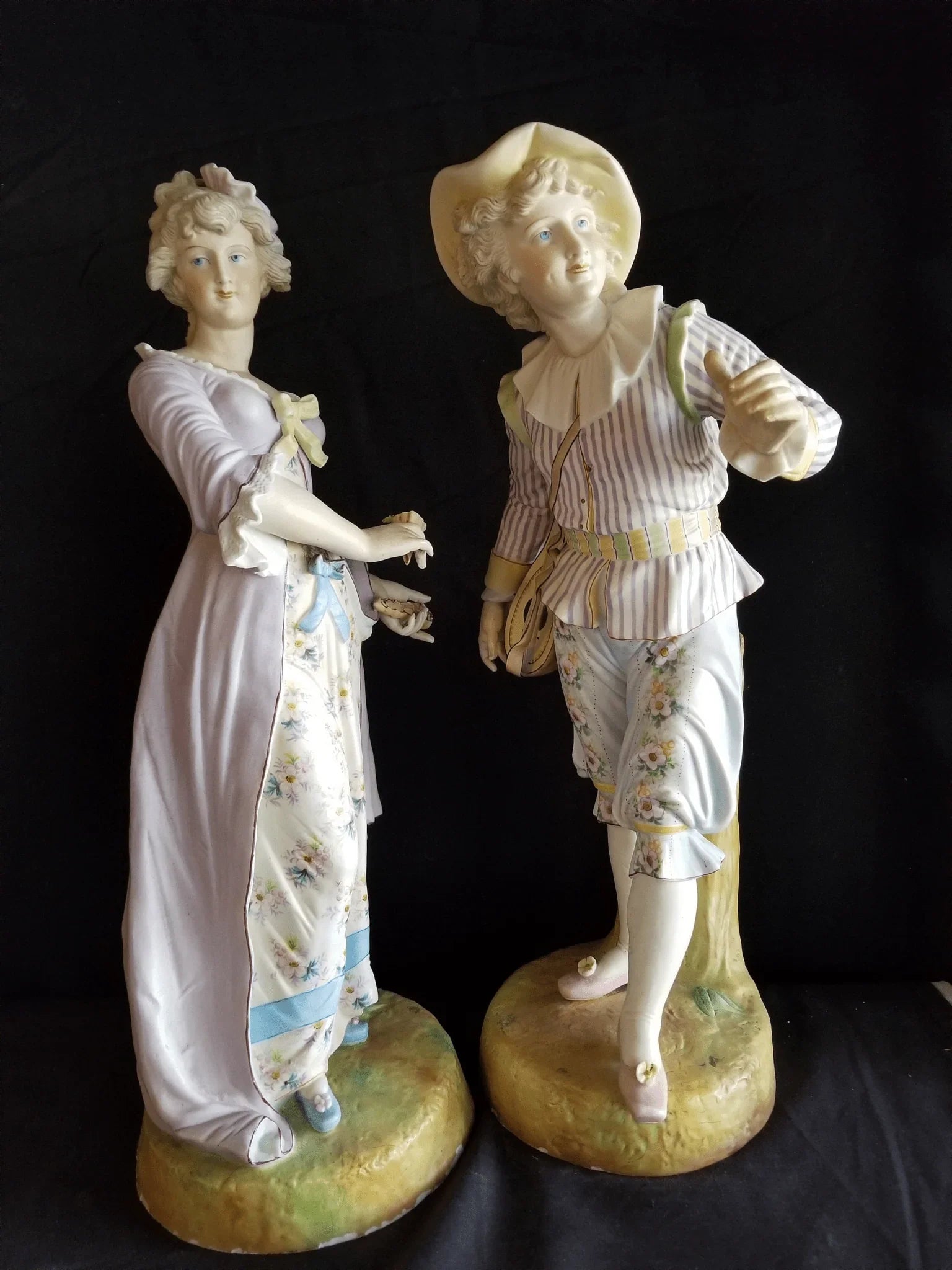 The man is 17.5" with some minor nicks on the base rim and a small chip on the<br>flower on one shoe, also his hand sticking out has been professionally restored.<br>The lady is 17" and had small chips on base rim and it appears there may have<br>been a bouquet in the cone in her right hand. No other damage. They're both<br>guaranteed c.1860-1890.<br><br>These are very heavy, basically sculptures. They weigh 9 pounds together.