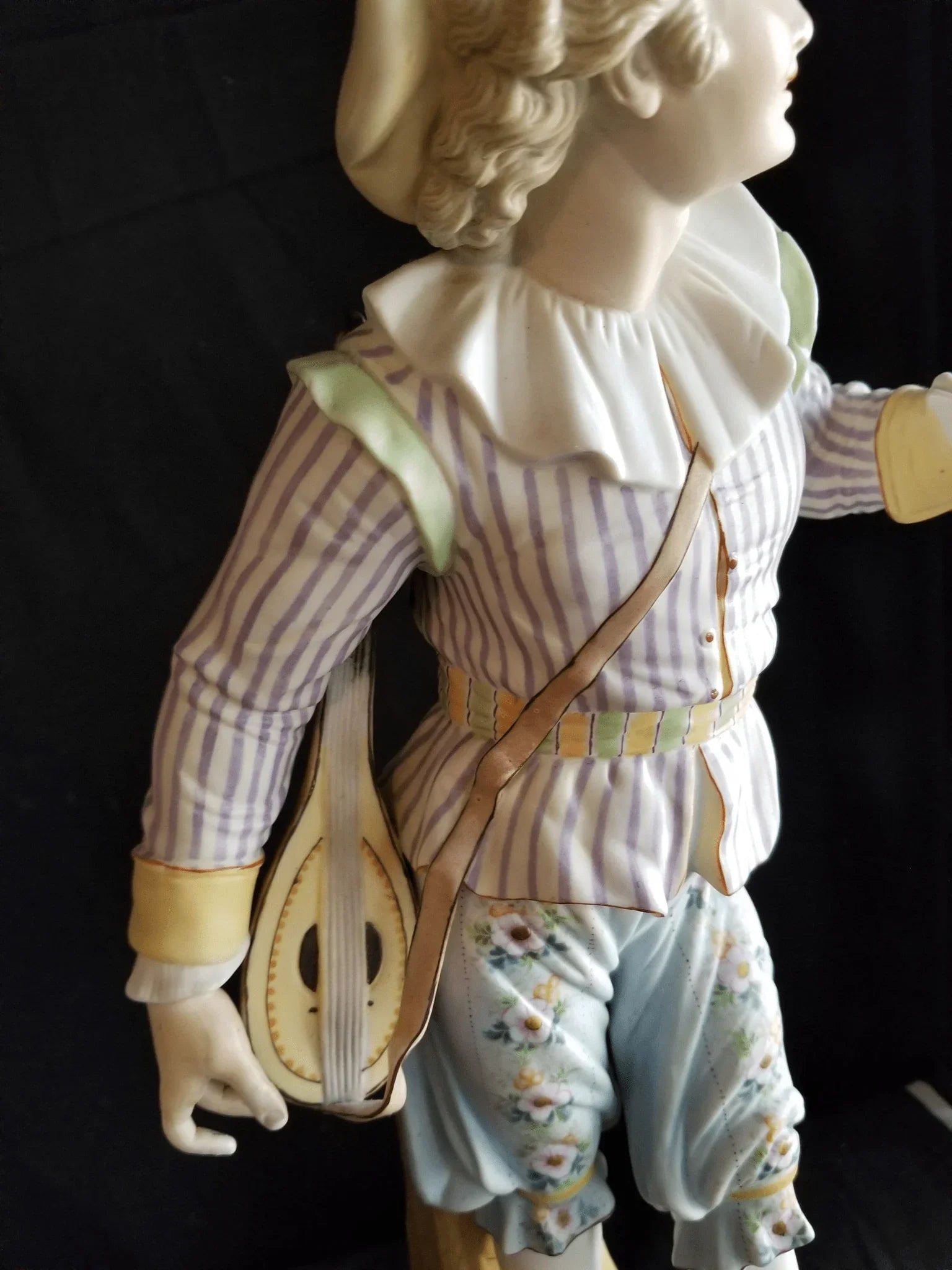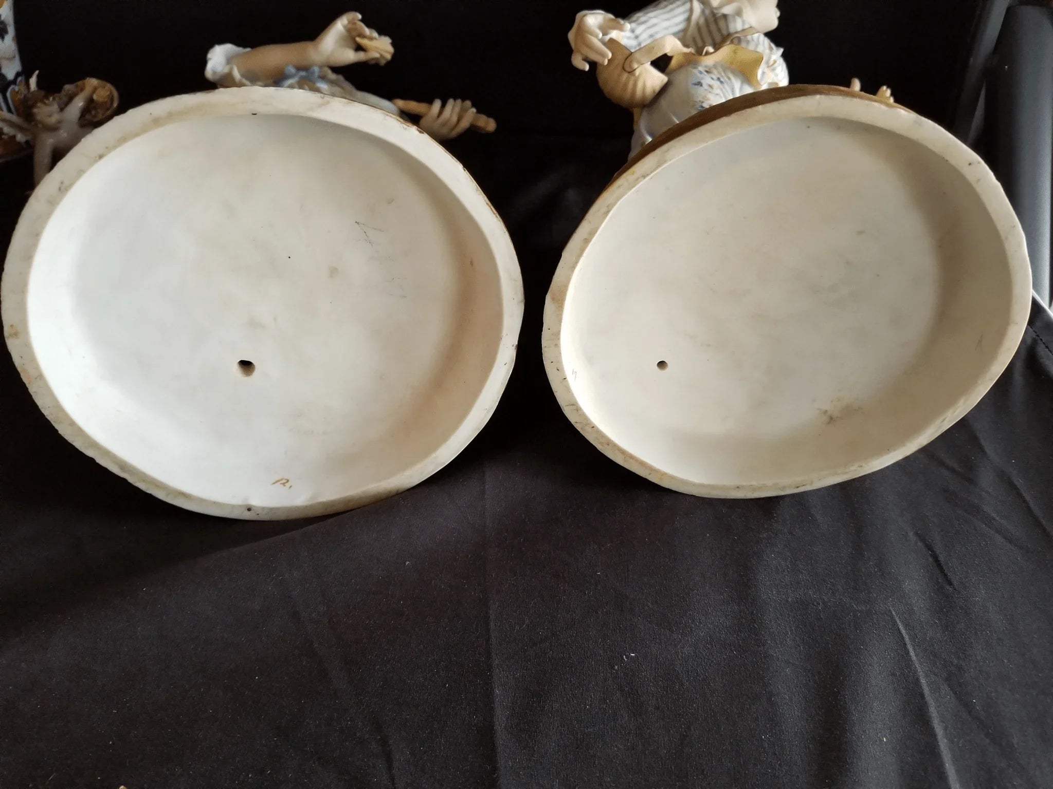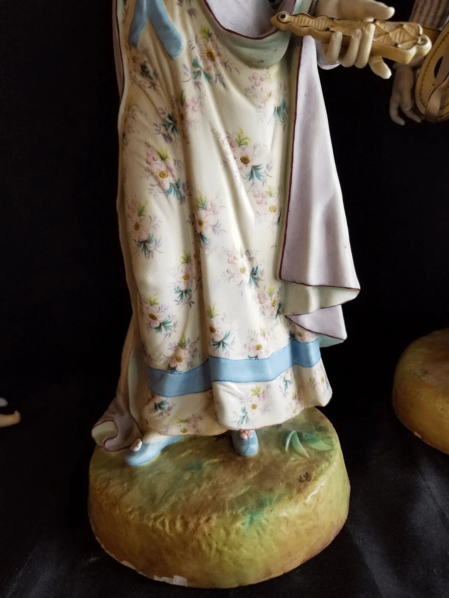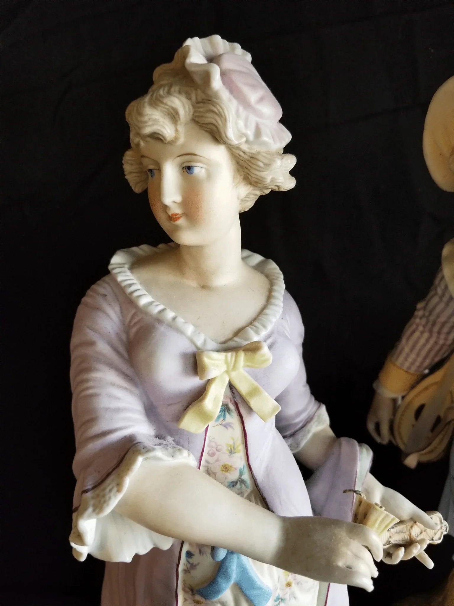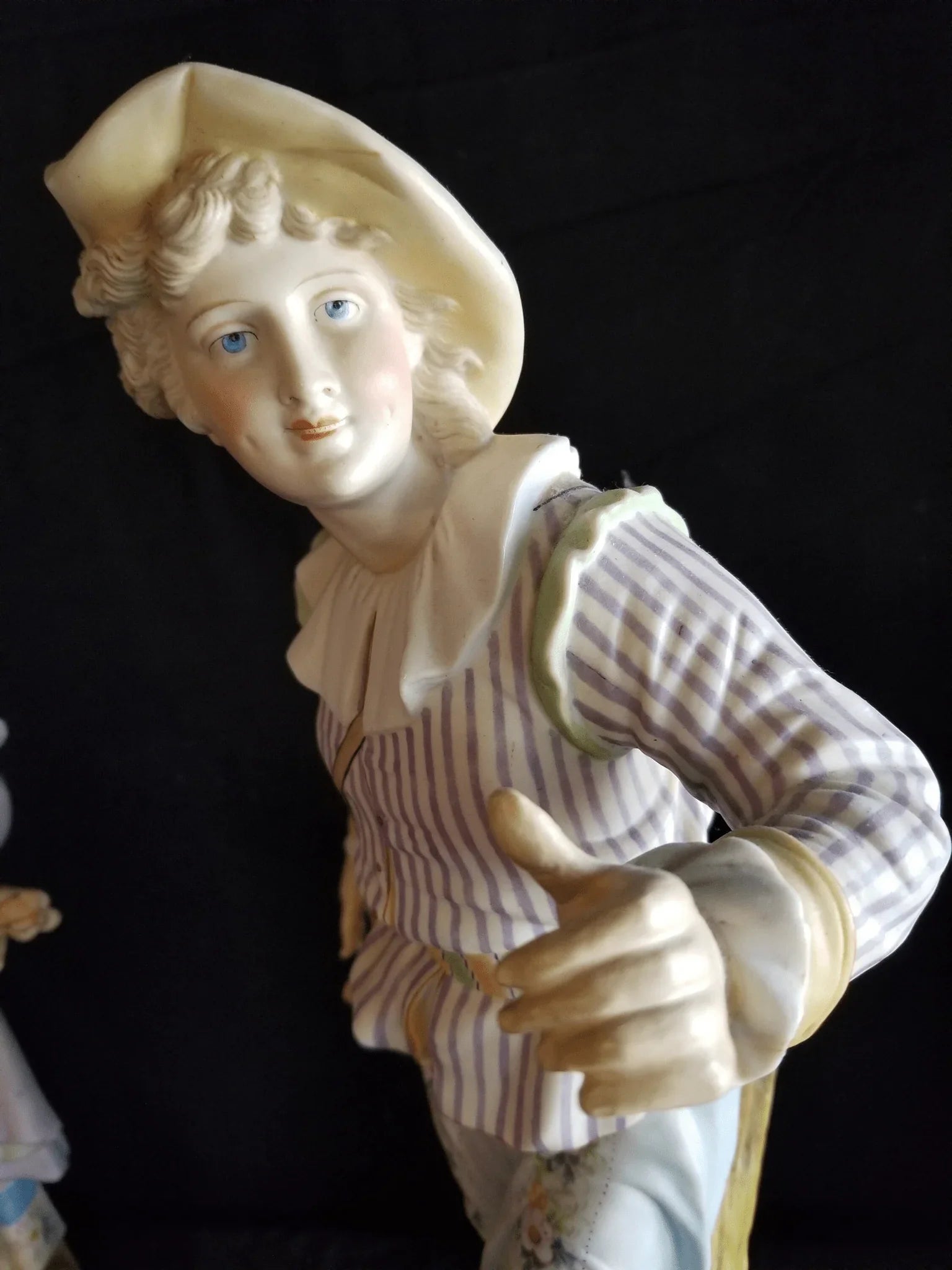 The man is 17.5" with some minor nicks on the base rim and a small chip on the<br>flower on one shoe, also his hand sticking out has been professionally restored.<br>The lady is 17" and had small chips on base rim and it appears there may have<br>been a bouquet in the cone in her right hand. No other damage. They're both<br>guaranteed c.1860-1890.<br><br>These are very heavy, basically sculptures. They weigh 9 pounds together.