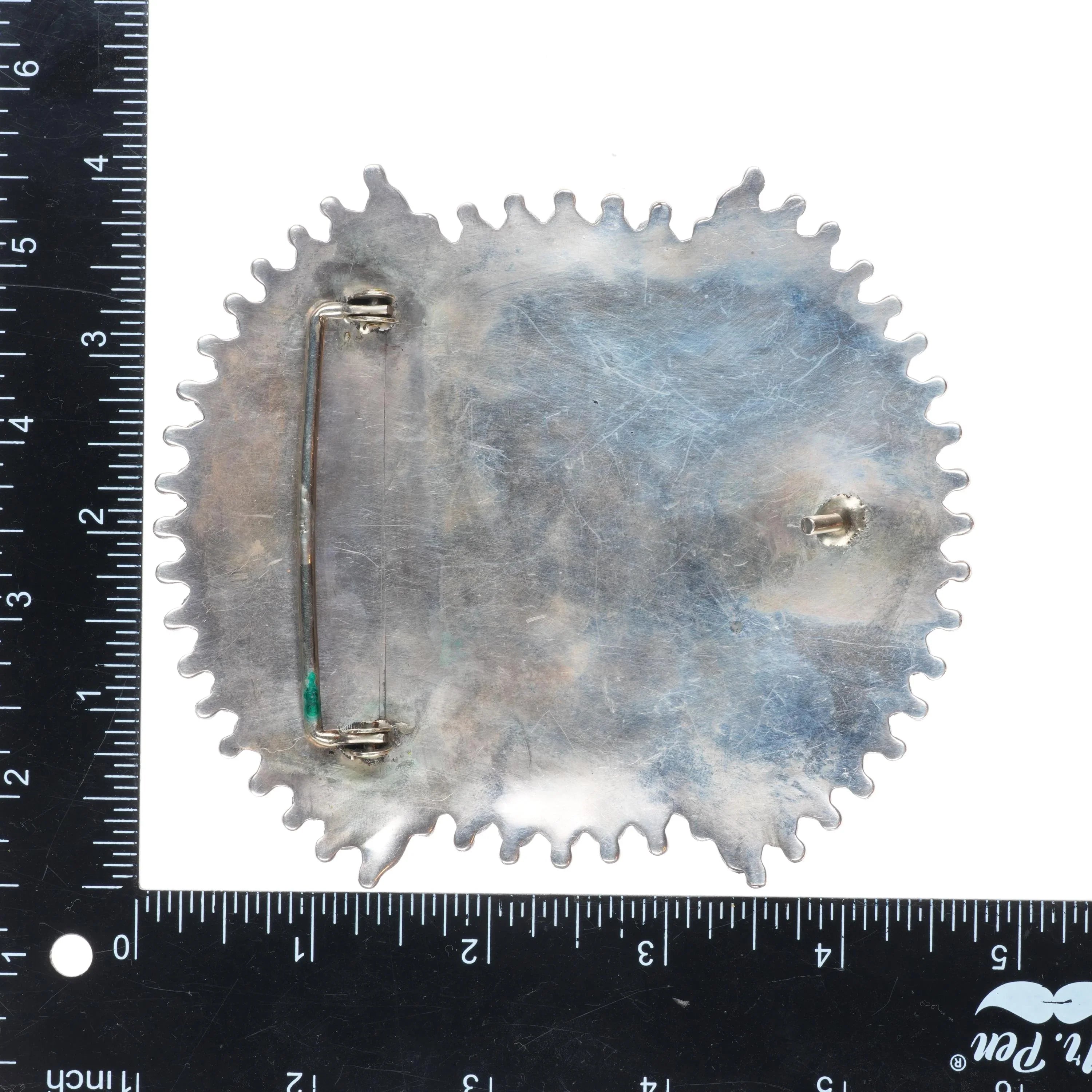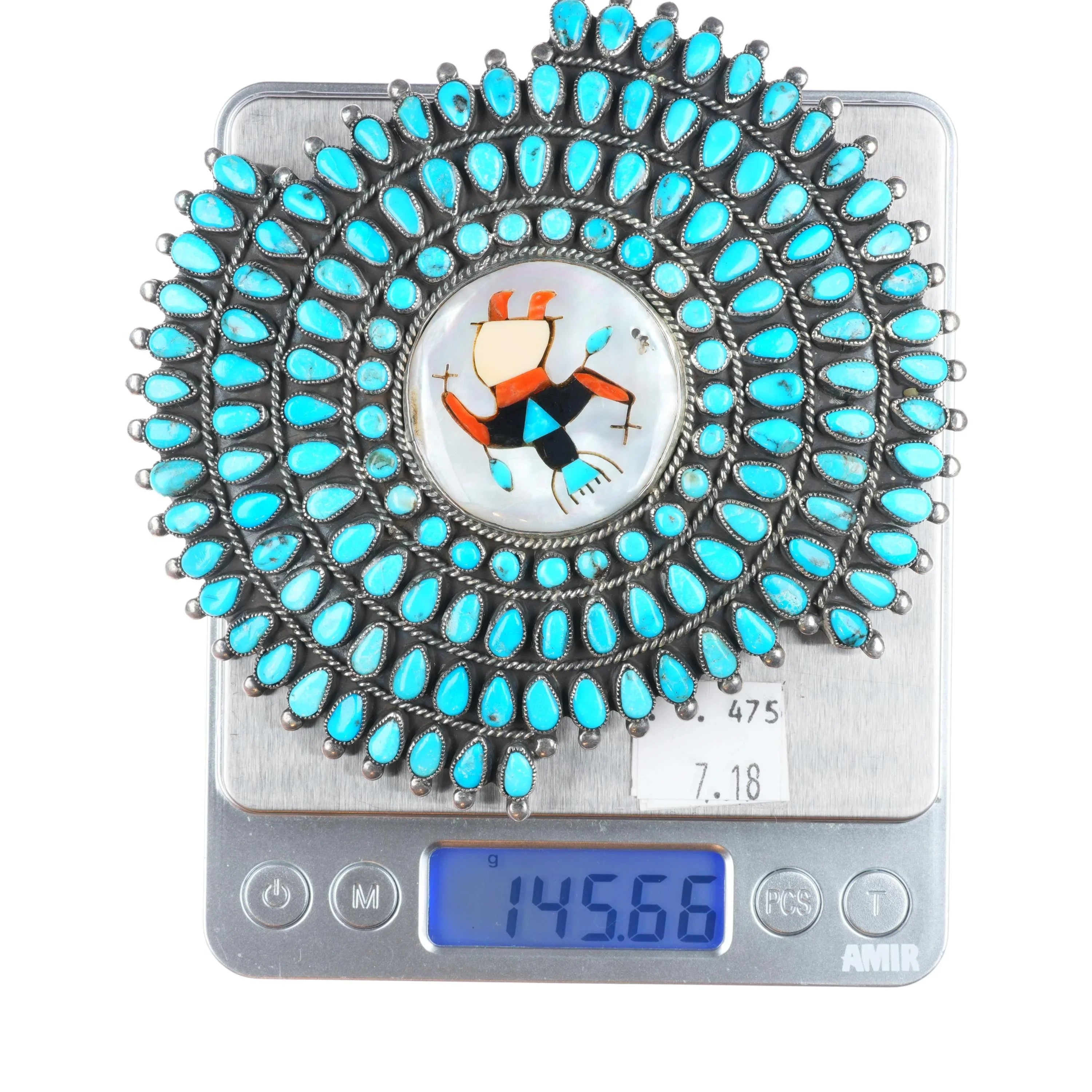 Big Vintage Zuni sterling silver turquoise cluster belt buckle Ghan dancer inlay. Unmarked, attributed to Valentino & Matilda Banteah Zuni. Fits up to a 2.25" belt. Tested and guaranteed solid sterling silver with weight and measurements in pictures. Fully functional. All items will likely have some age appropriate/expected wear, the older they are the more wear they should have. Circa second quarter of the 20th century. Apparently unmarked.