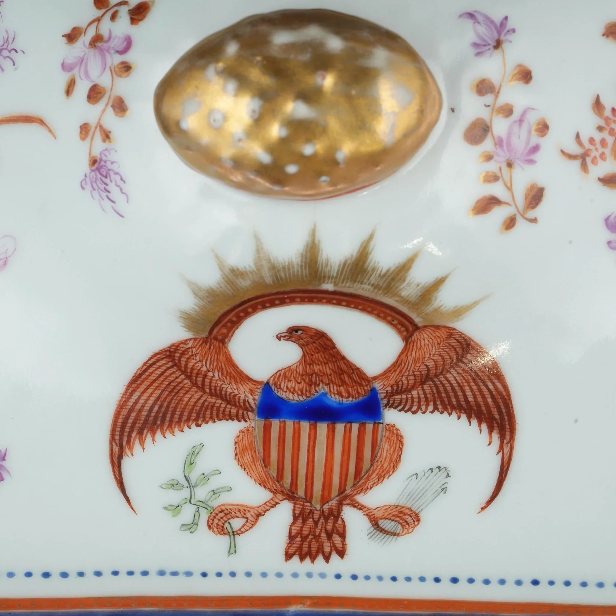 c1820 Chinese Export porcelain US American Market Patriotic Eagle serving covered vegetable. Some slight expected wear to gold/enamel. No damage or restorations but the lid does not fit perfectly, I believe it‘s original to this piece and always been like this. Honestly it wouldn‘t be difficult to take a dremel or grinder and just take a bit off in maybe two places and it would fit perfectly, as of now it does not completely rest in it‘s place.