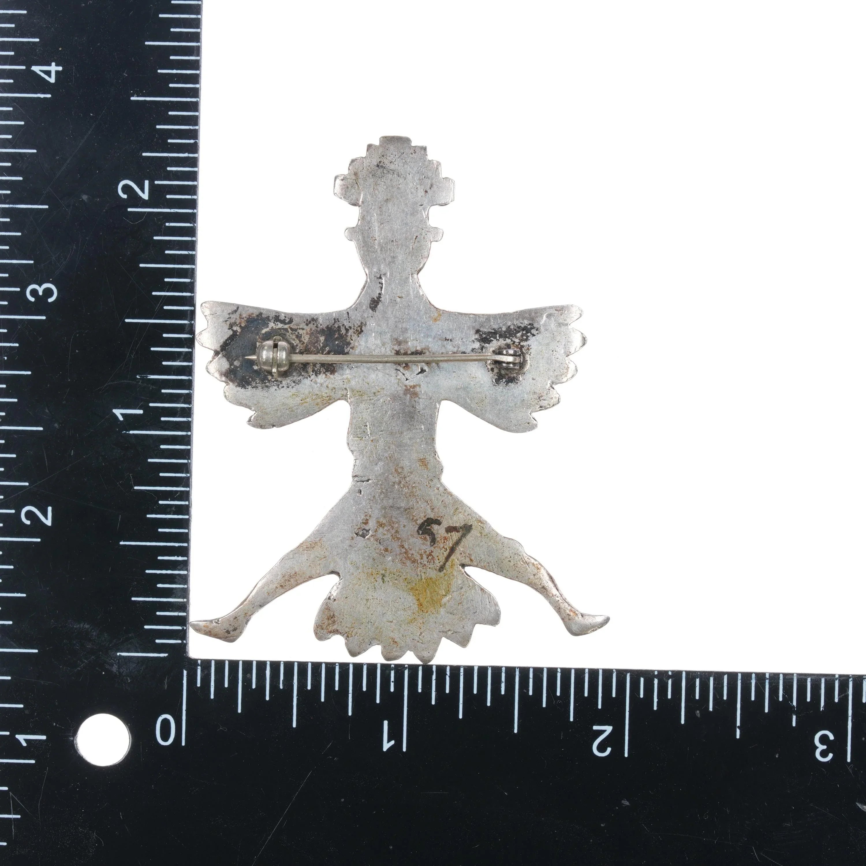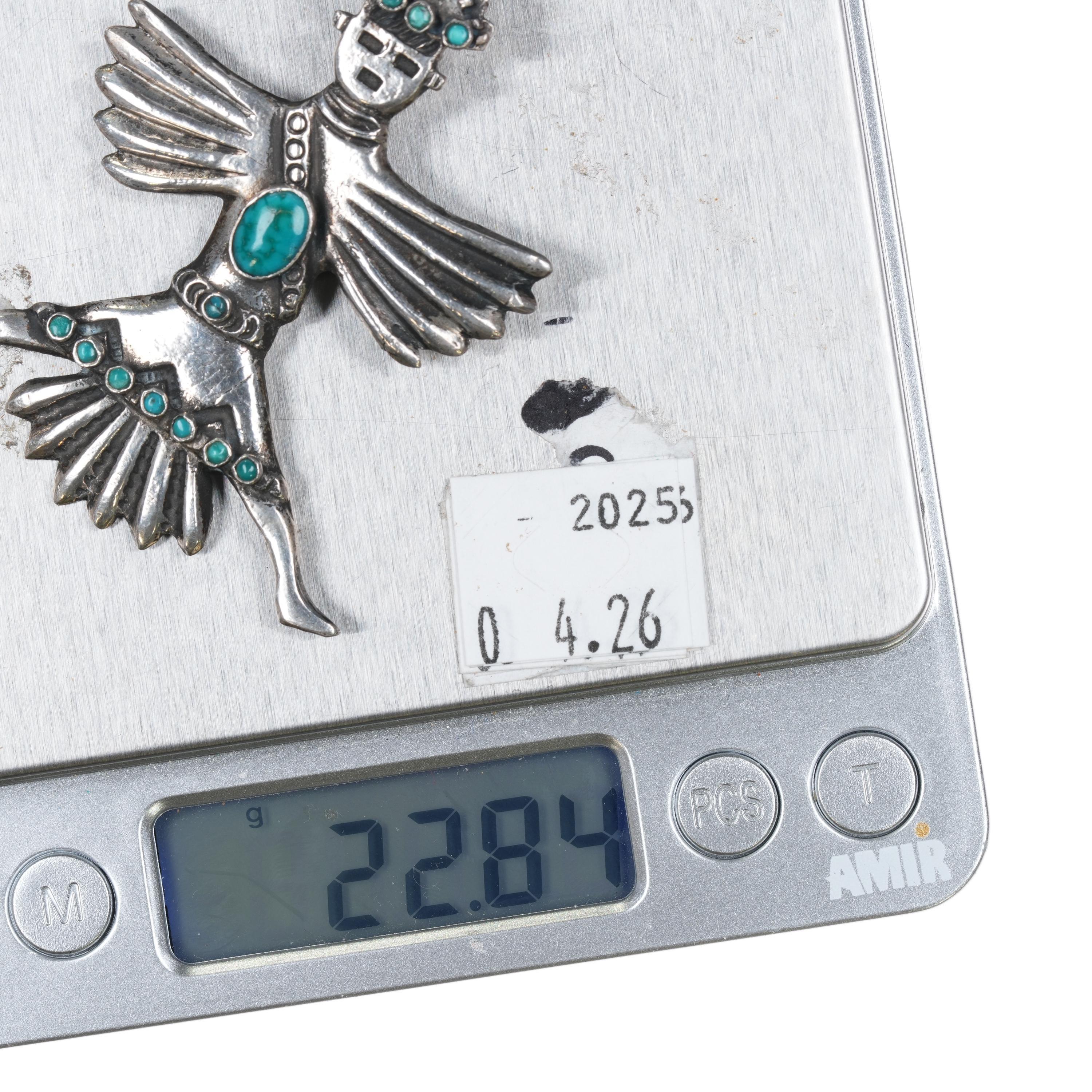 c1940‘s Horace Iule Zuni Knifewing Pin w/snake eye turquoise sterling silver. Great looking and substantial pin with no issues. Weight and measurements in pictures. Unmarked, attributed to Horace Iule, circa mid 20th century. This pin is actually significantly different to most pins attributed to Horace Iule, I have found a pin online in the sold section of a Saks Gallery in Denver, CO that I believe was made by the same hand perhaps at the same time. They attributed it to Eskiose, which is one of the most important historic Navajo Silversmiths, more often referred to as Etsitty Tsosie They dated it to c1930.. I‘m not sure. I‘m guaranteeing it to be solid silver, turquoise, mid 20th century perhaps a little older, and Native American made.