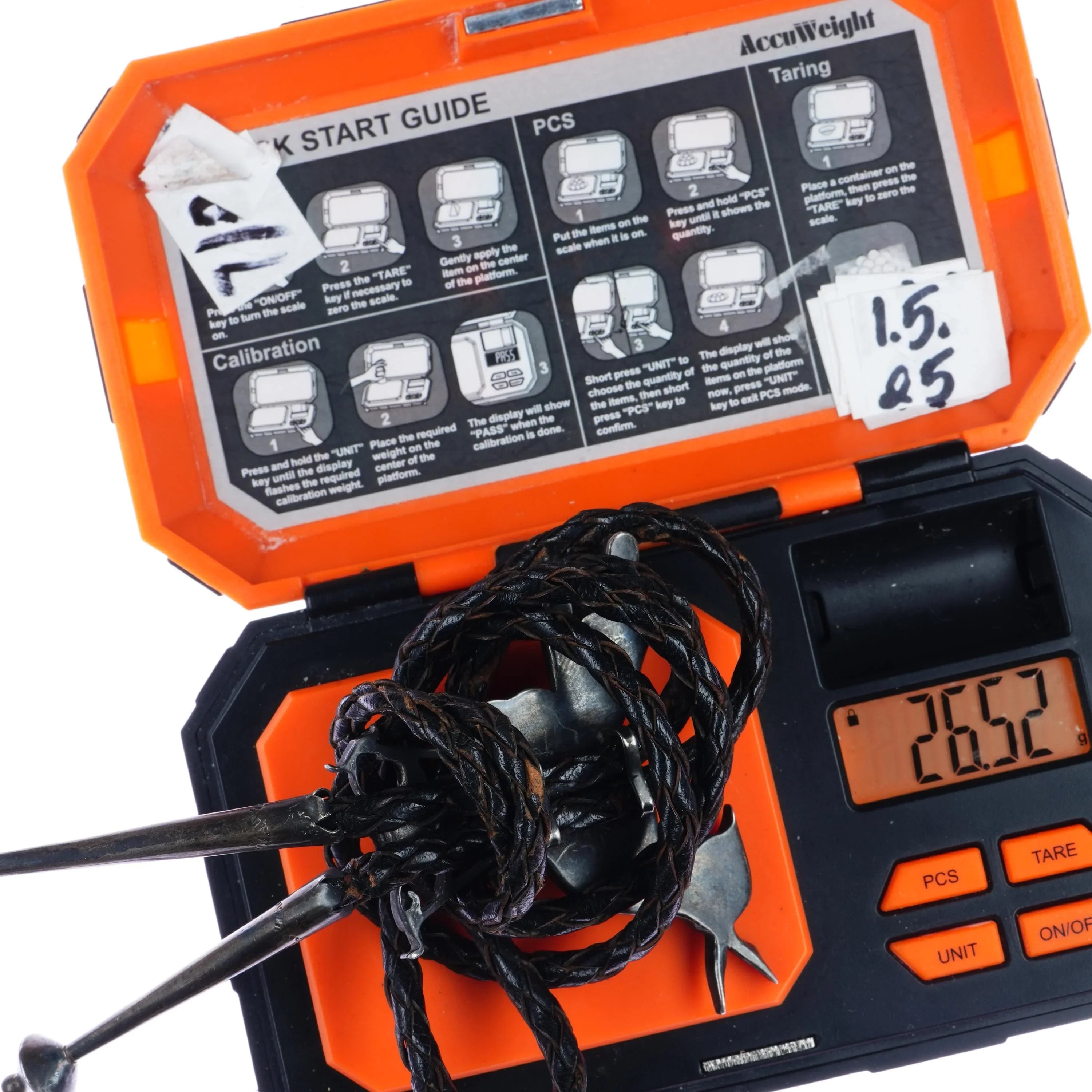 Solid sterling silver, weight and measurements in pics (scale tared out with containter, weight shown is just the bolo). Fully functional with overall attractive appearance. 37" total length.