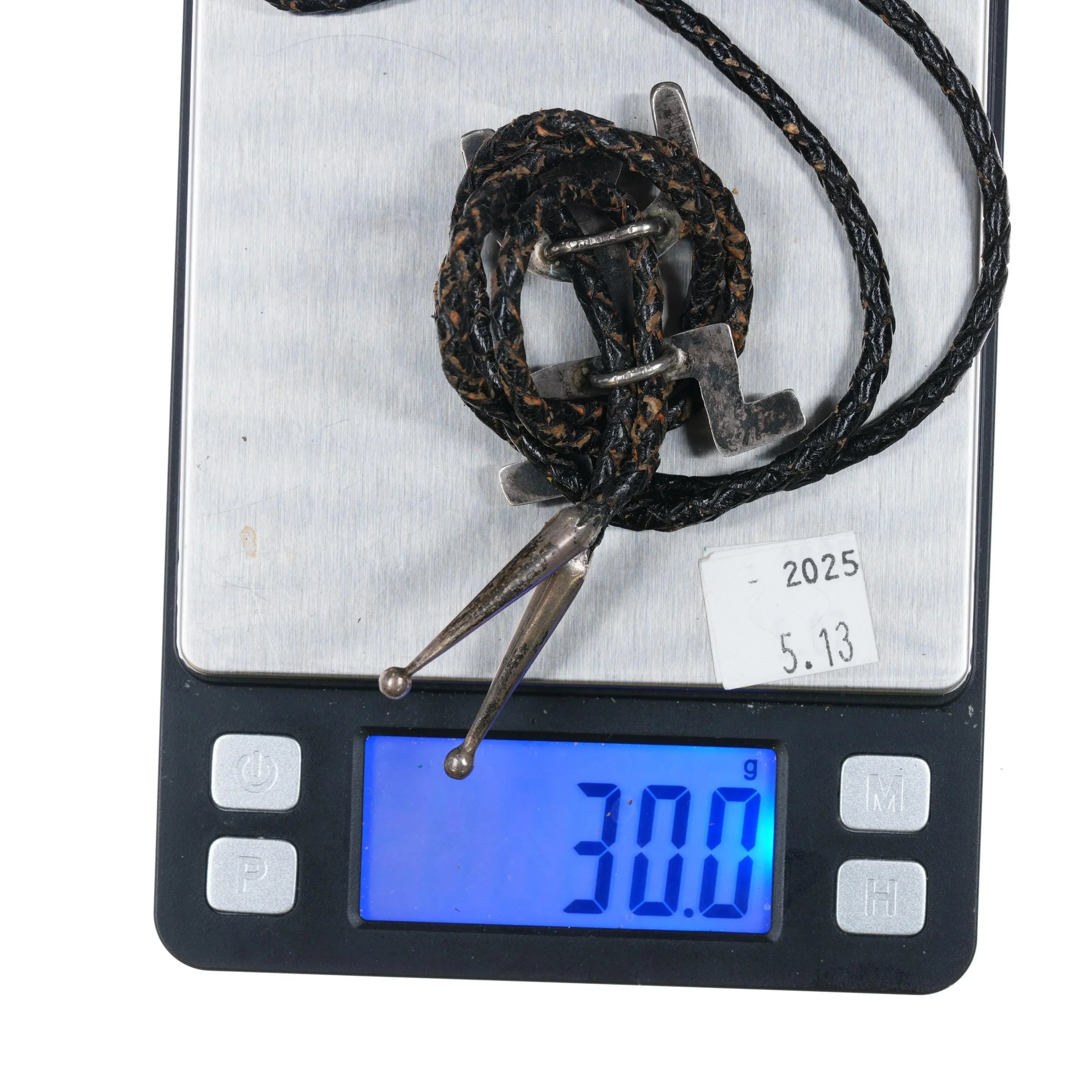 c1950 Navajo cast sterling silver bolo tie with turquoise. Solid sterling bolo slide and tips, no issues. Weight and measurements in pictures. 34" long. Overall good condition, unmarked.