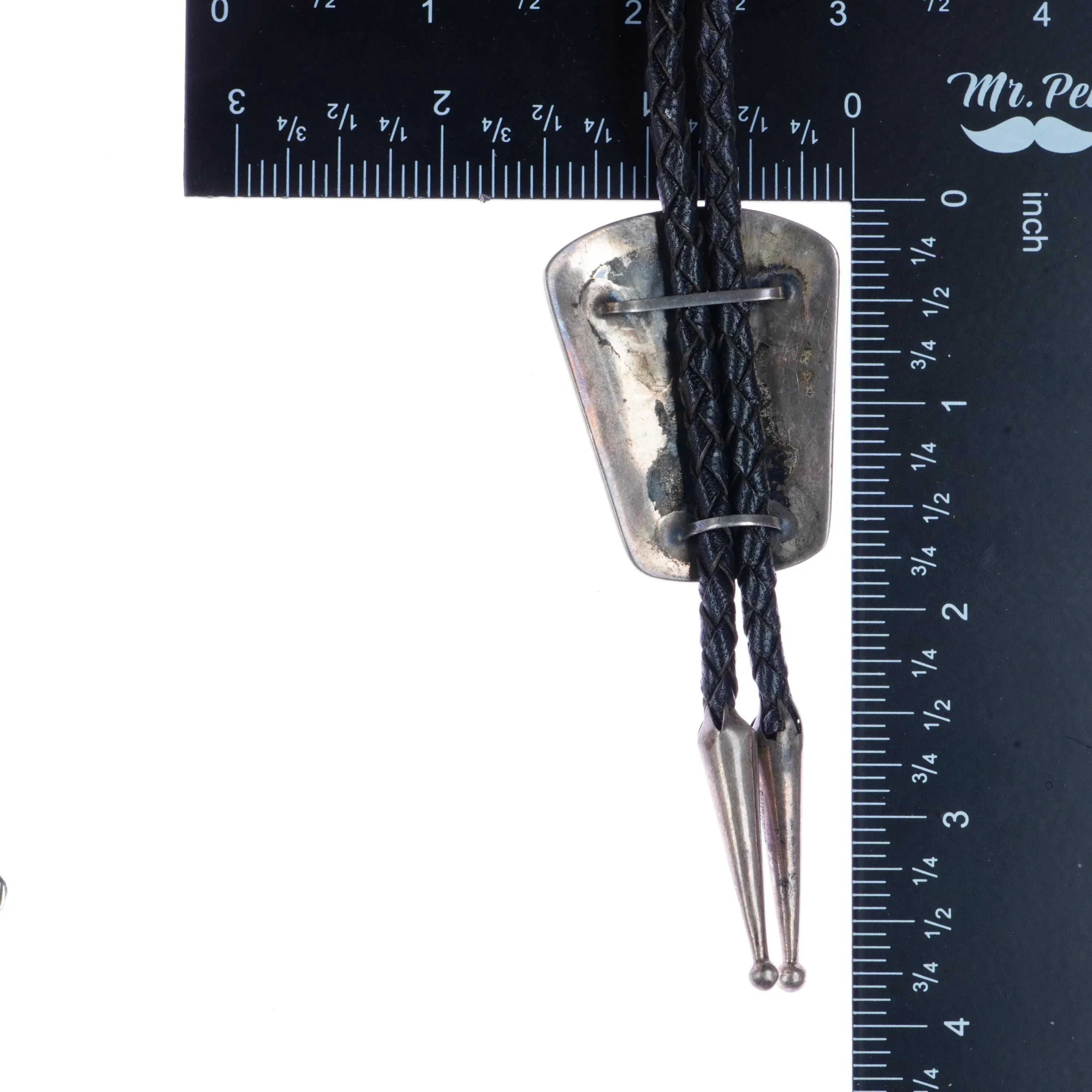 c1950 Navajo silver rainbow man dancer bolo tie. Solid sterling silver, weight and measurements in pics (scale tared out with containter, weight shown is just the bolo). Fully functional with overall attractive appearance. 35" total length. No detectable markings. Sterling slide and tips.