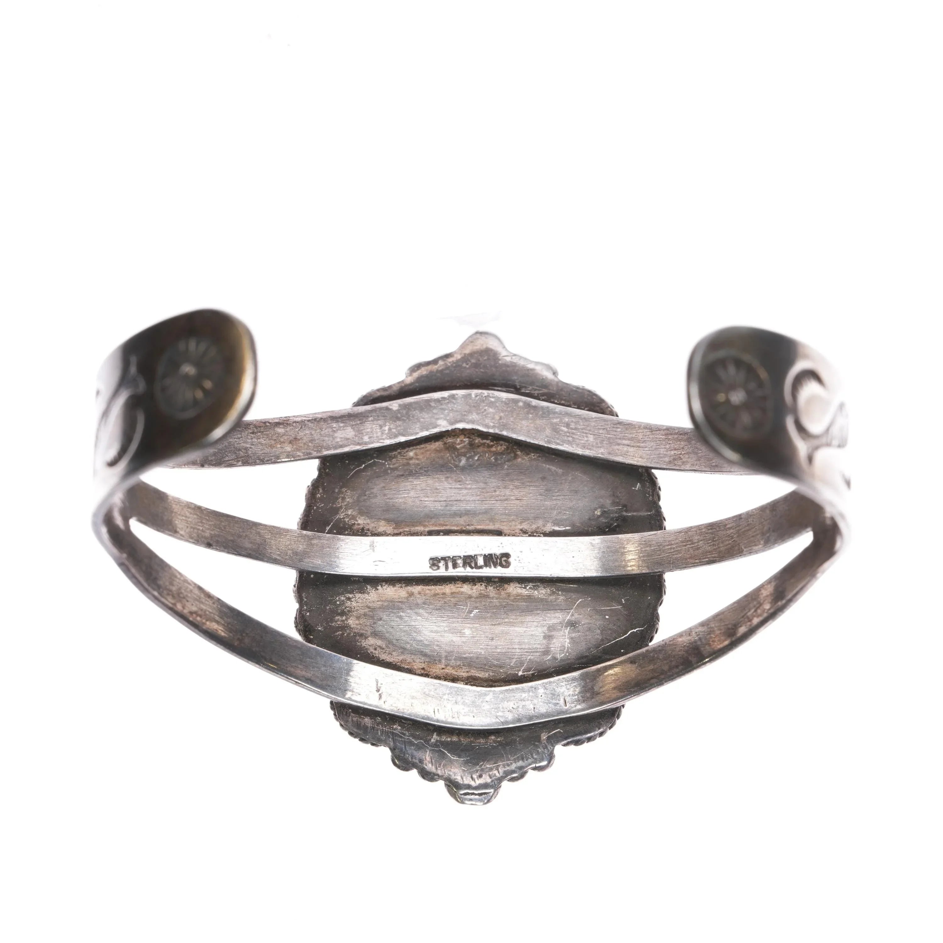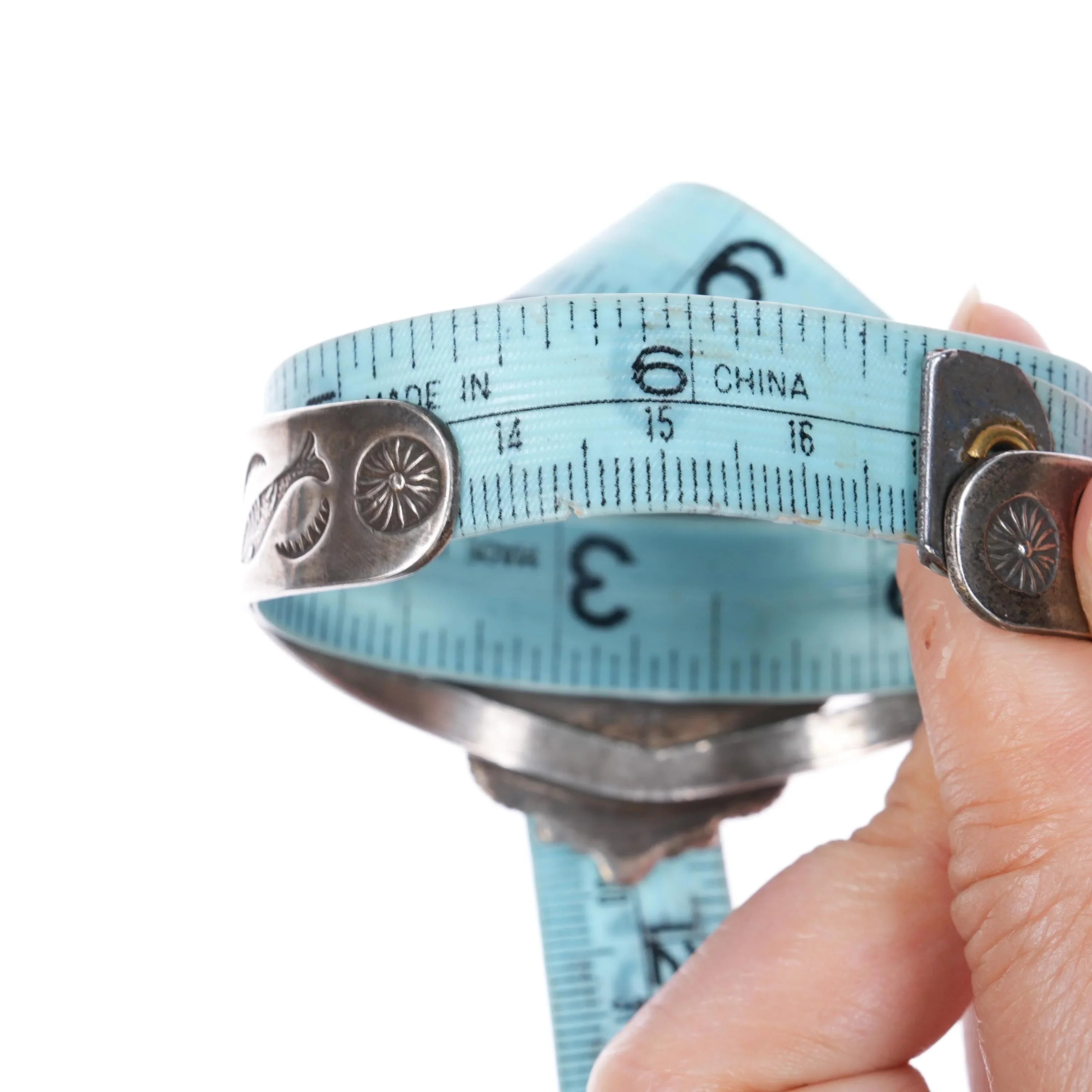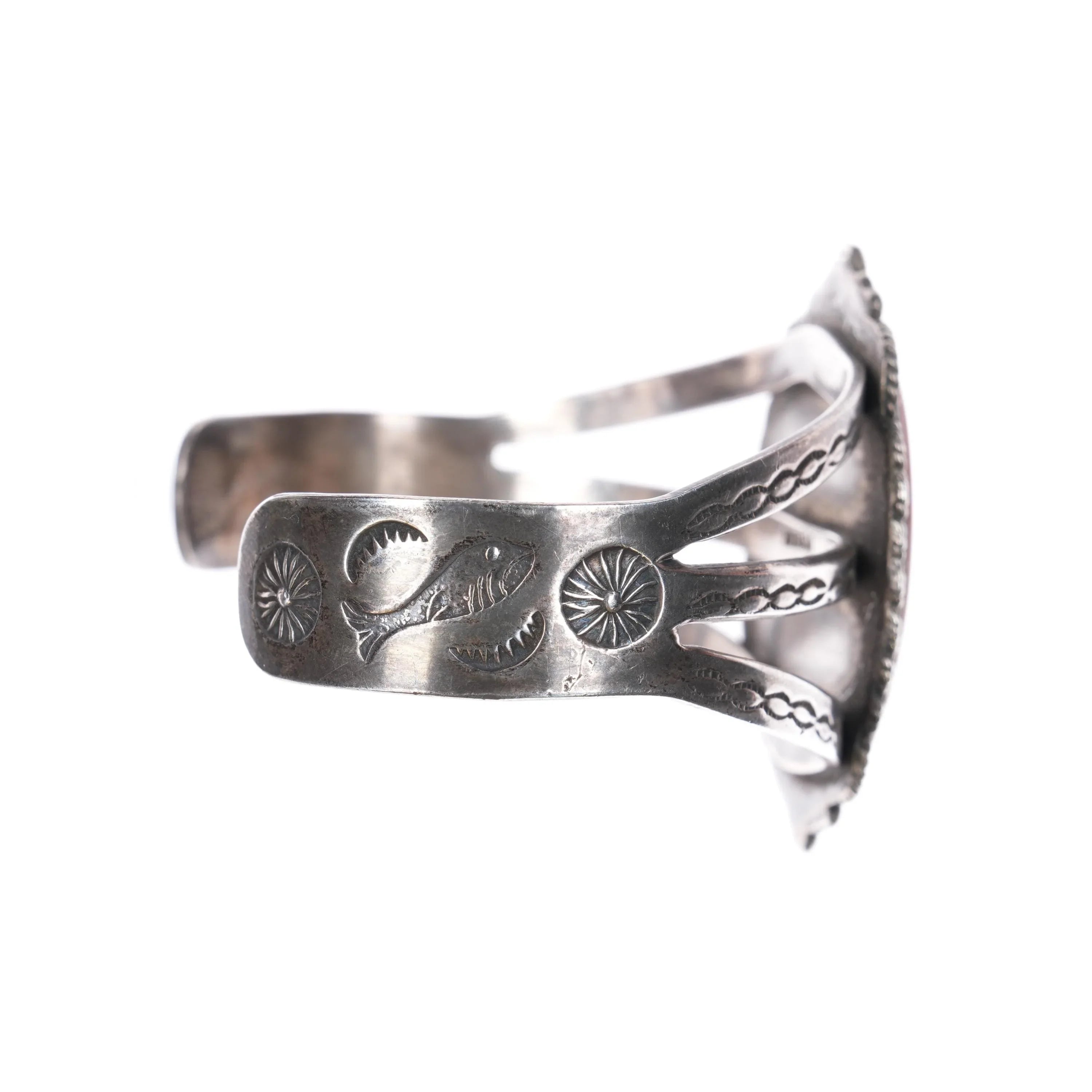 6.6" c1950 Navajo sterling silver petrified wood fish stamping cuff bracelet