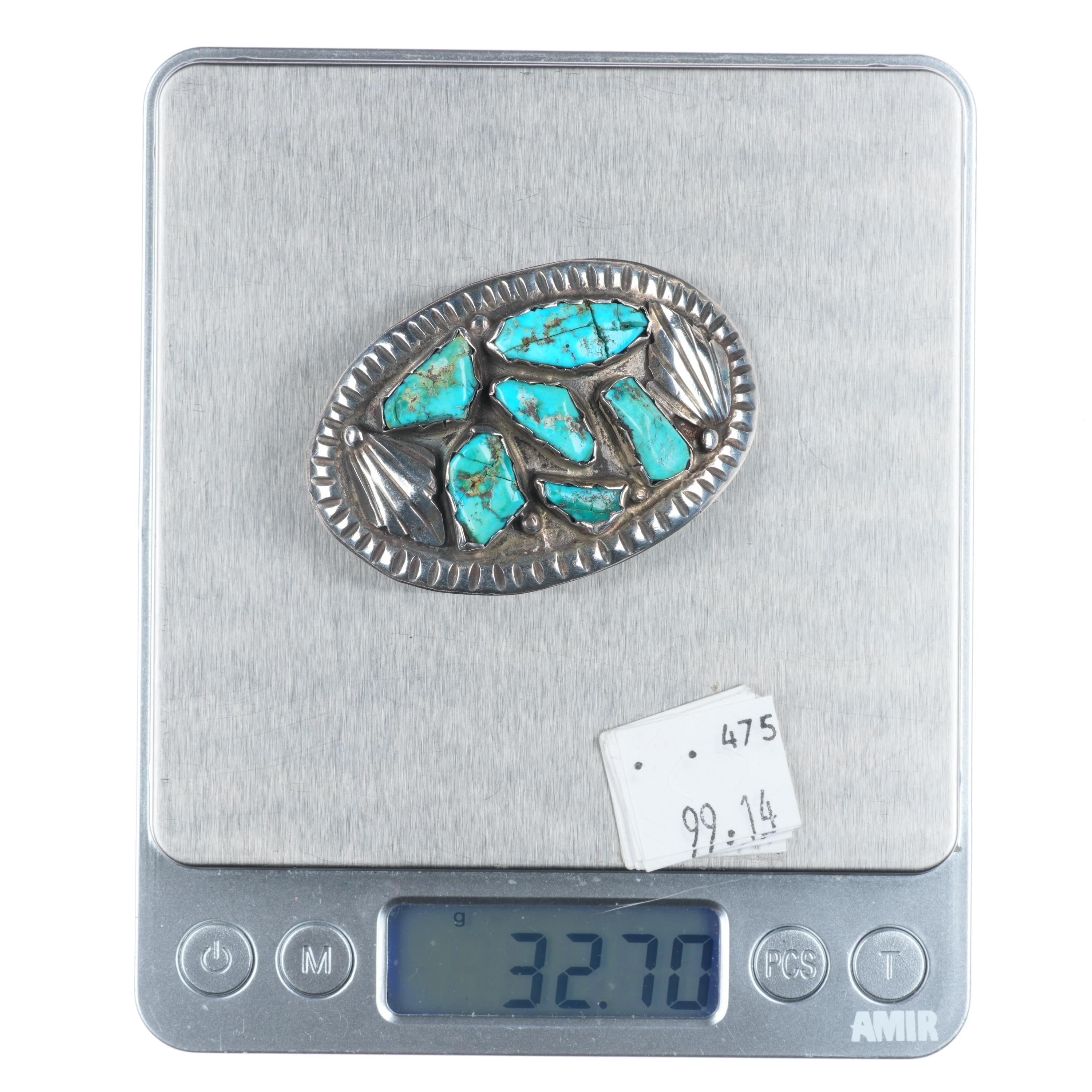 c1950's Small vintage Zuni sterling silver turquoise nugget cluster belt buckle