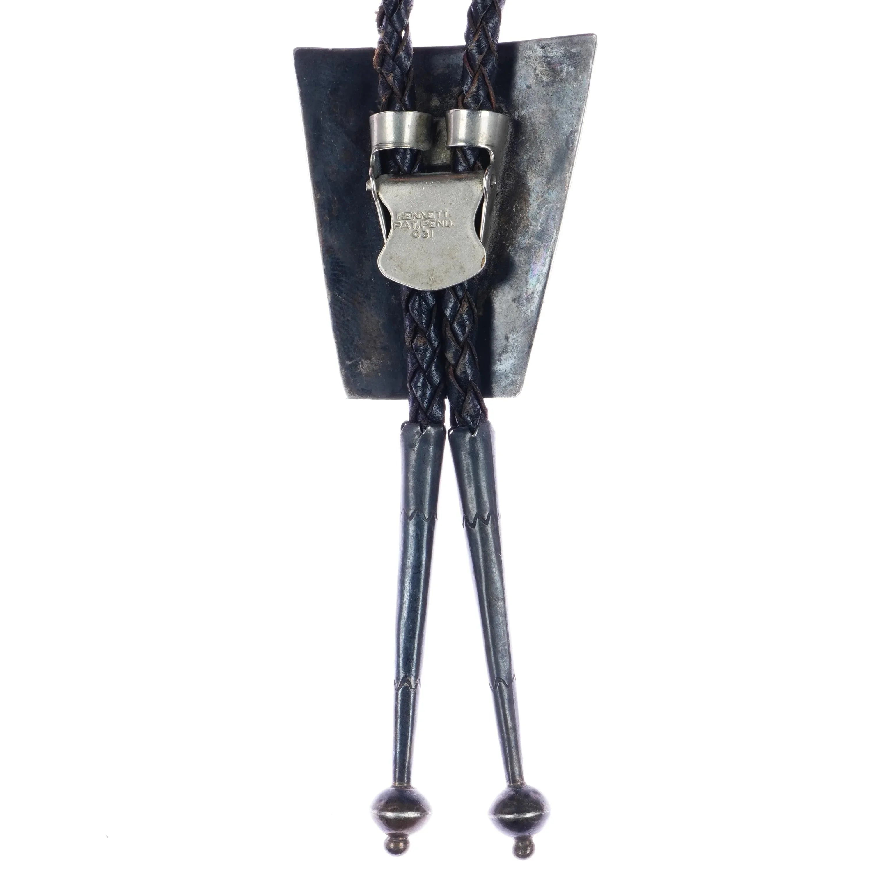 c1960 c-31 Alice Leekya Homer Zuni sterling turquoise fishscale inlay bolo tie, unmarked - attributed.