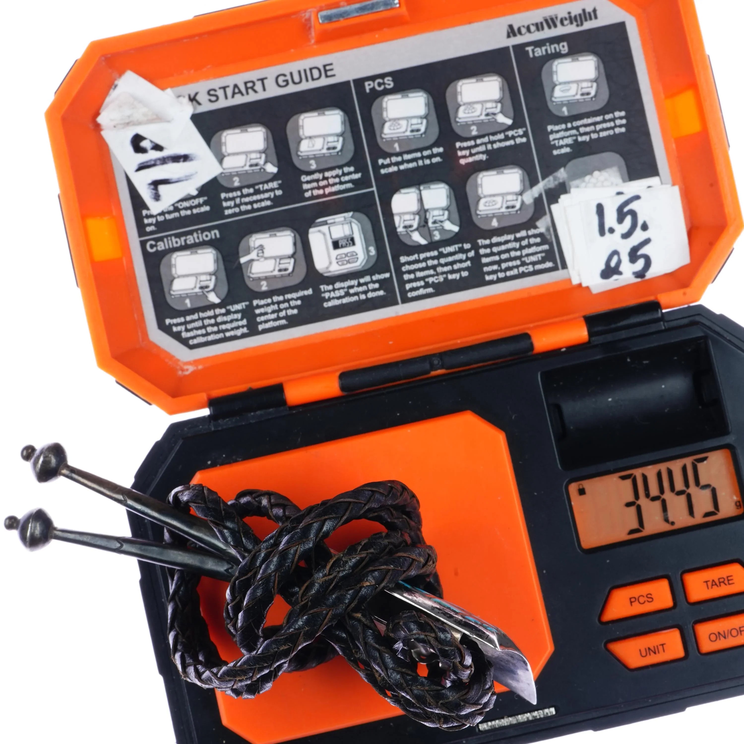 Solid sterling silver, weight and measurements in pics (scale tared out with containter, weight shown is just the bolo). Fully functional with overall attractive appearance. 40" total length. No detectable markings. Cord is very old but intact and should stay that way with careful use.
