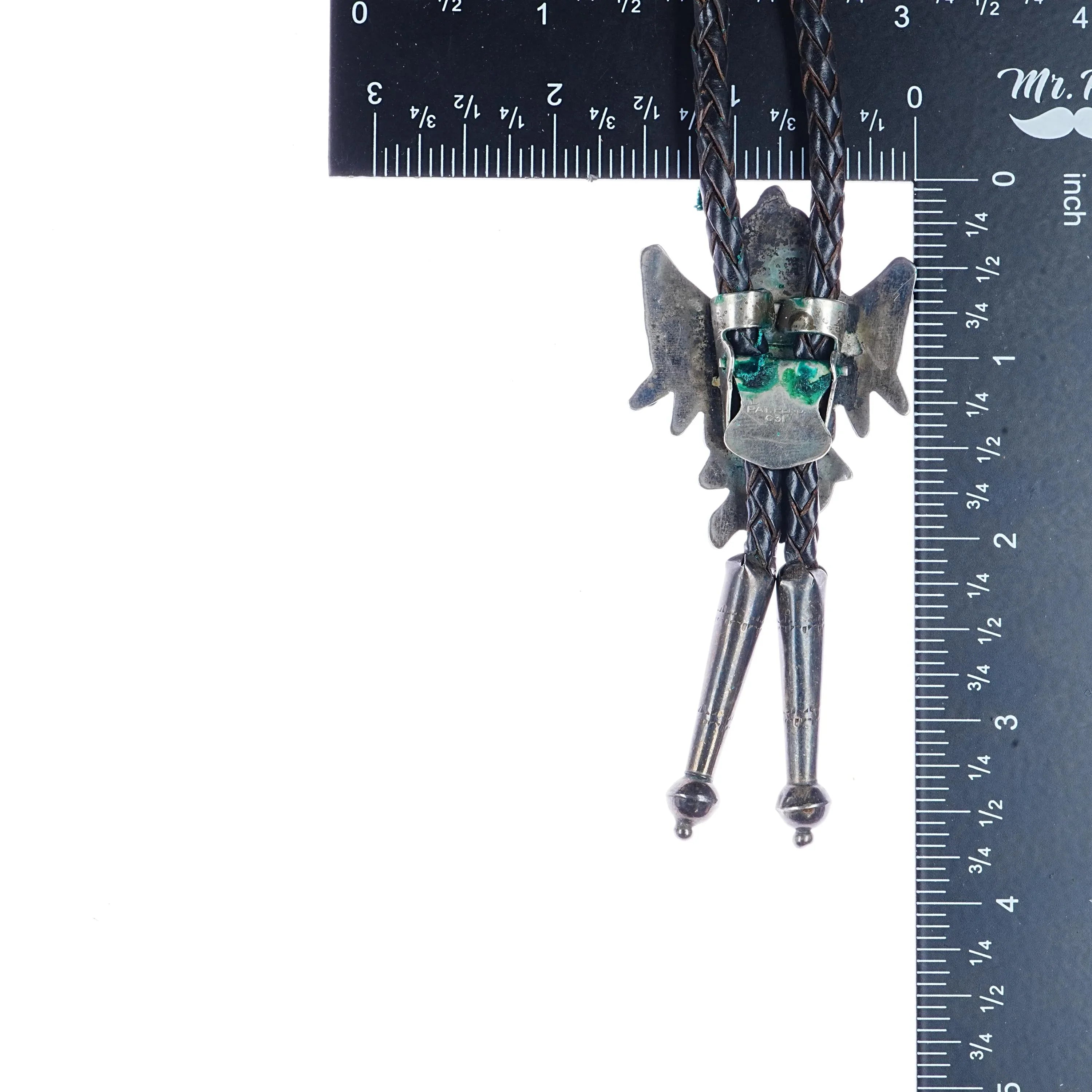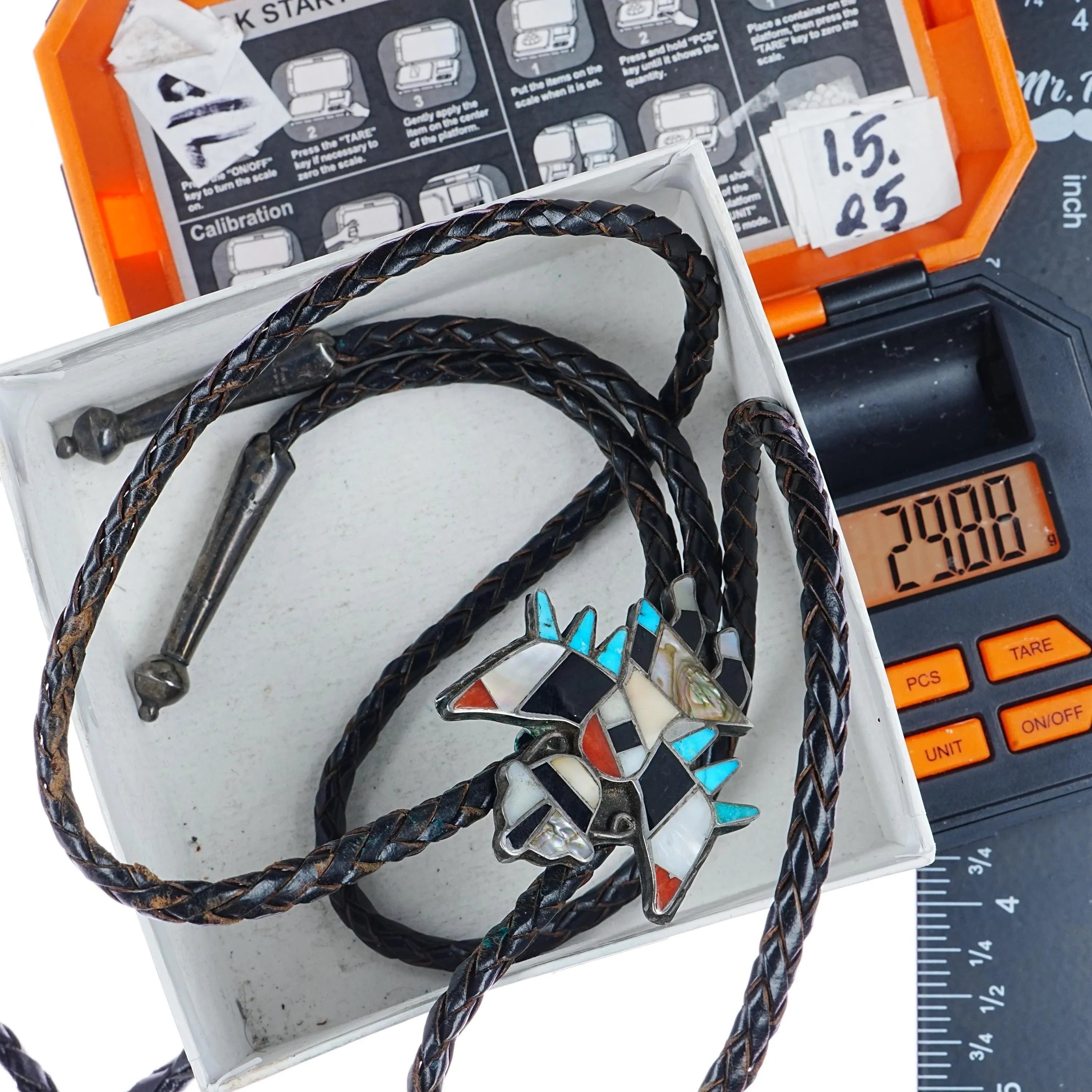 c1960 c-31 Zuni inlay sterling knifewing figural bolo tie. Solid sterling silver, weight and measurements in pics (scale tared out with containter, weight shown is just the bolo). Fully functional with overall attractive appearance. 37" total length. Sterling slide and tips. Apparently unmarked.