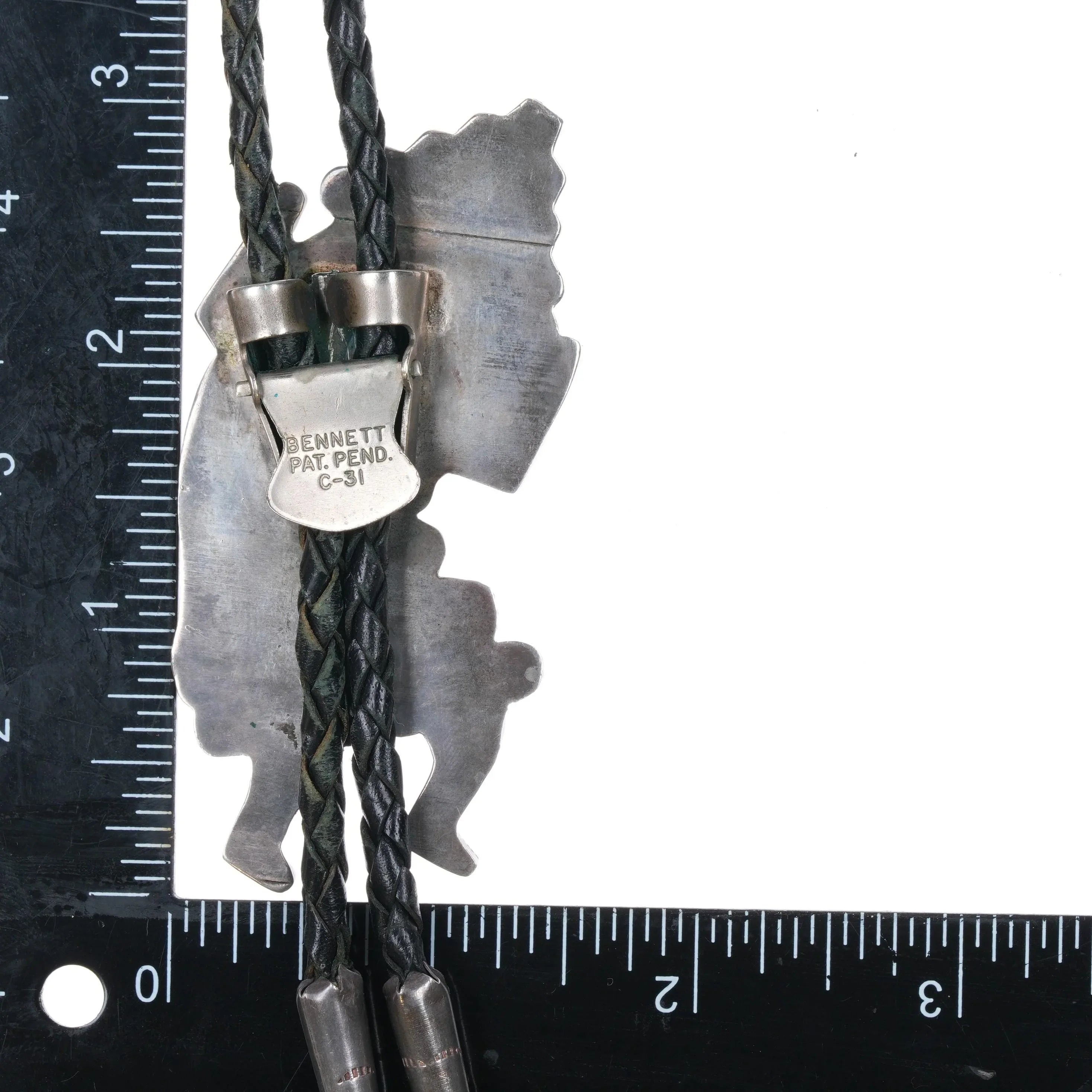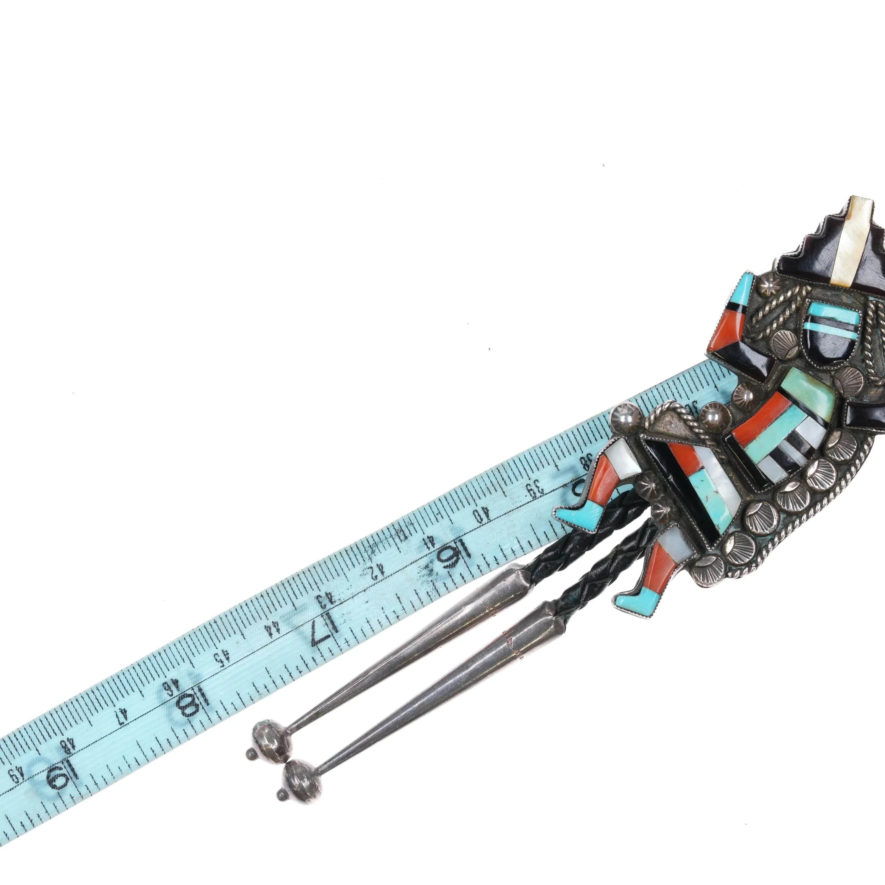 c1960 c-31 Zuni Rainbow Man Inlay intricately stamped sterling silver bolo tie