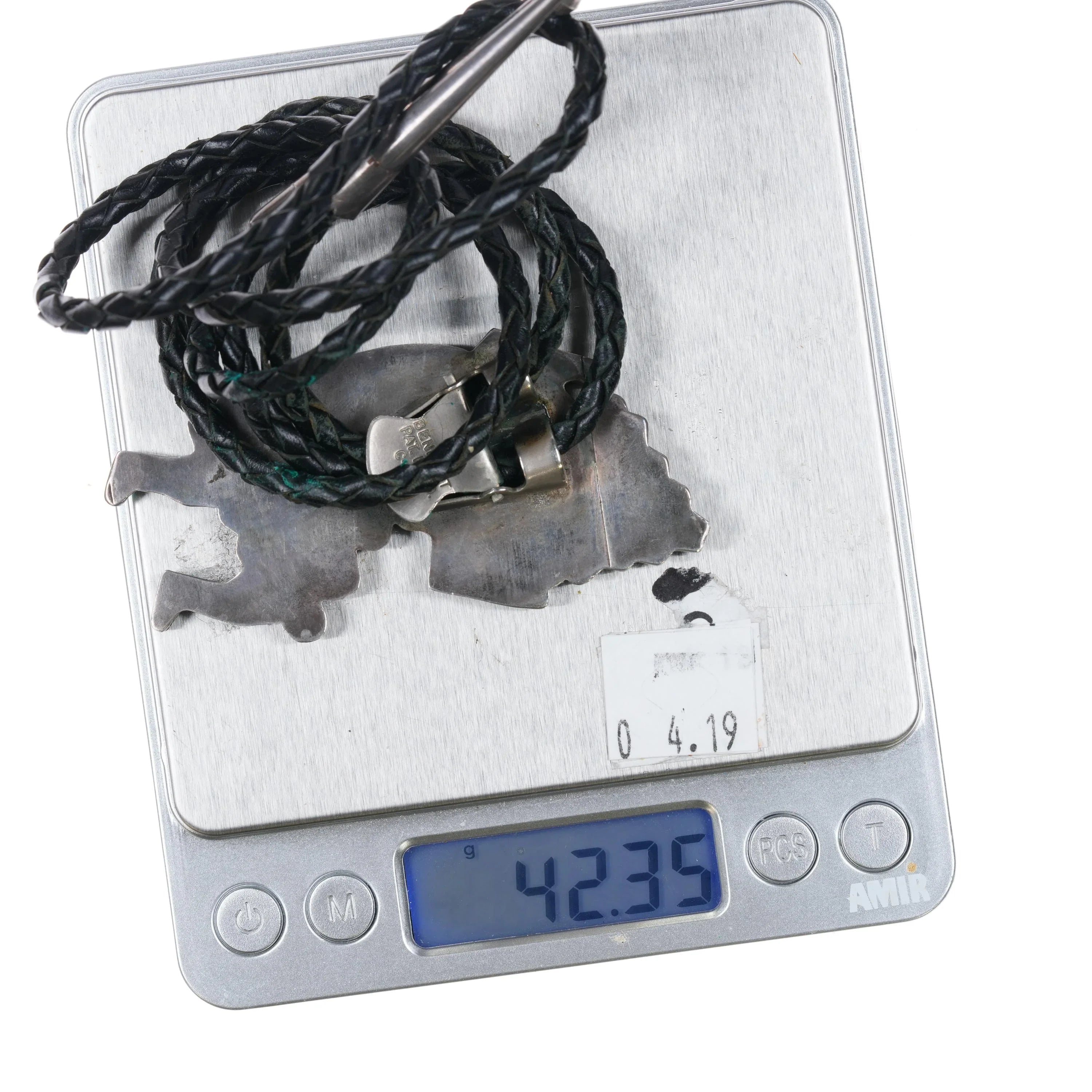 c1960 c-31 Zuni Rainbow Man Inlay intricately stamped sterling silver bolo tie. Solid sterling silver slide and tips. Weight and measurements in pics. 36" long. Expected wear with no apparent damage, and no apparent markings. Weight shown is just the entire bolo, if there is a tray pictured it will be tared out of course.