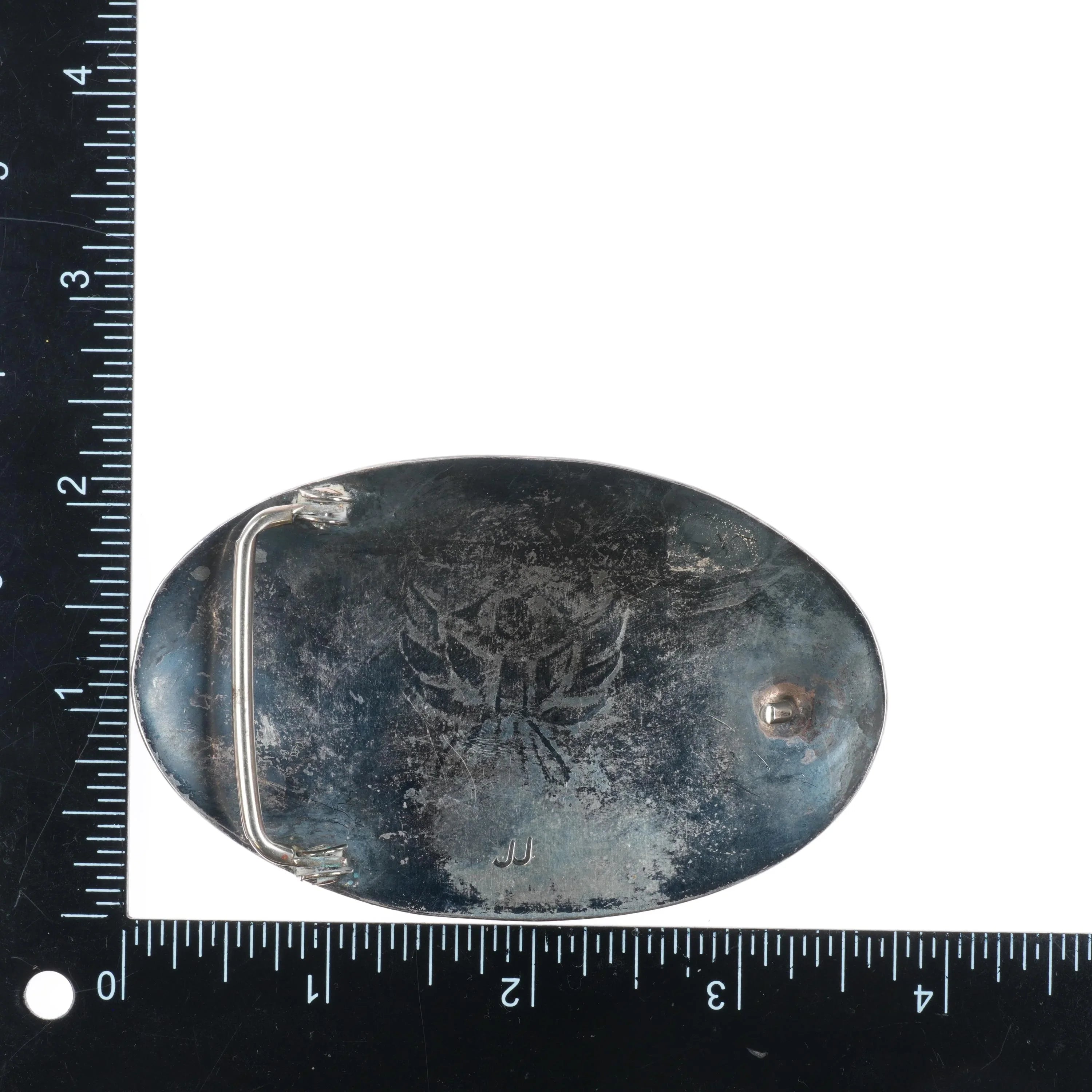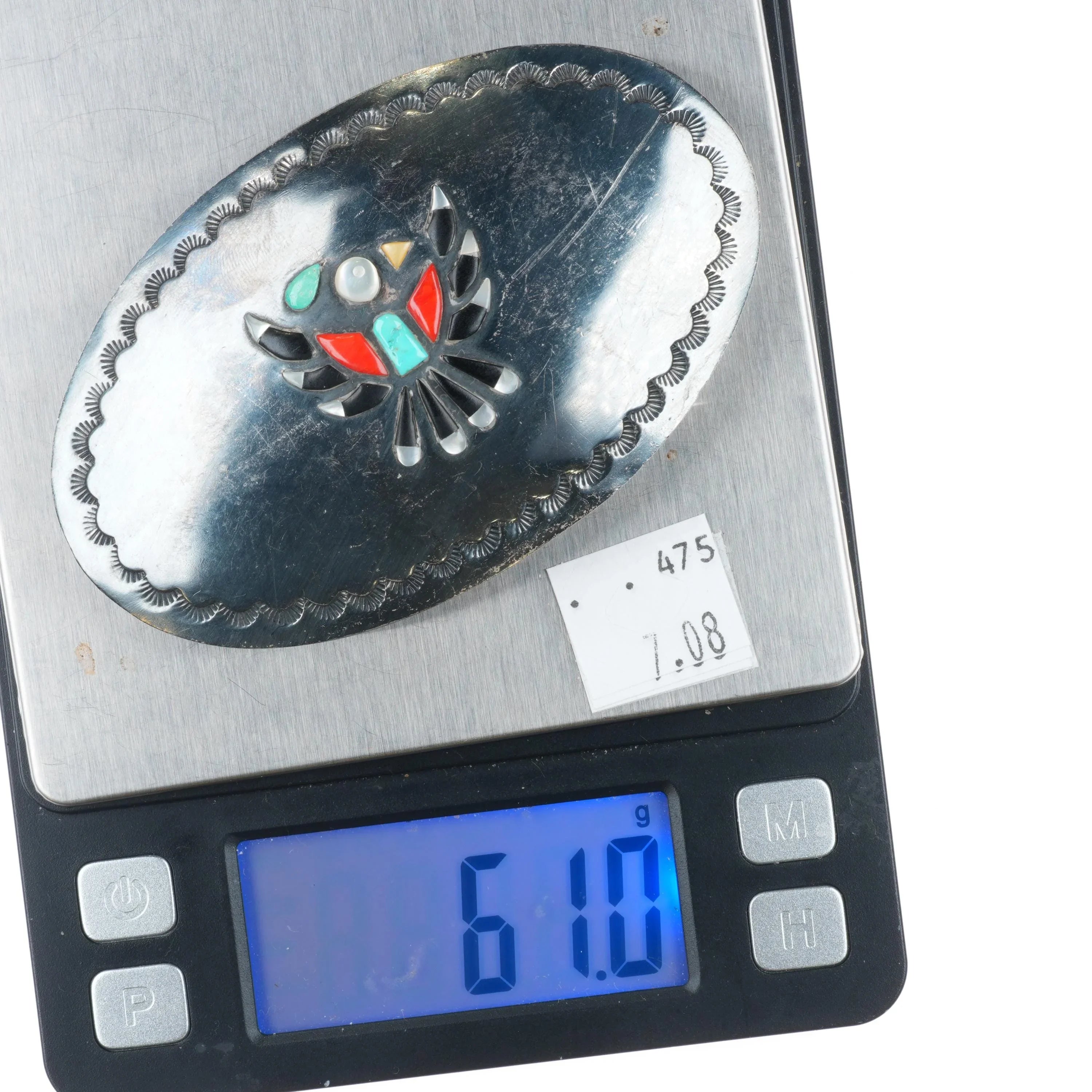 c1960 JJ Zuni sterling silver thunderbird raised channel inlay belt buckle. Fits up to a 1.5" belt. Tested and guaranteed solid sterling silver with weight and measurements in pictures. Fully functional. Stones are secure with no damage. All items will likely have some expected wear, the older they are the more wear they should have. Circa third quarter of the 20th century.