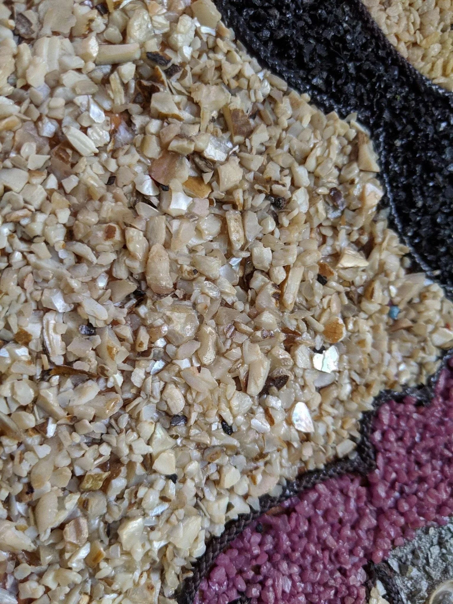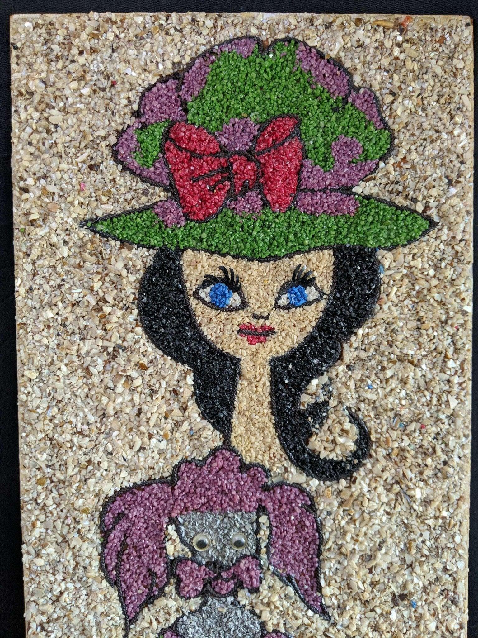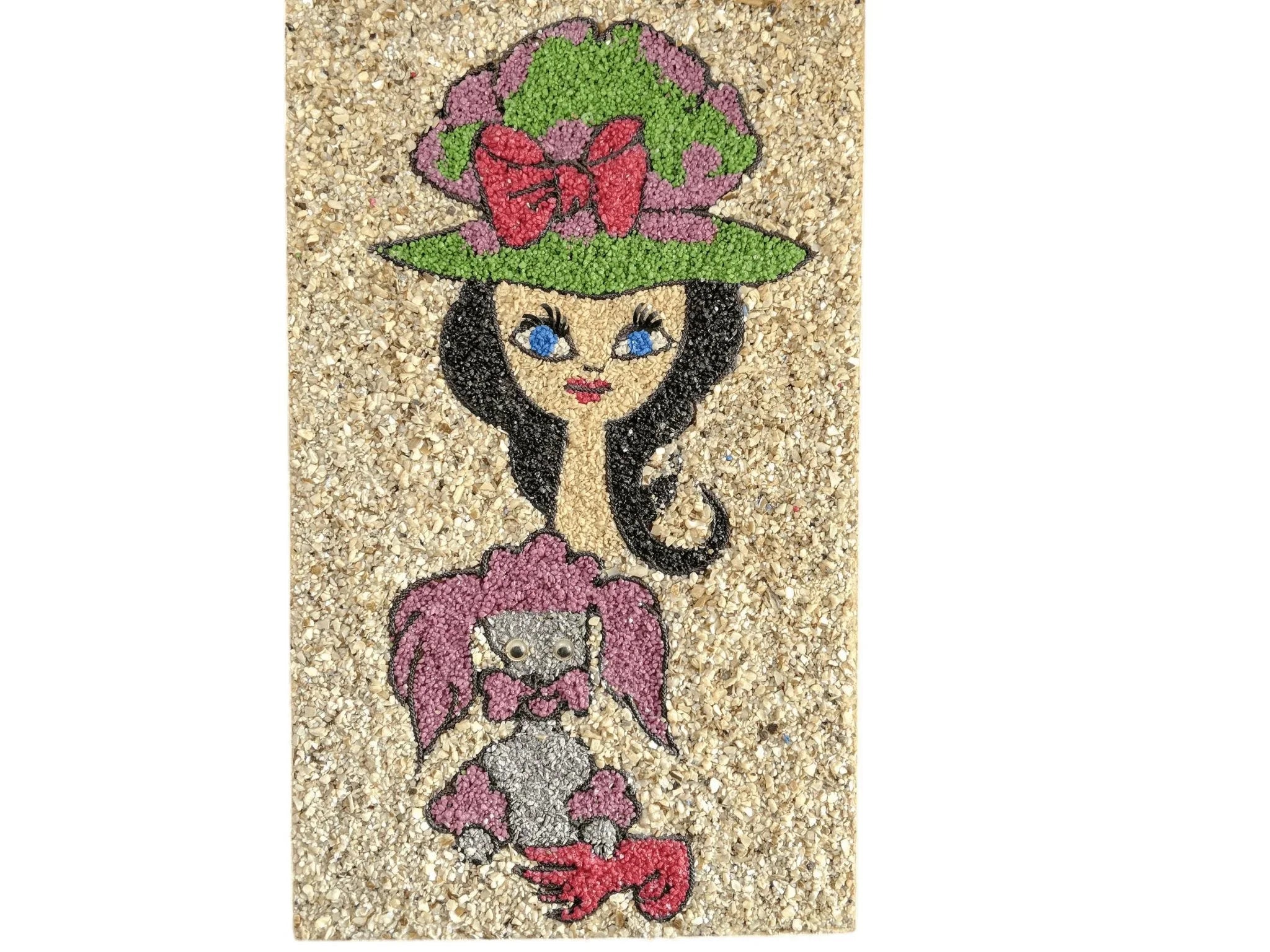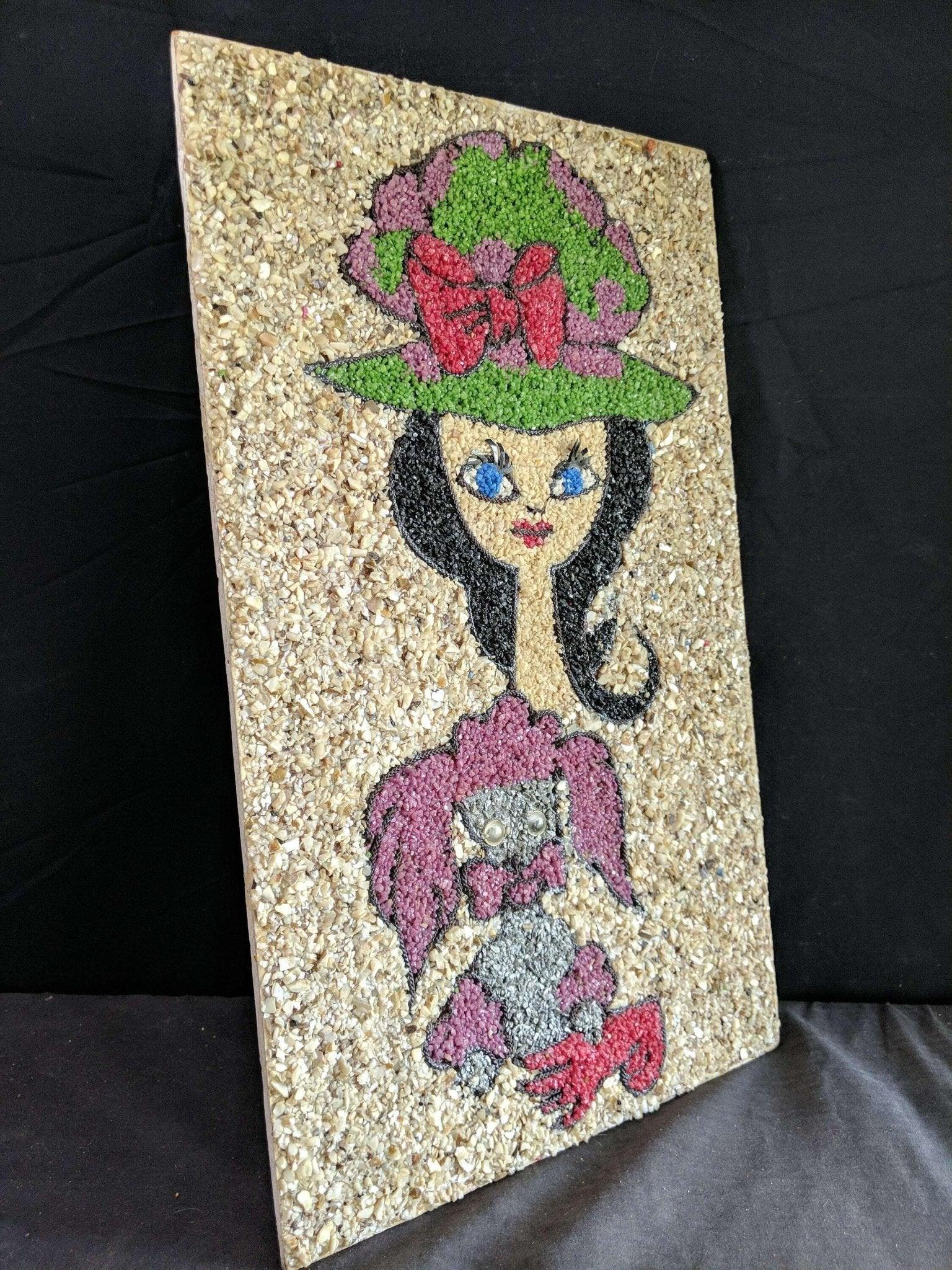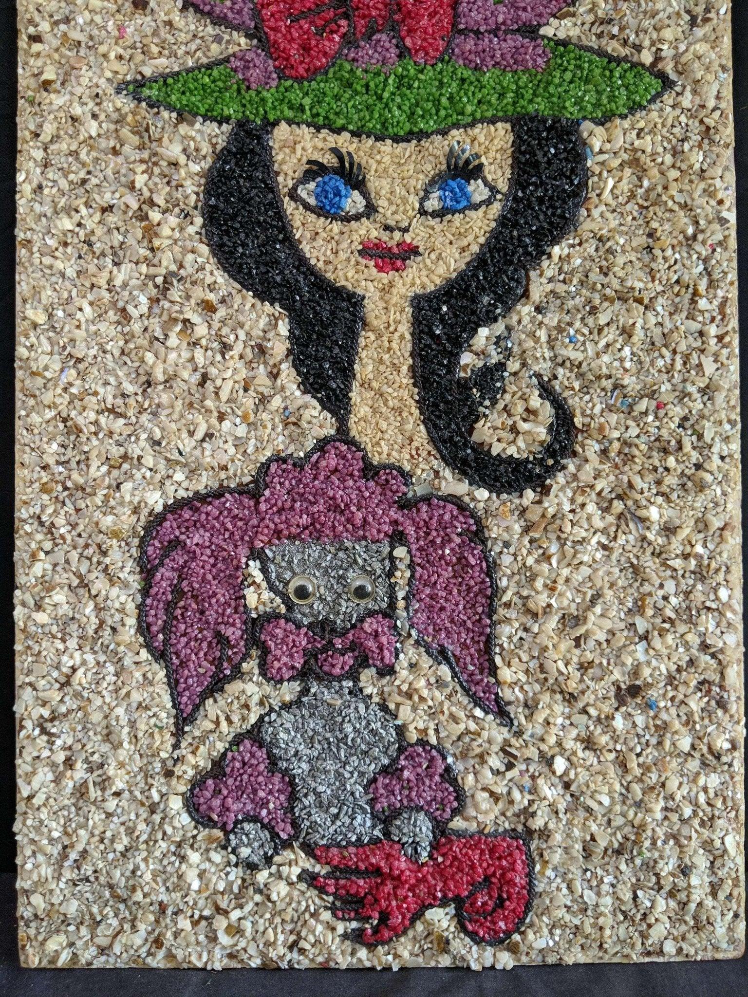 c1960 Mid Century Gravel Art Mädchen mit Pudel. 12" x 20". Der äußere Teil, der nicht gefärbt ist, besteht ausschließlich aus zerkleinerten Muscheln. Ihr scheinen ein paar Wimpern zu fehlen, das ist das einzige Problem, das ich erkennen kann. Diese Steine ​​haften wirklich gut, sie sind etwa 50 Jahre alt.