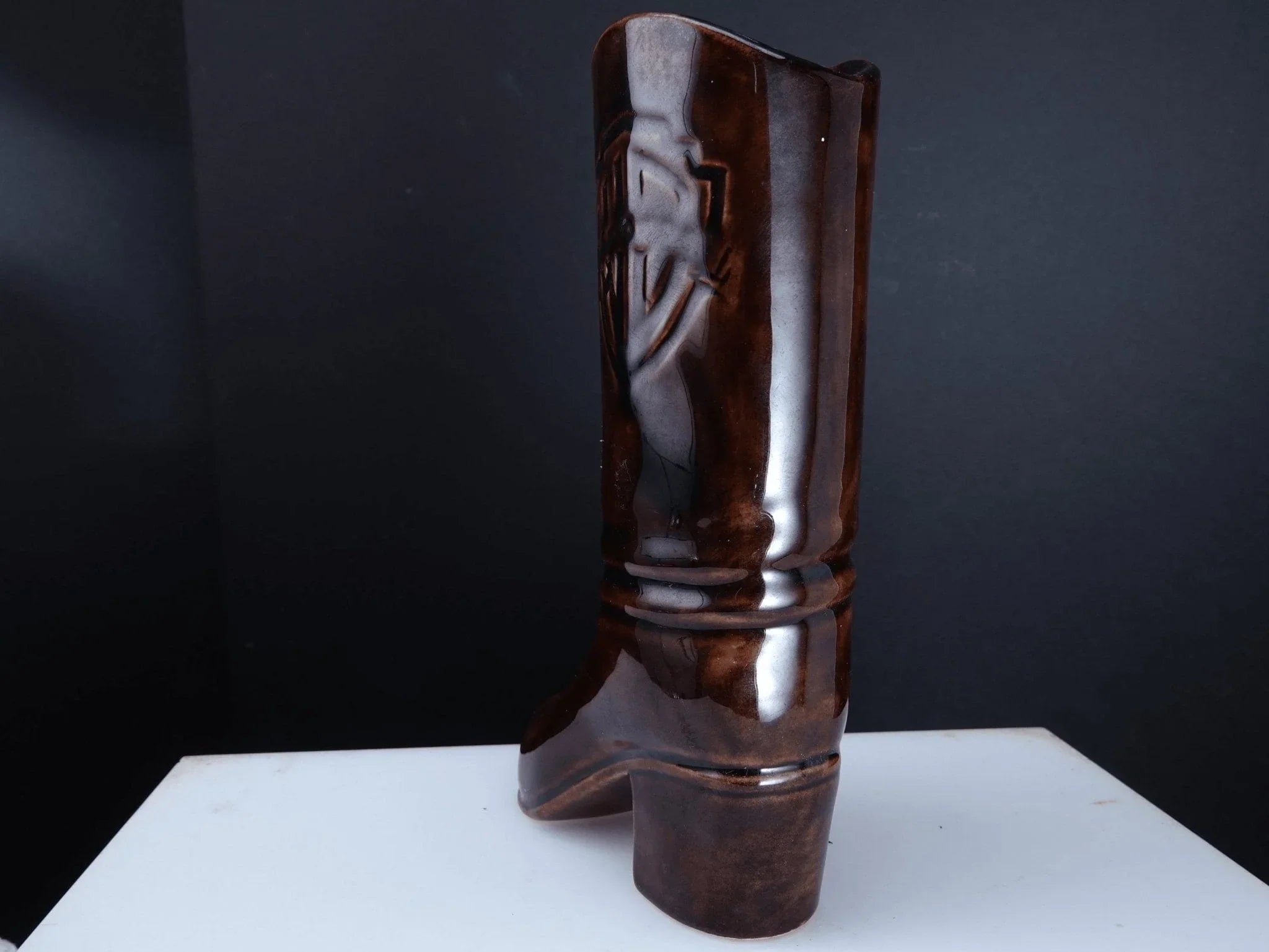 c1960 Seltener früher Werbe-Cowboystiefel von Warner Brothers Records California Pottery. 6 3/8" hoch x 4,25" lang. Äußerst selten, wahrscheinlich einer der ersten Werbeartikel von Warner Brothers Records, als sie 1958 zum ersten Mal auf den Markt kamen, wenn überhaupt, nicht viel später. Aus dem Nachlass von Tom Middleton (1953–2020). Keine Risse, Chips oder Restaurierungen.
