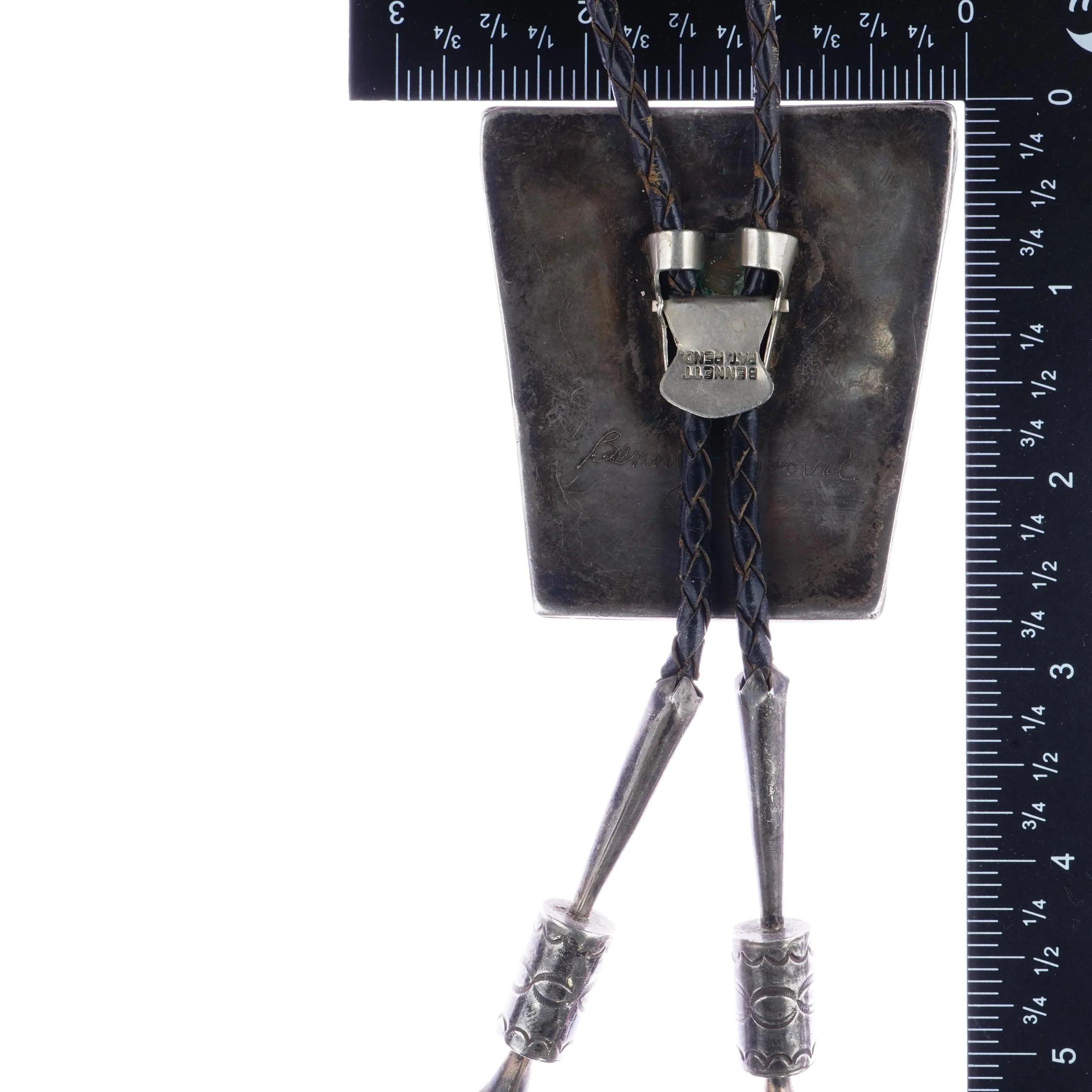 c1970 Large Benny Sandoval Navajo spiderweb turquoise cluster bolo tie fancy tip. Solid sterling, weight and measurements in pics (scale tared out with containter, weight shown is just the bolo). No damage, sterling tips and bolo slide with base metal clips on back. Hallmarked as shown, signed Benny Sandoval. Stones are either #8 Mine or Red Web Kingman, very high grade Natural American Turquoise. Tips out of this world. 40" total length.