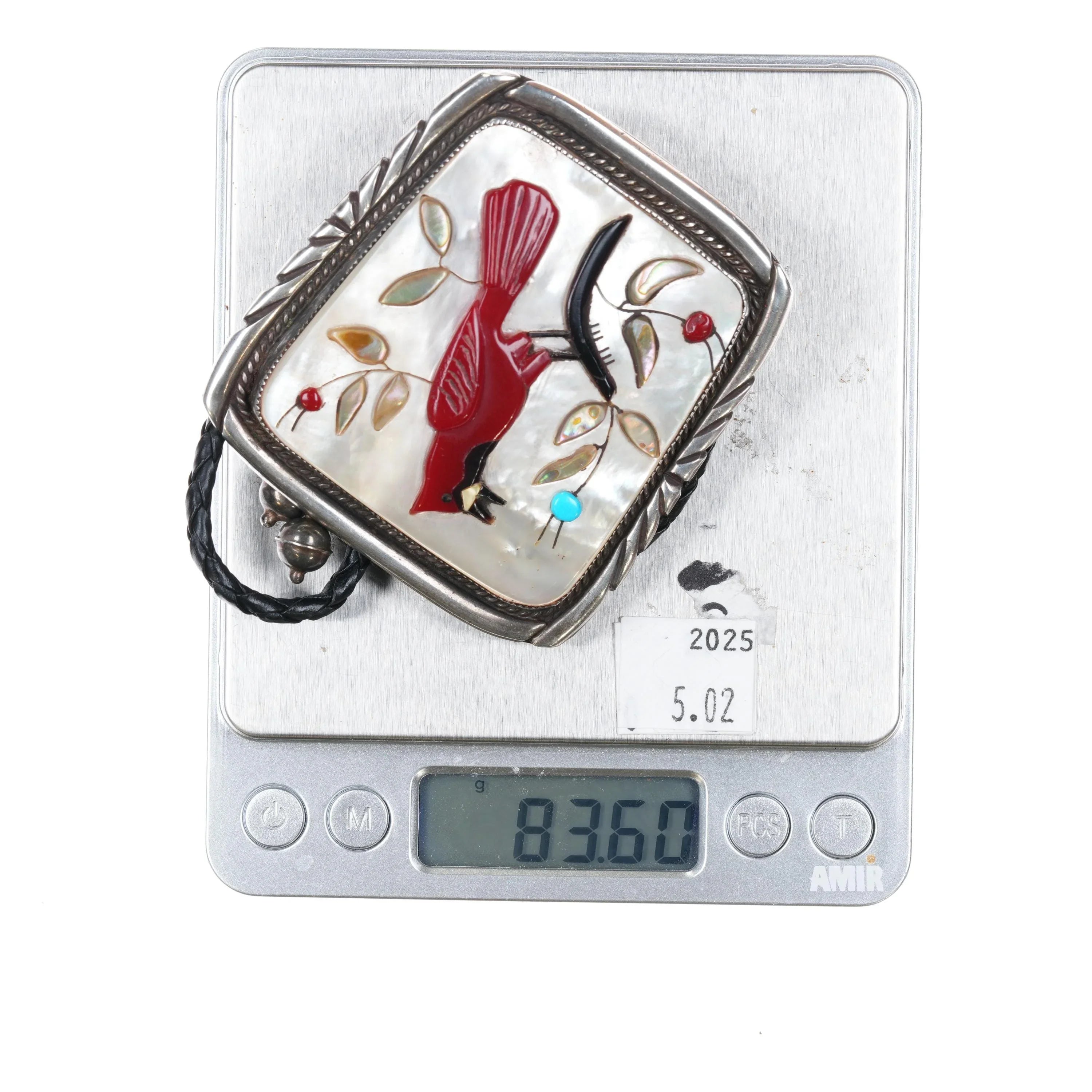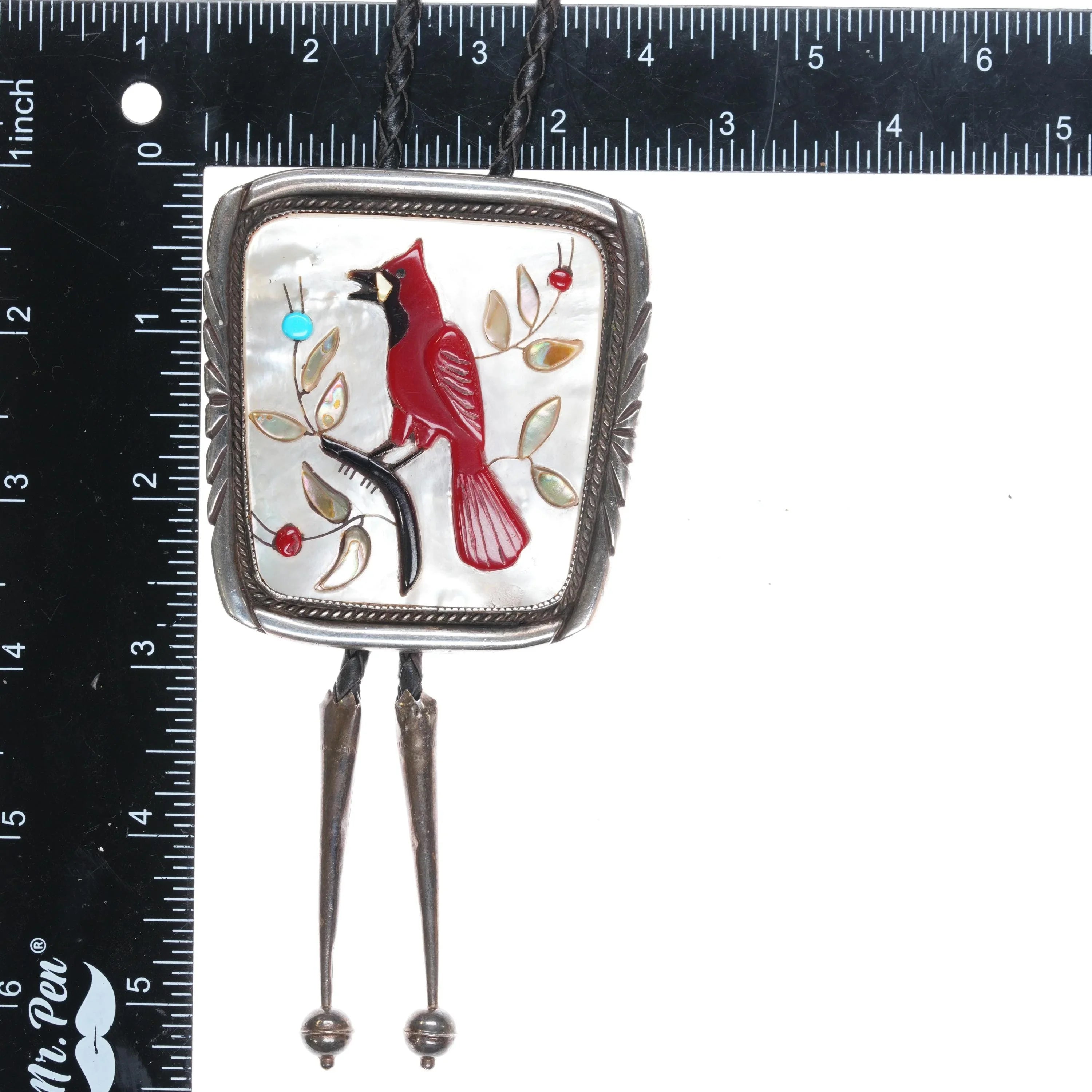 c1970 Large Tom Cowboy Zuni sterling cardinal redbird inlay bolo tie