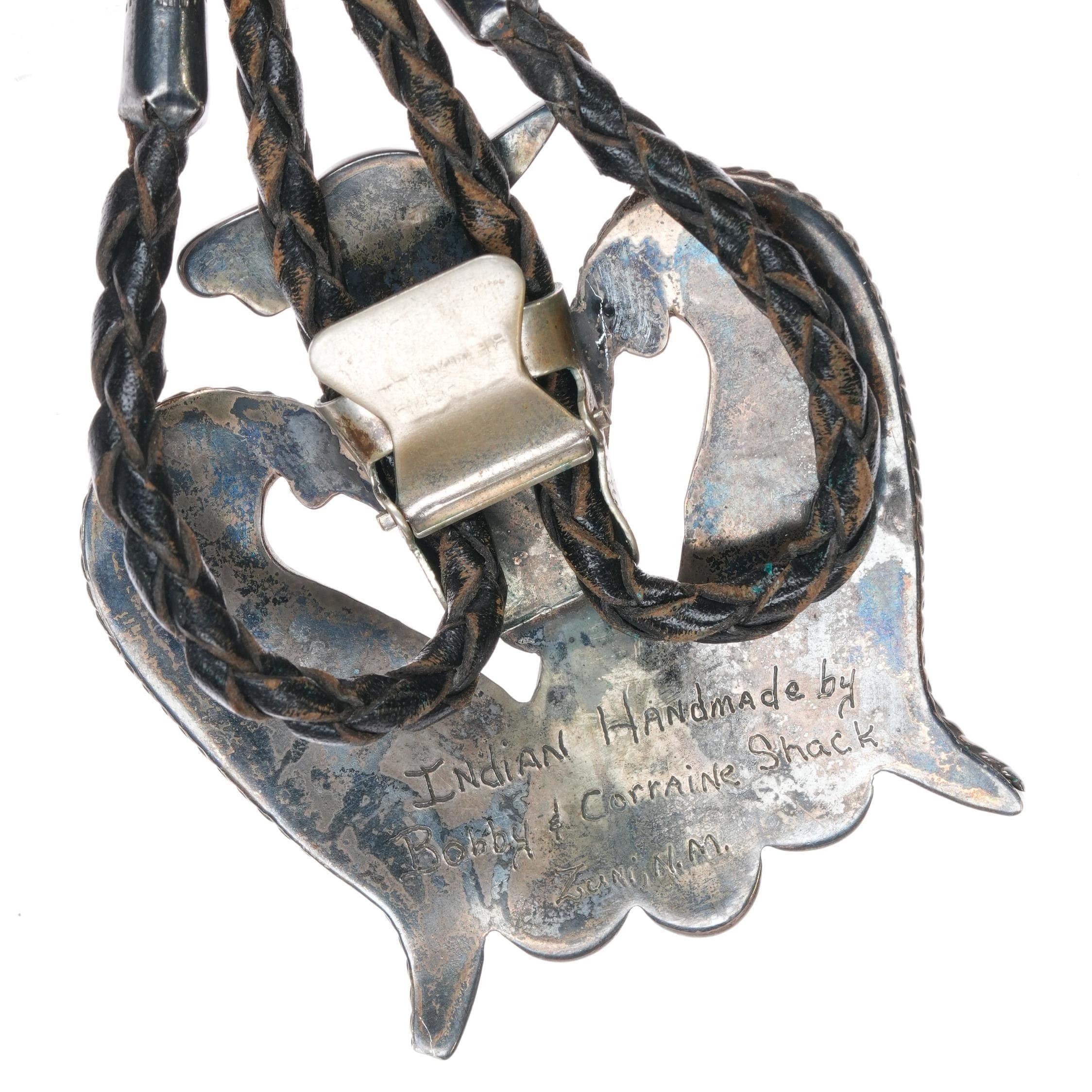 Hand crafted by Bobby and Corraine Shack. They have been making jewelry together for many years and are best known for their mosaic inlay Thunderbirds and hummingbirds that are now coveted by collectors. Their work is published in Zuni: The Art and The People, Vol. 2, by Barbara and Ed Bell, 1975.